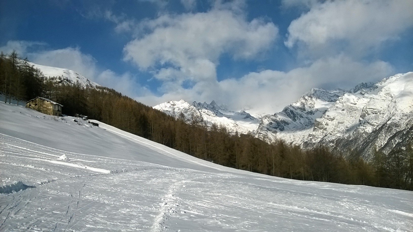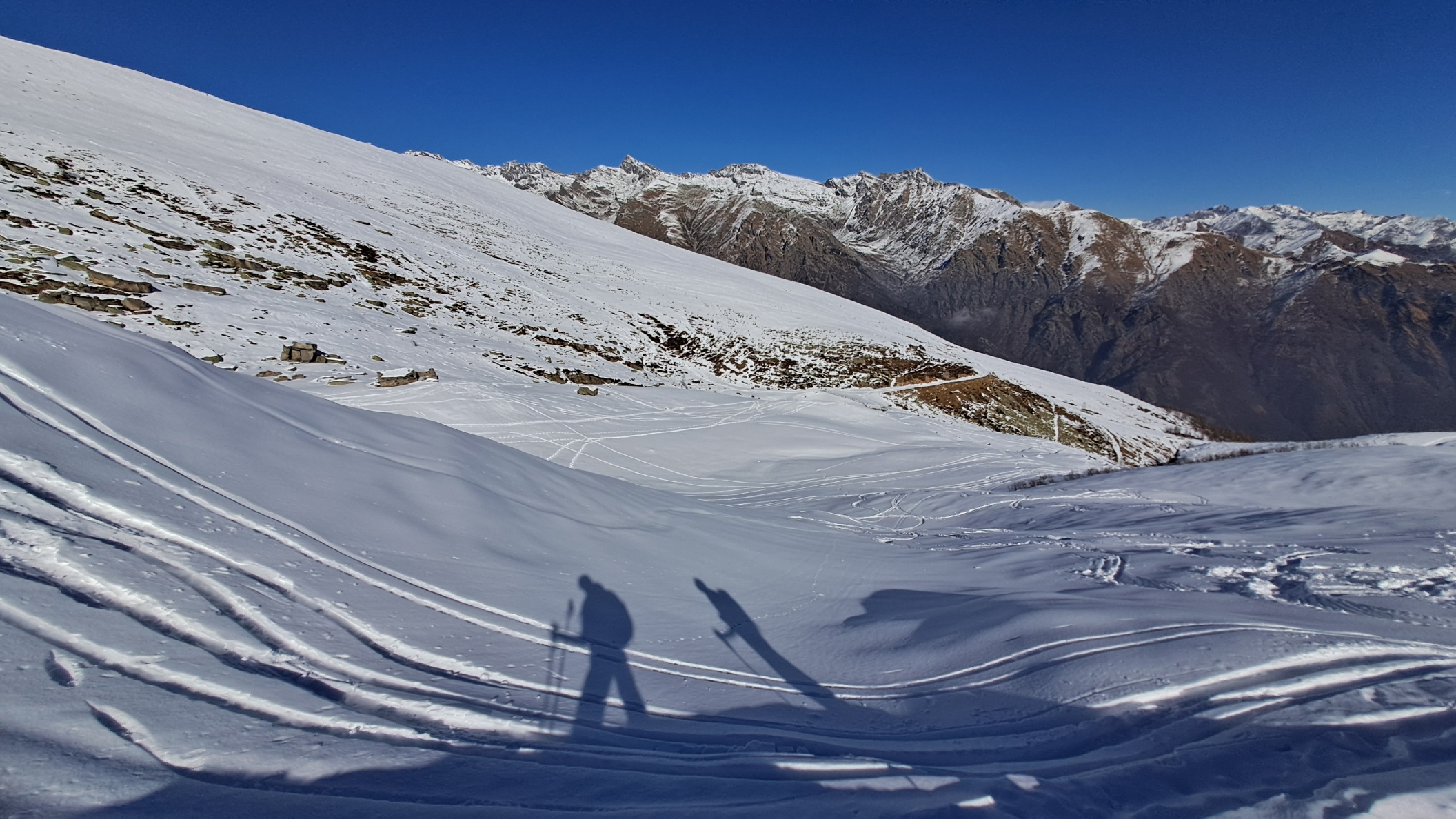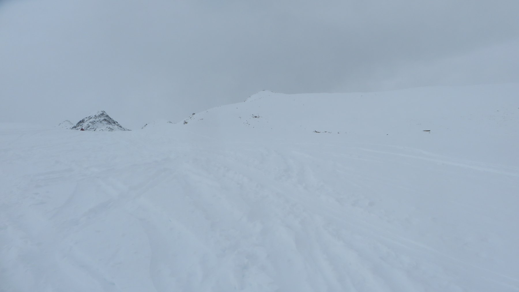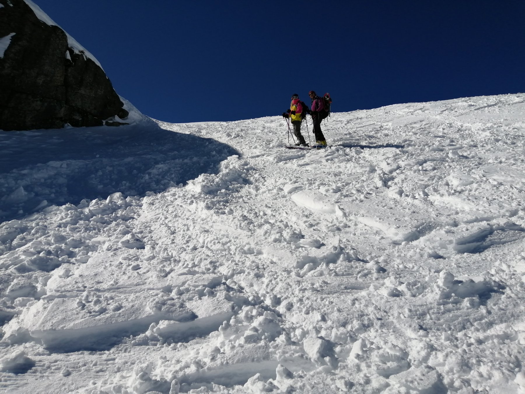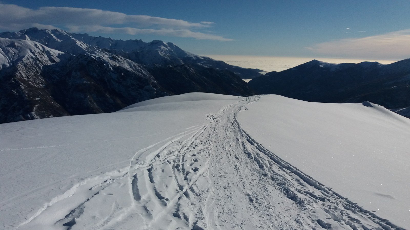 Dal piazzale seguire la pista di discesa più a destra e meno ripida, facendo attenzione agli sciatori.