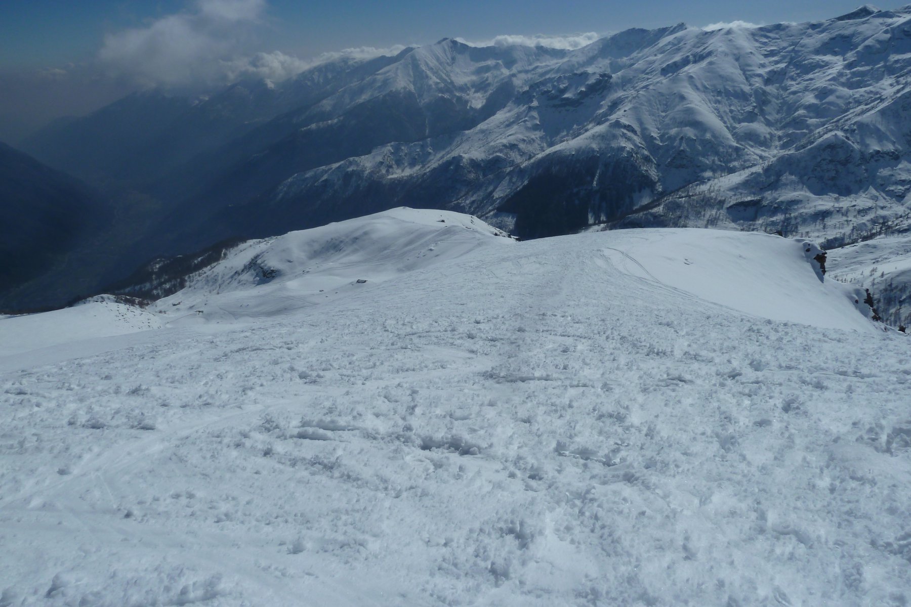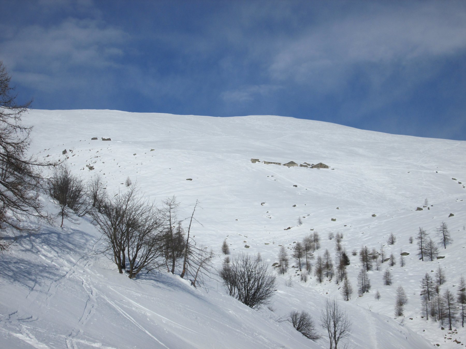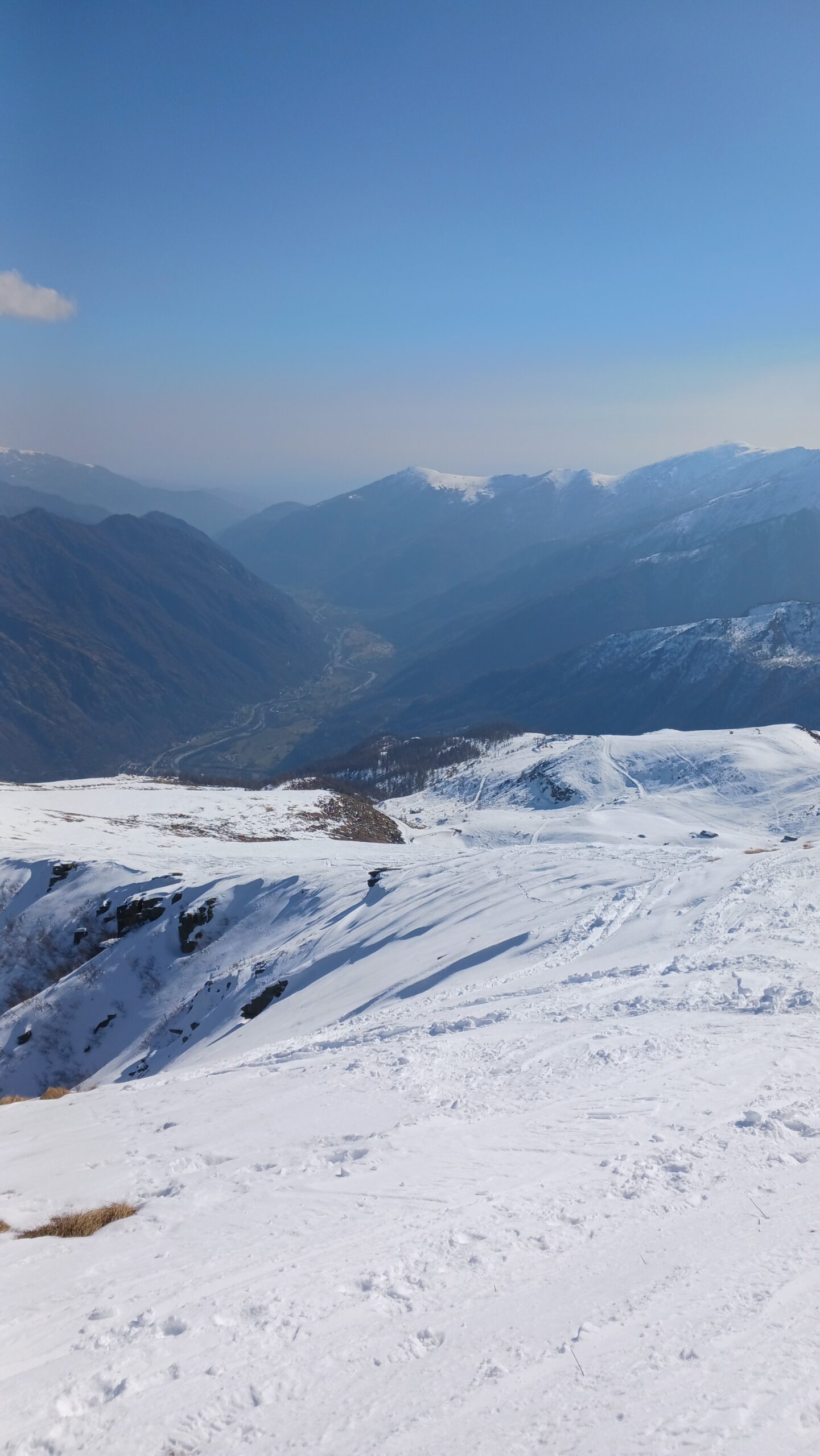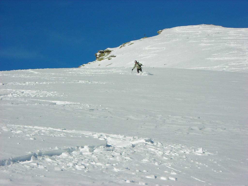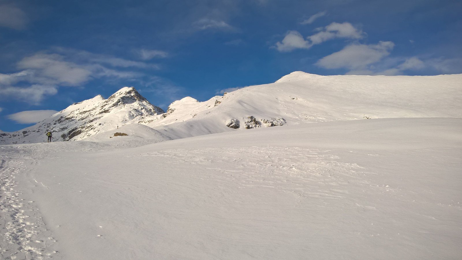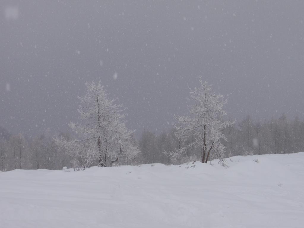 Dal piazzale seguire la pista di discesa più a destra e meno ripida, facendo attenzione agli sciatori.