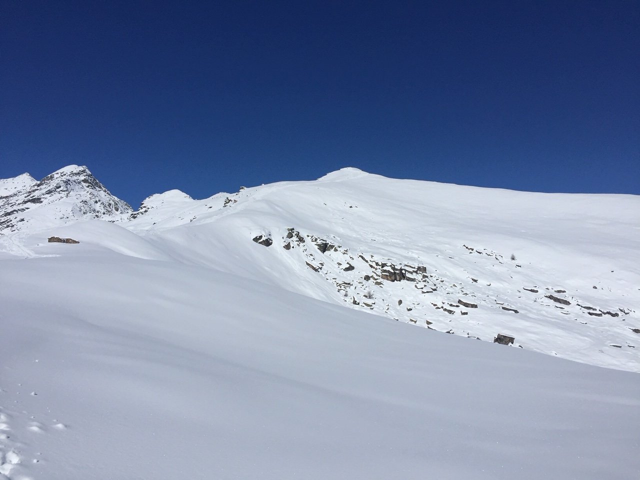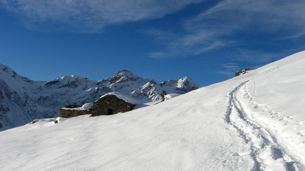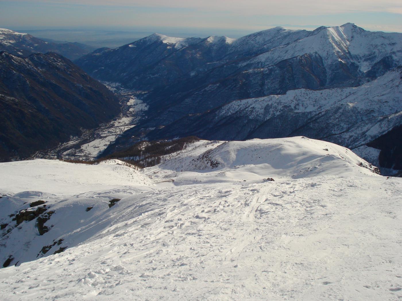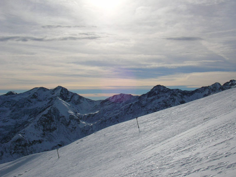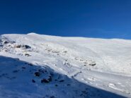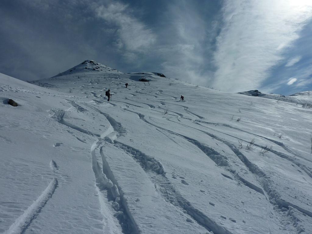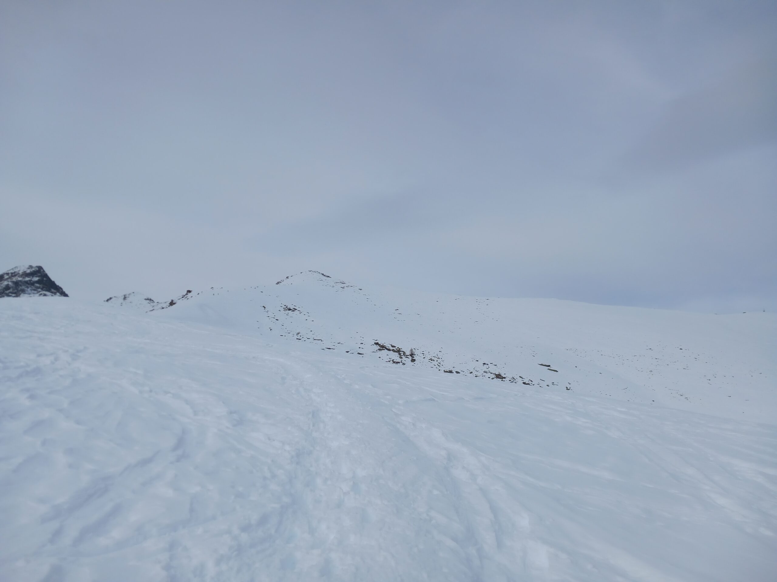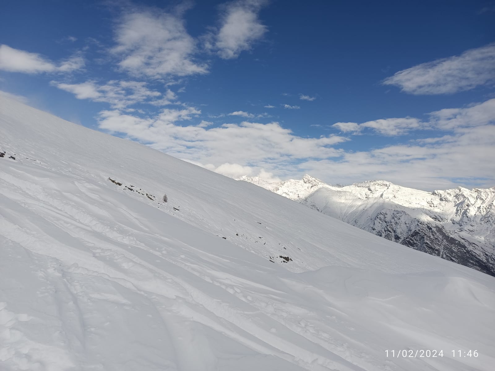 Dal piazzale seguire la pista di discesa più a destra e meno ripida, facendo attenzione agli sciatori.