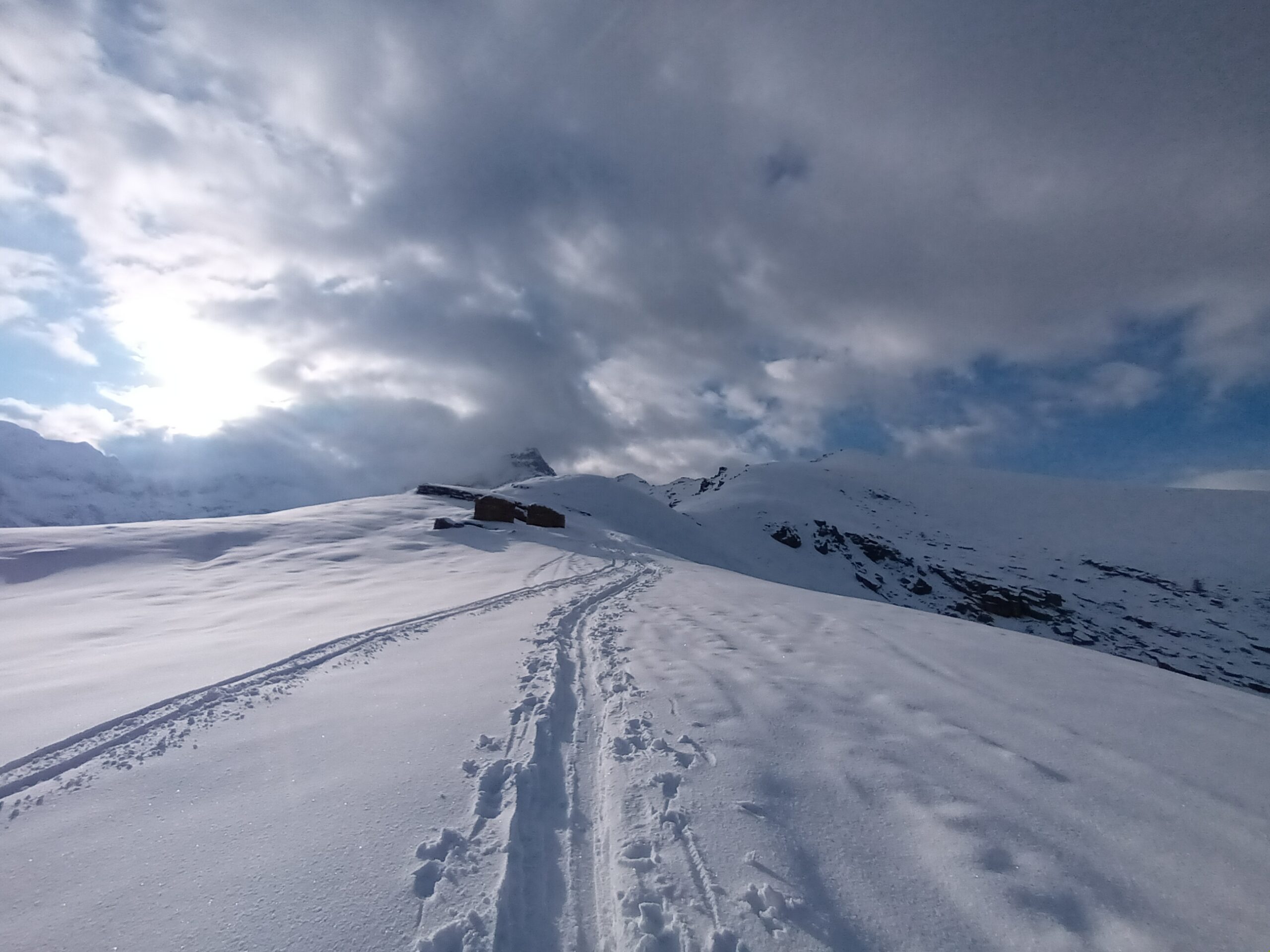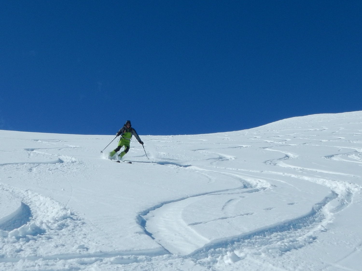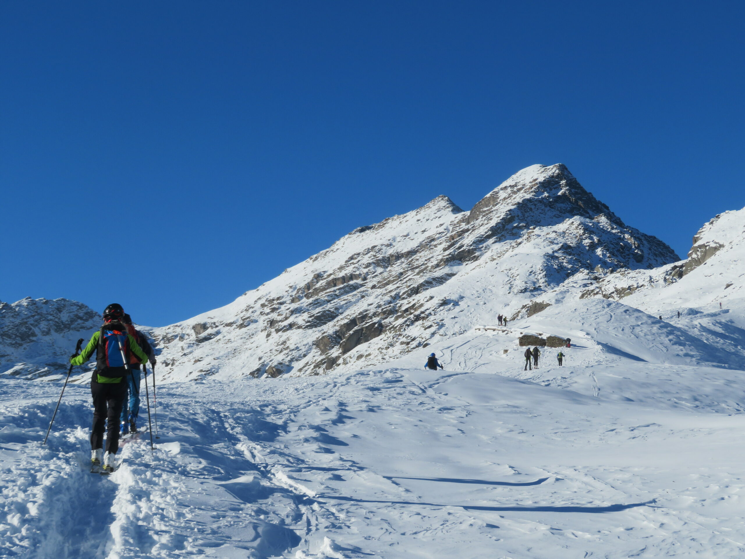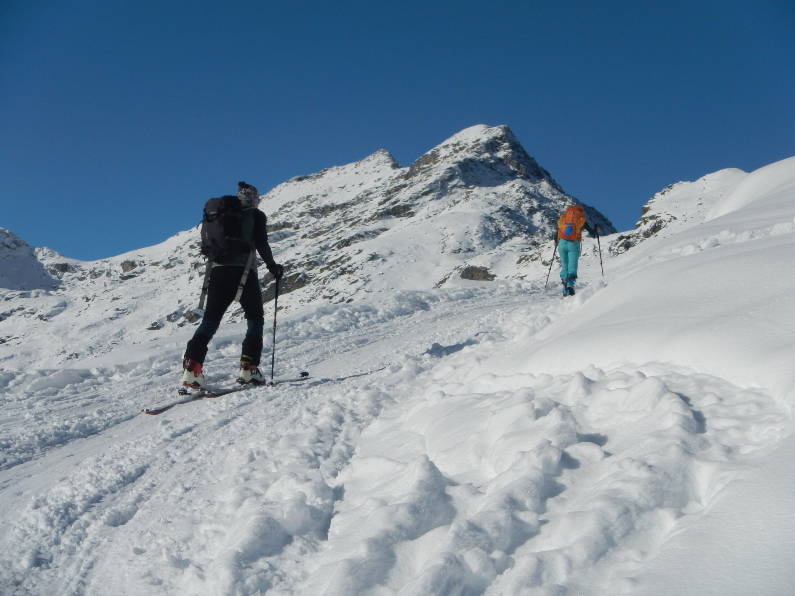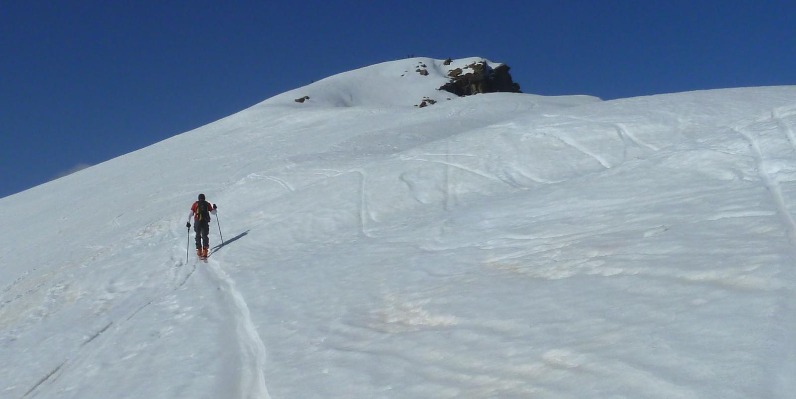 Dal piazzale seguire la pista di discesa più a destra e meno ripida, facendo attenzione agli sciatori.