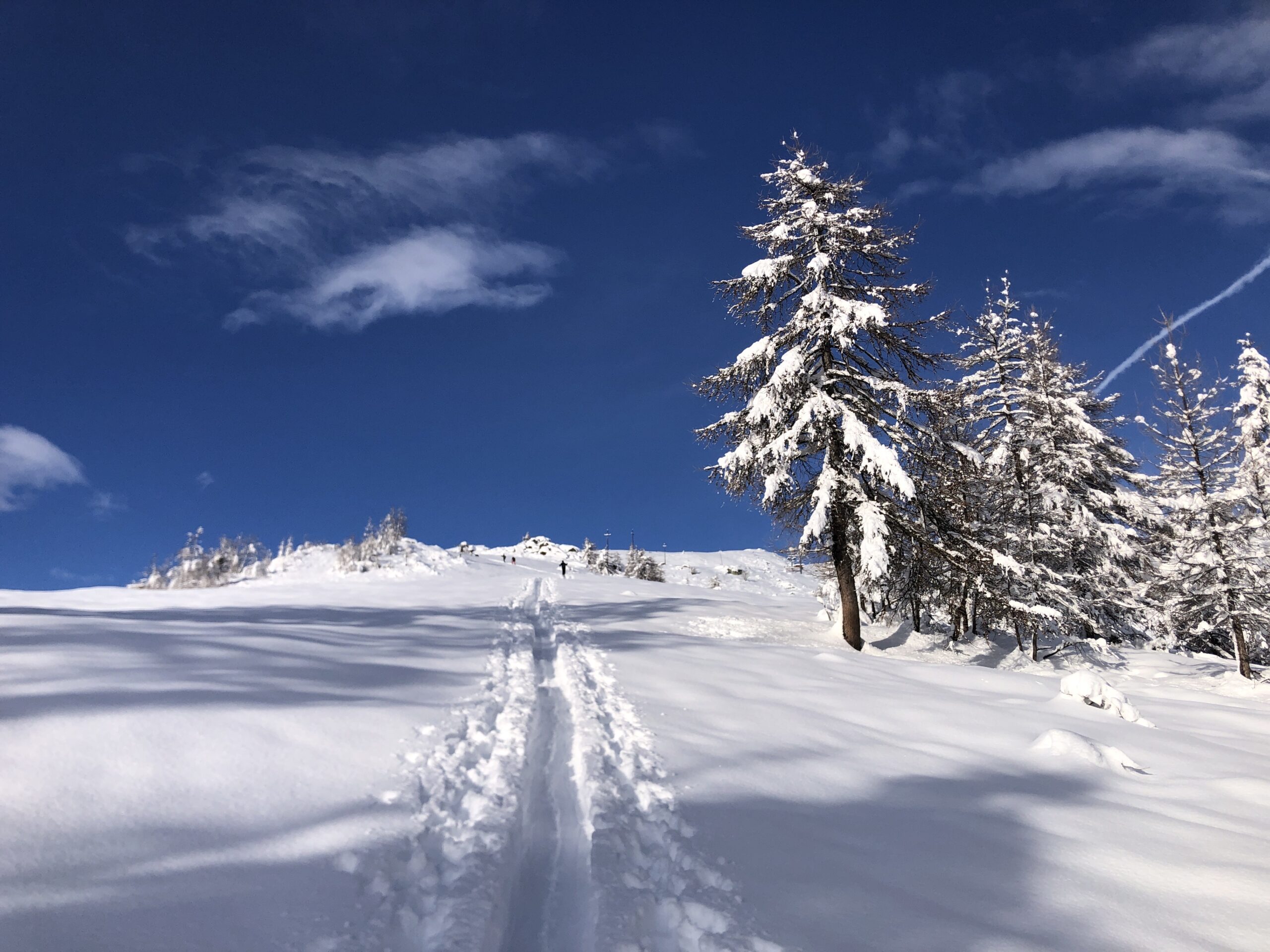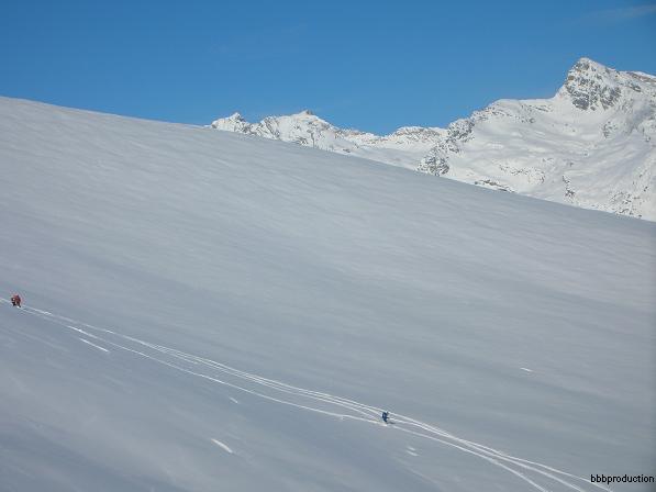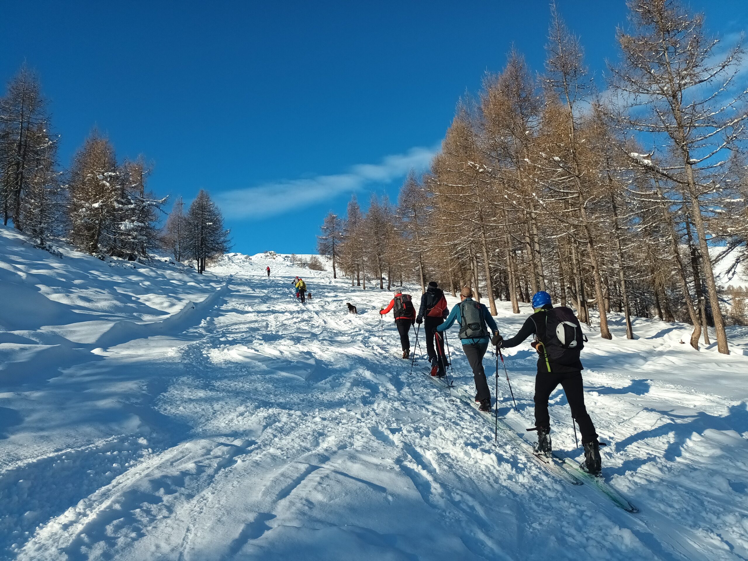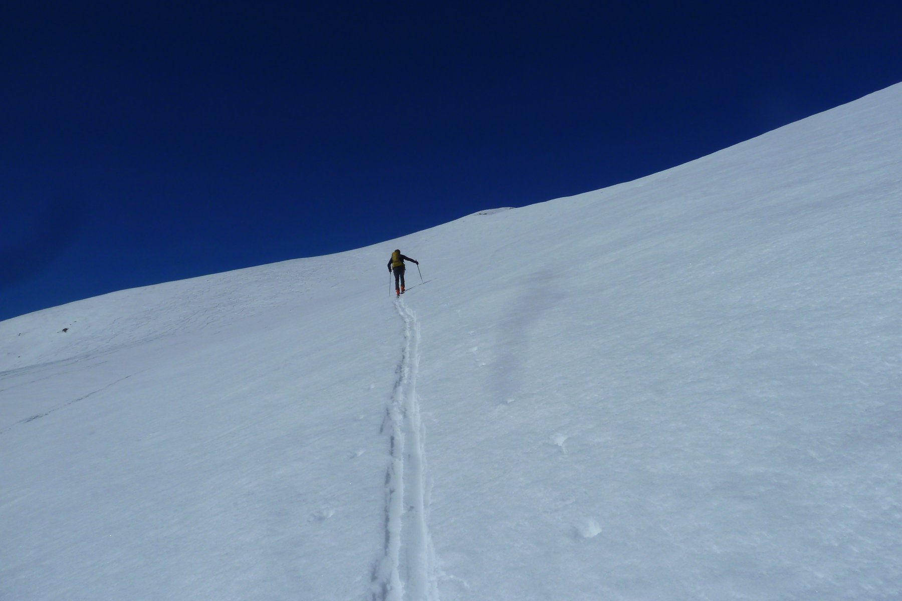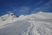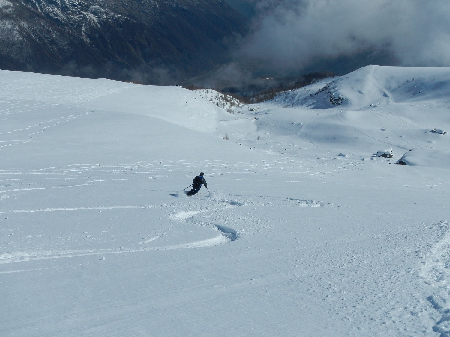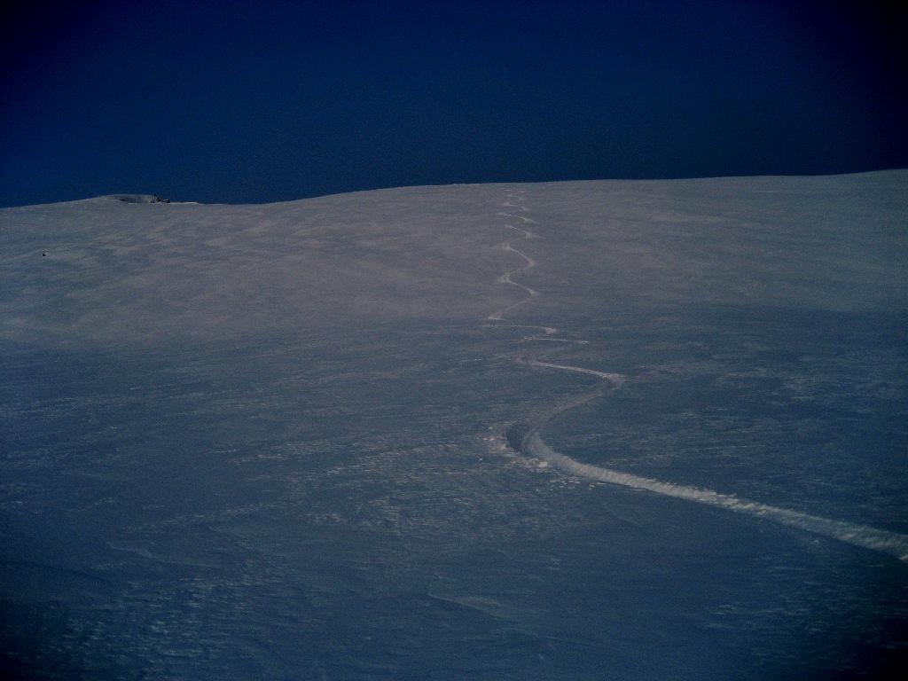 Dal piazzale seguire la pista di discesa più a destra e meno ripida, facendo attenzione agli sciatori.
