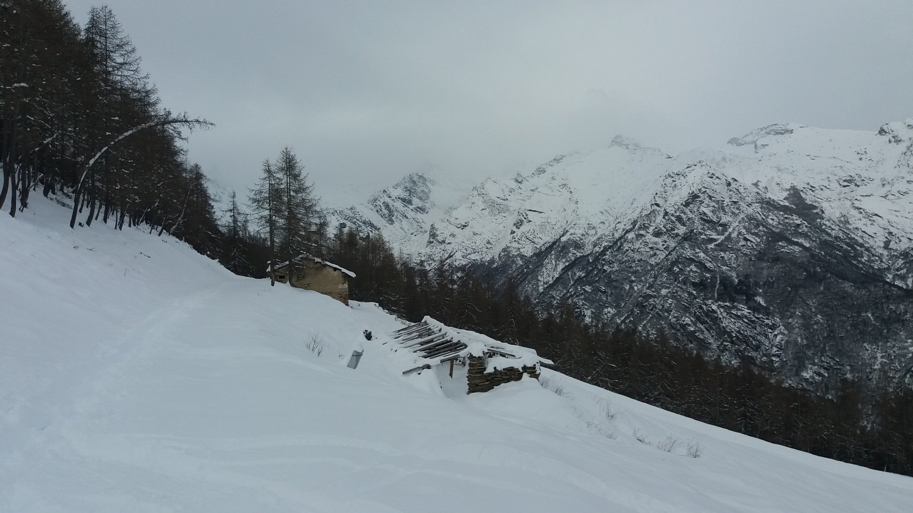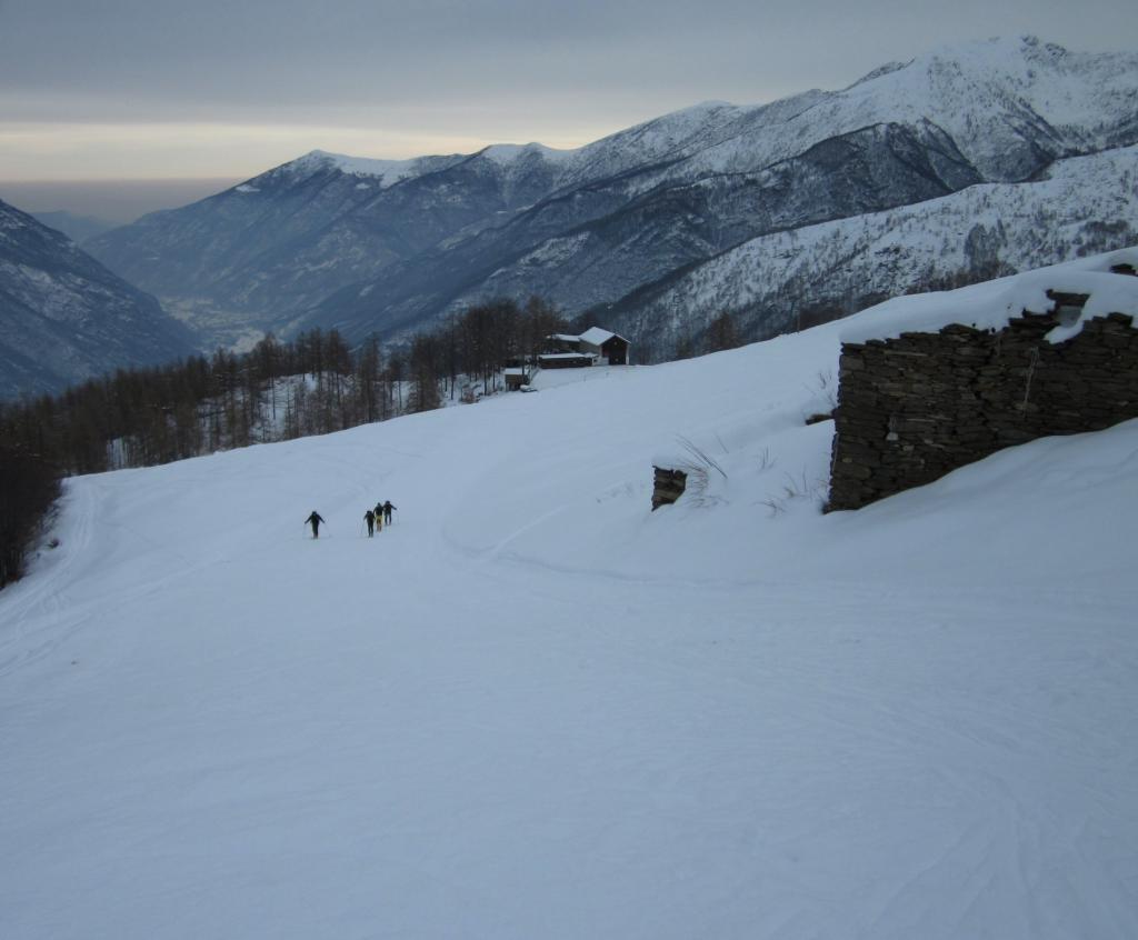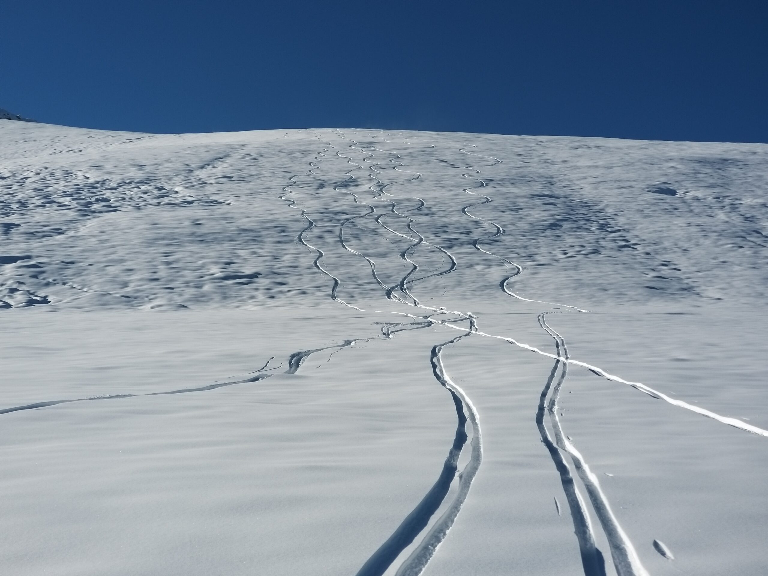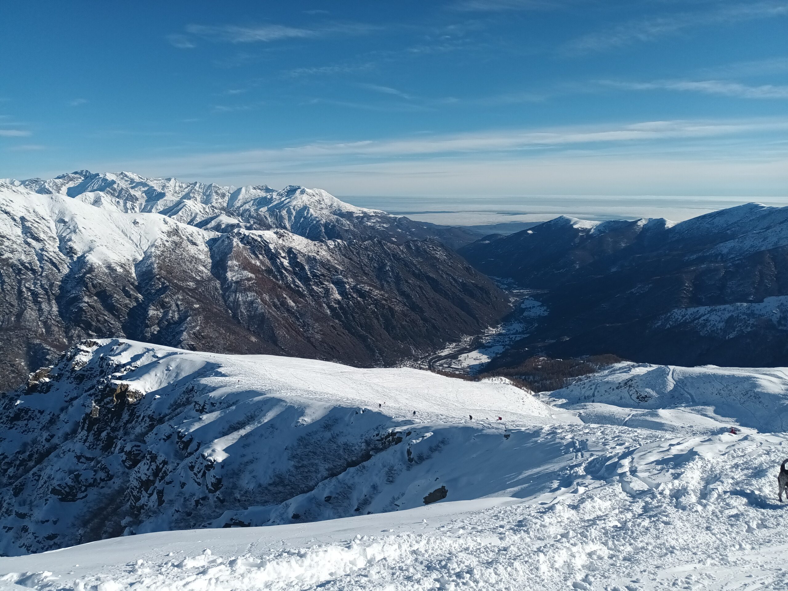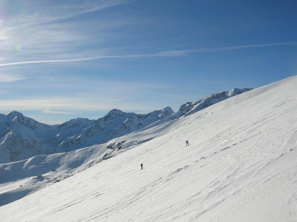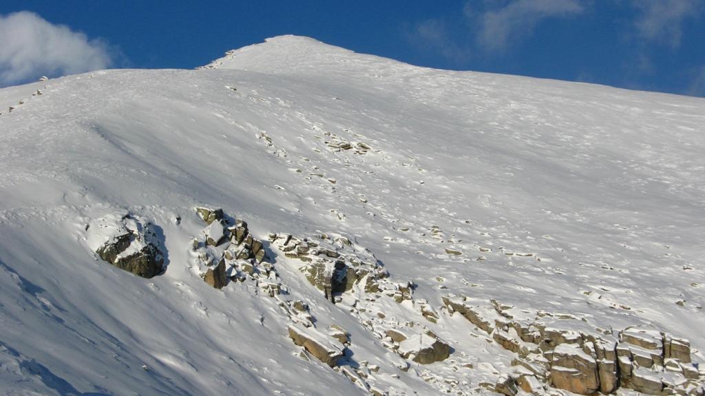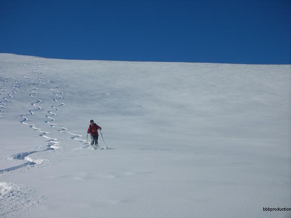 Dal piazzale seguire la pista di discesa più a destra e meno ripida, facendo attenzione agli sciatori.