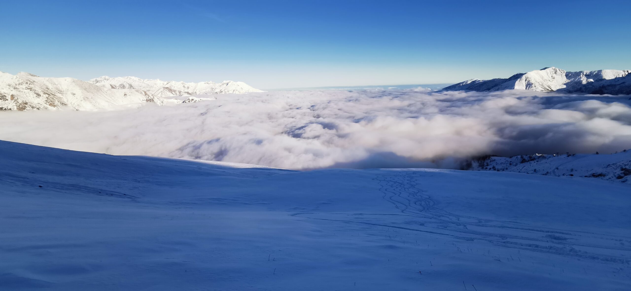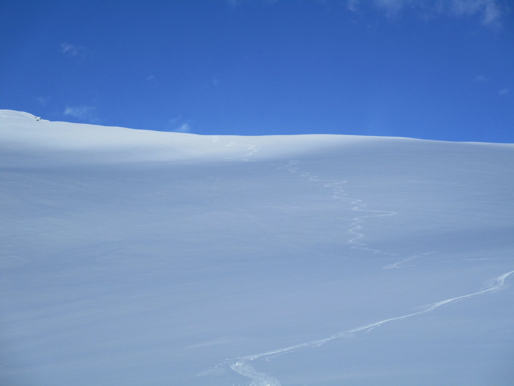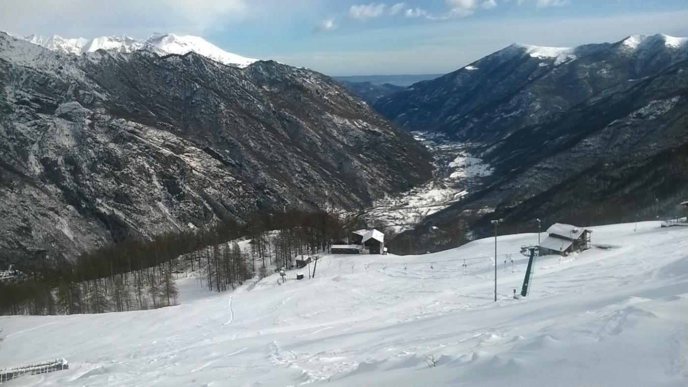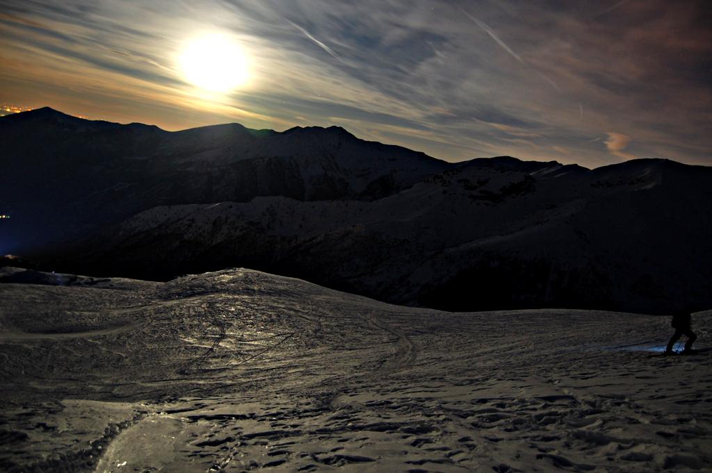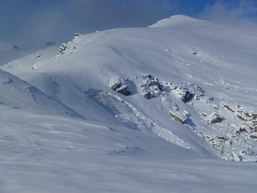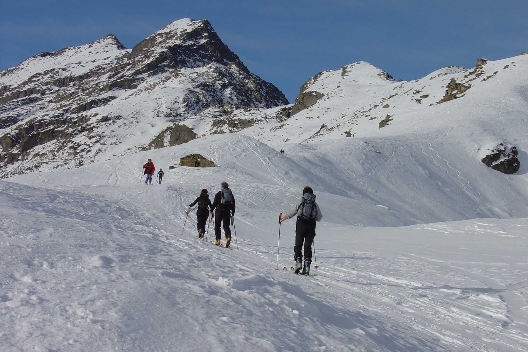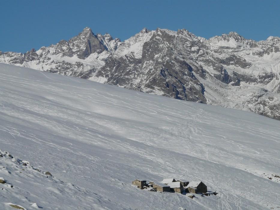 Dal piazzale seguire la pista di discesa più a destra e meno ripida, facendo attenzione agli sciatori.