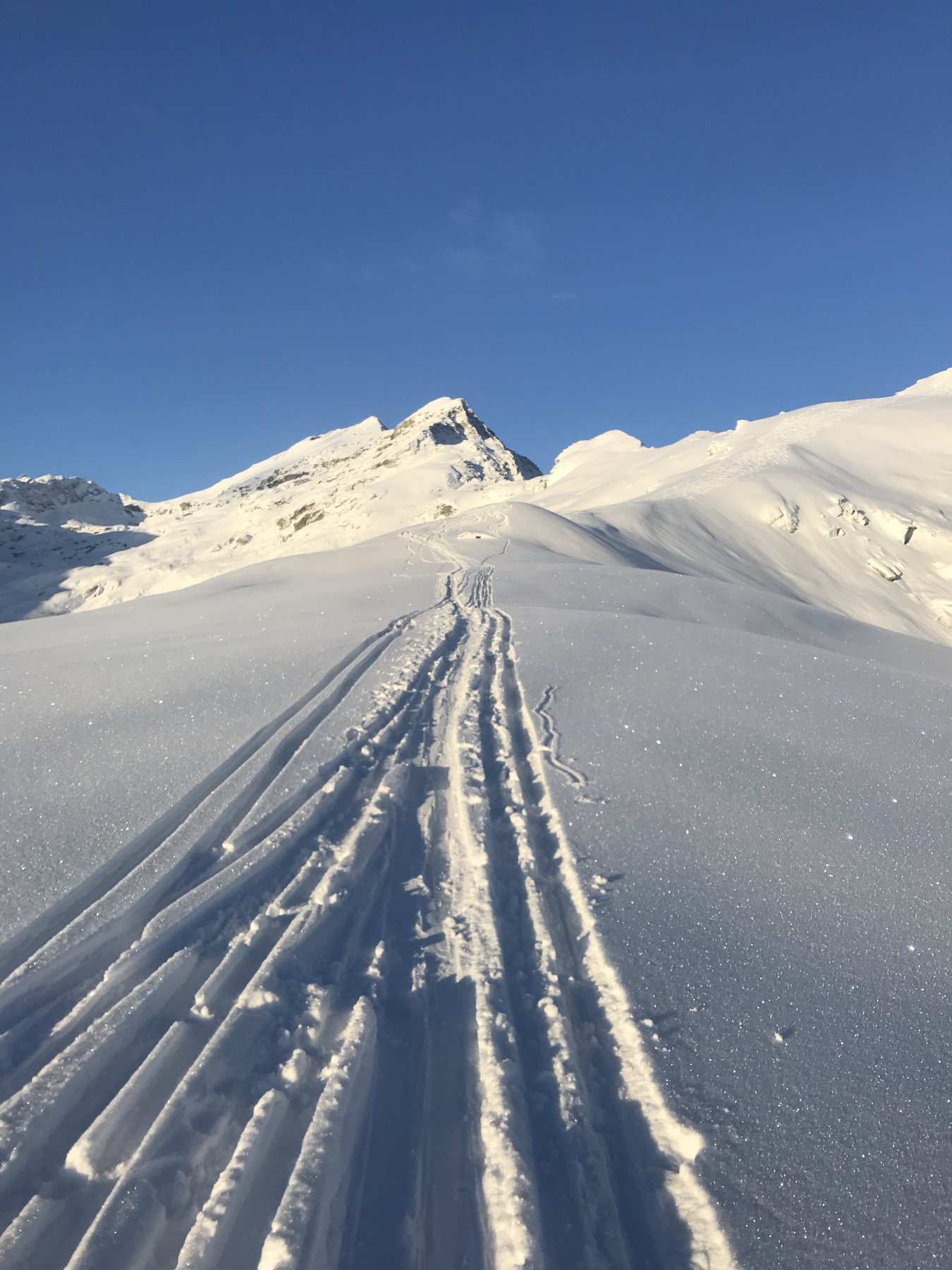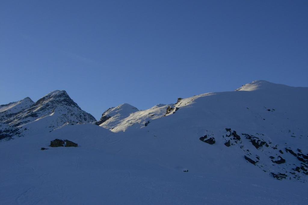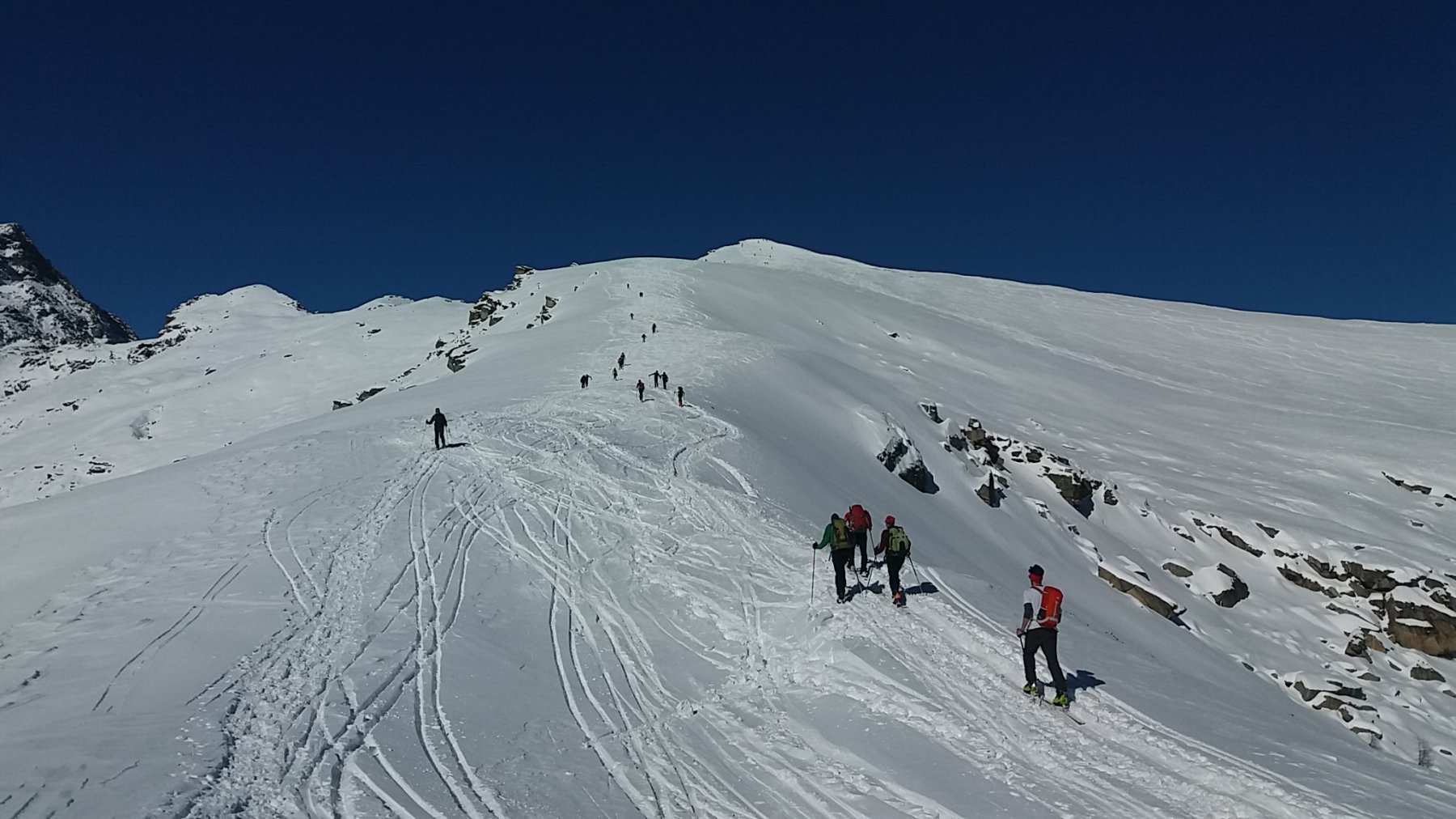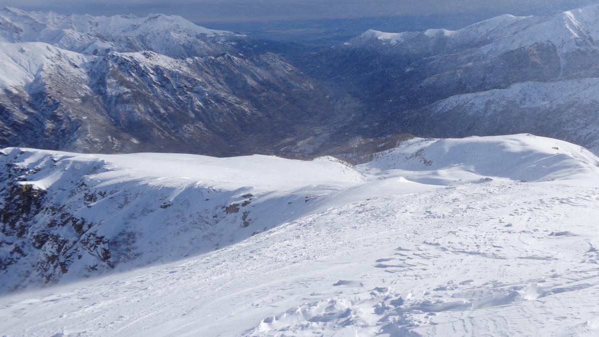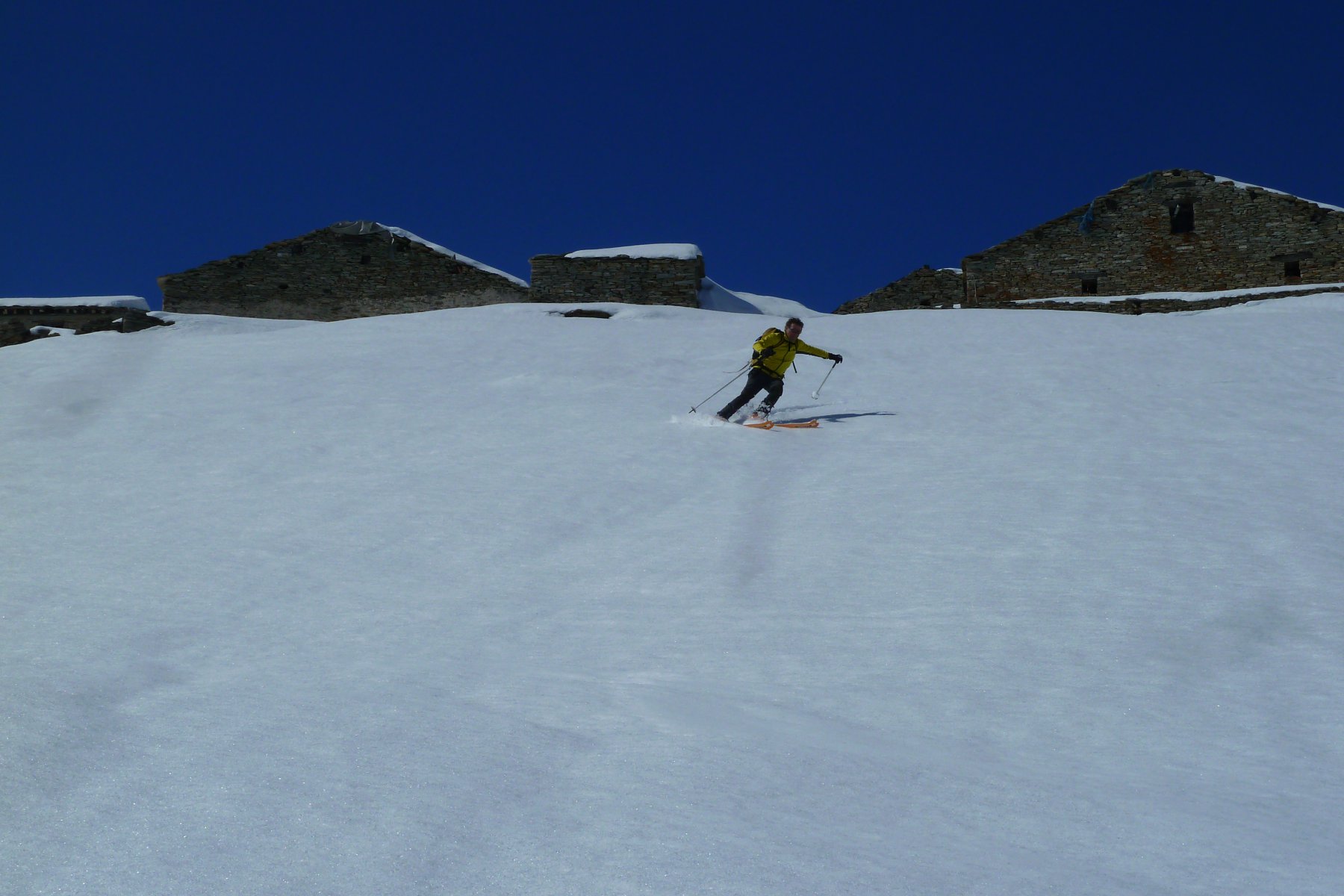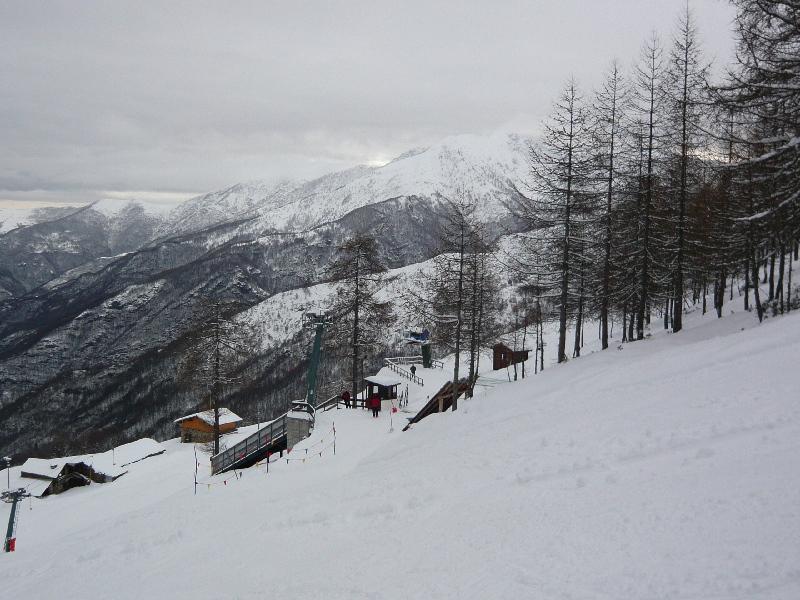 Dal piazzale seguire la pista di discesa più a destra e meno ripida, facendo attenzione agli sciatori.