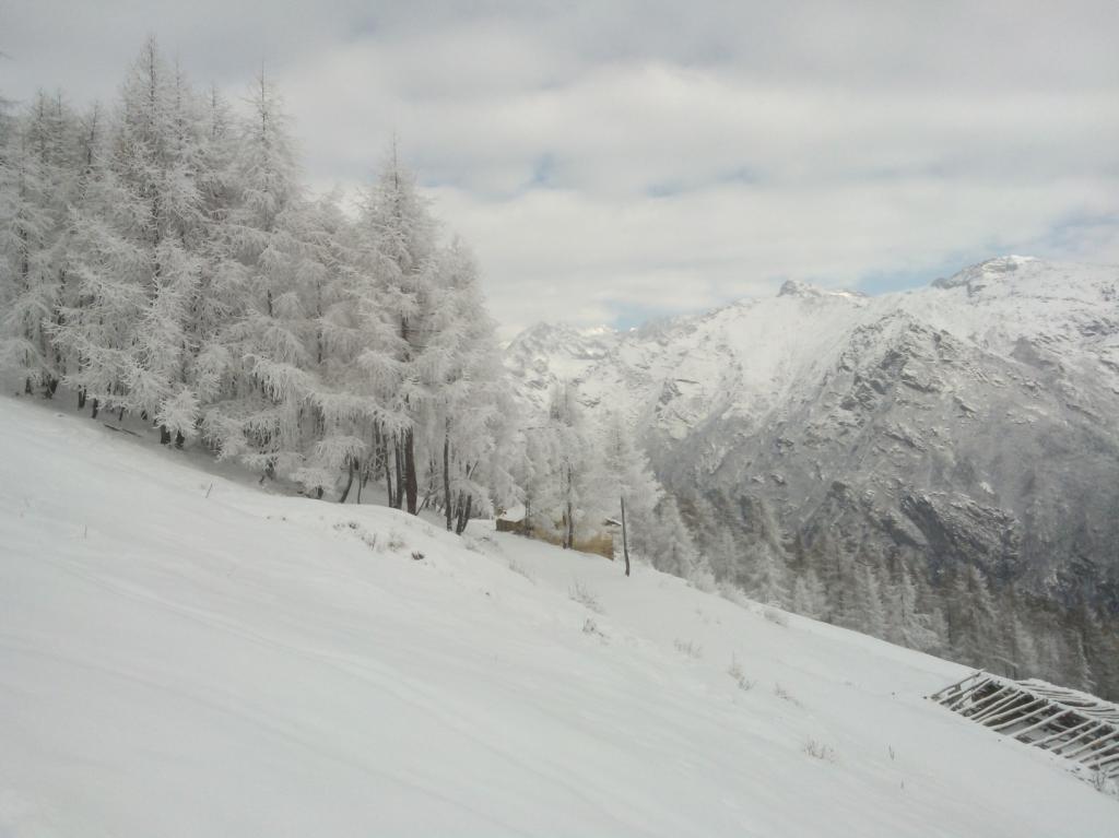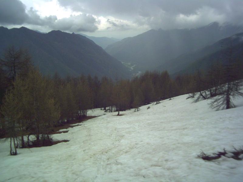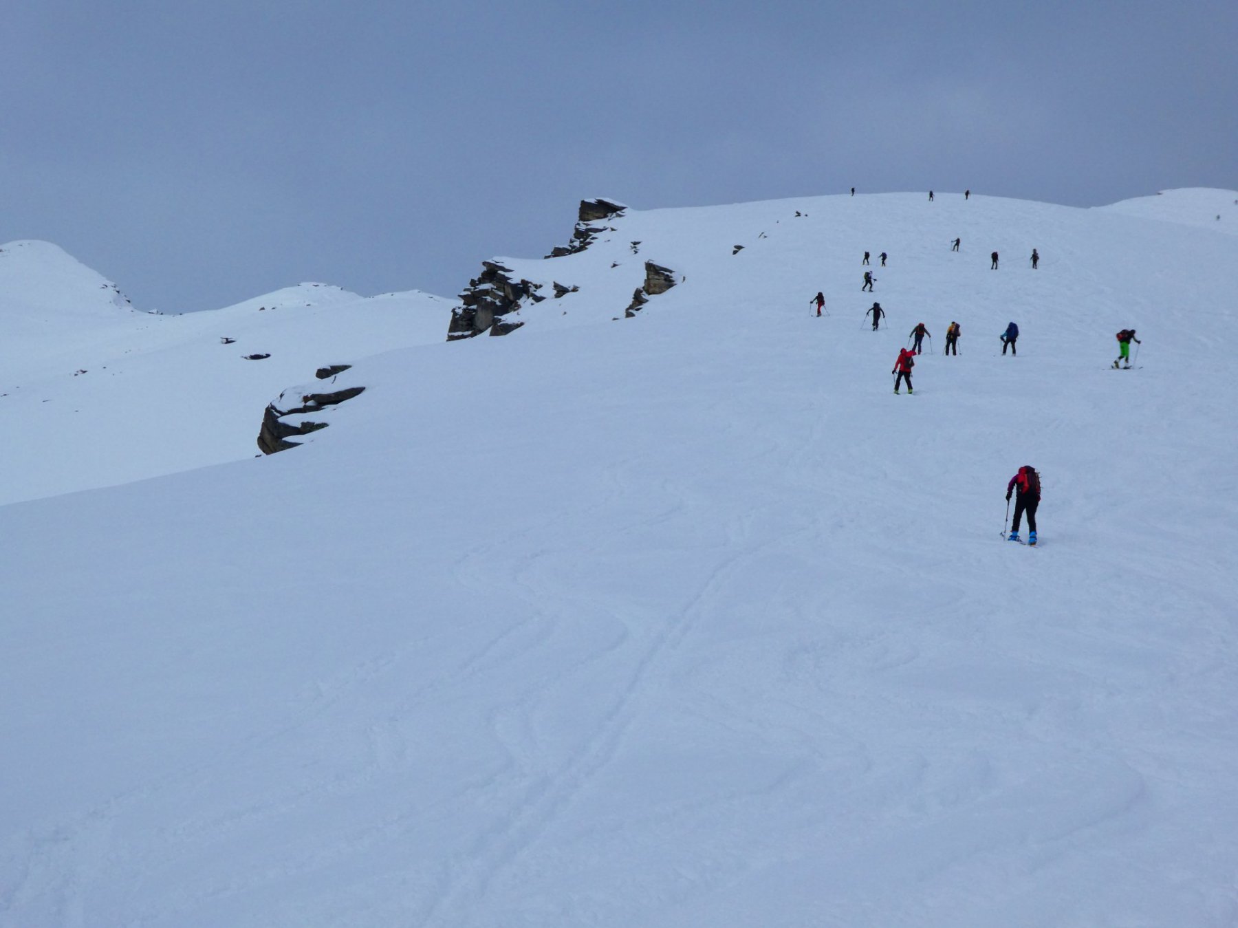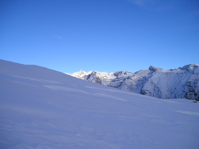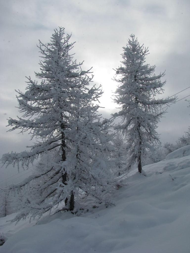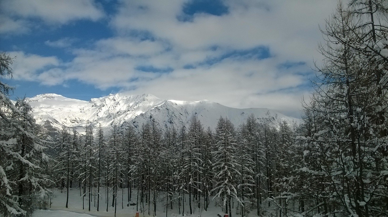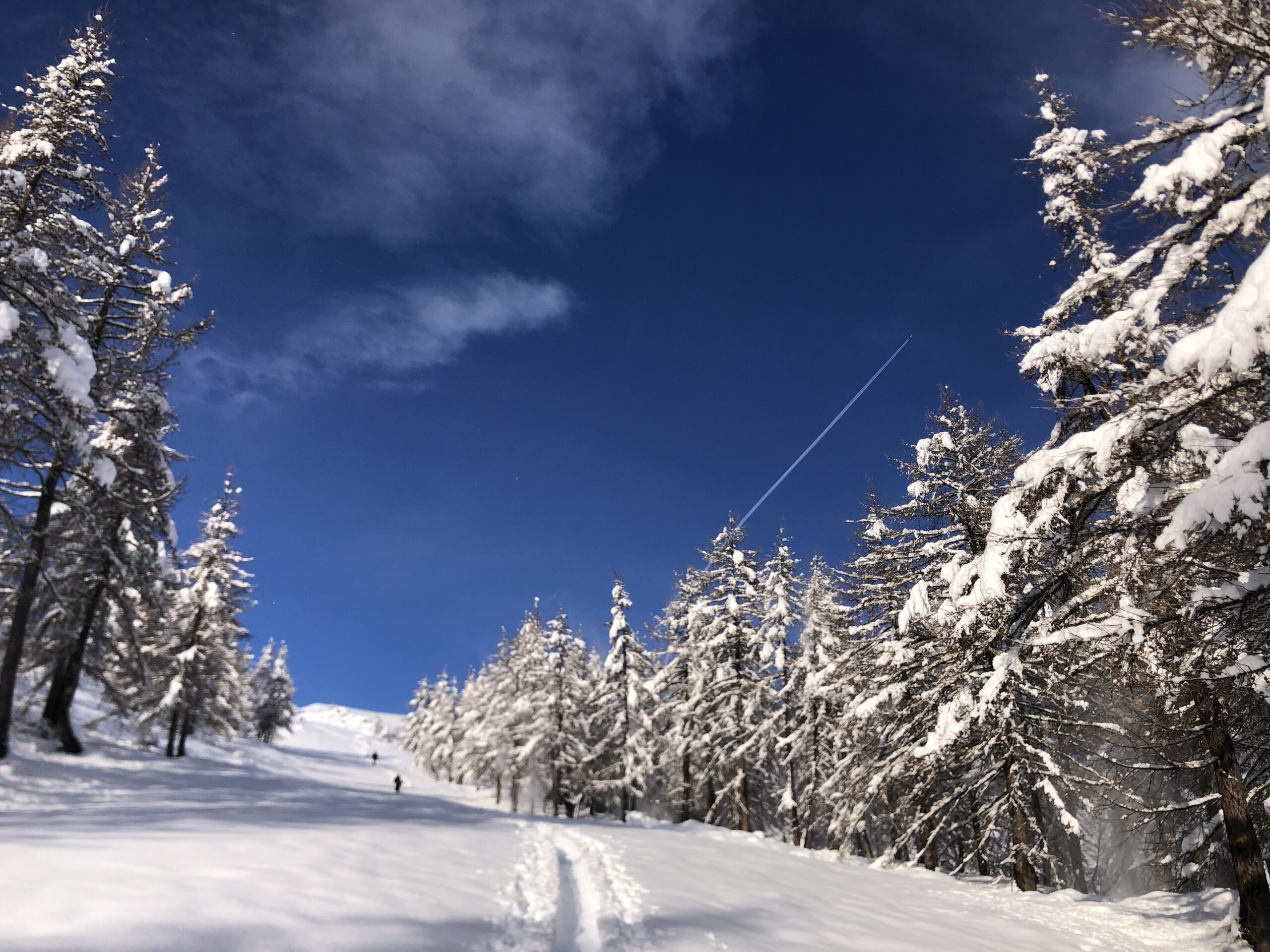 Dal piazzale seguire la pista di discesa più a destra e meno ripida, facendo attenzione agli sciatori.