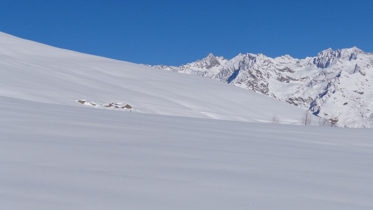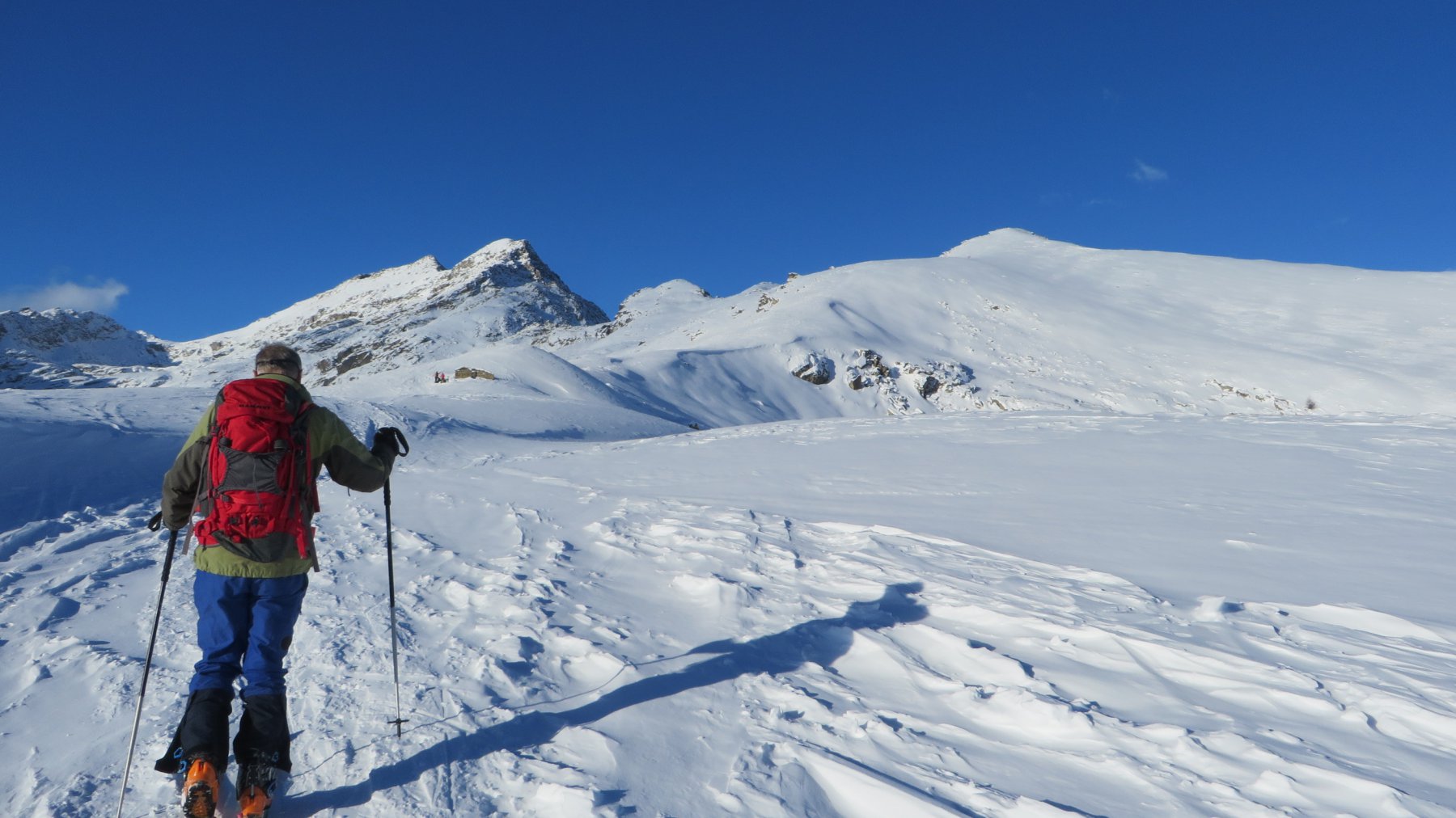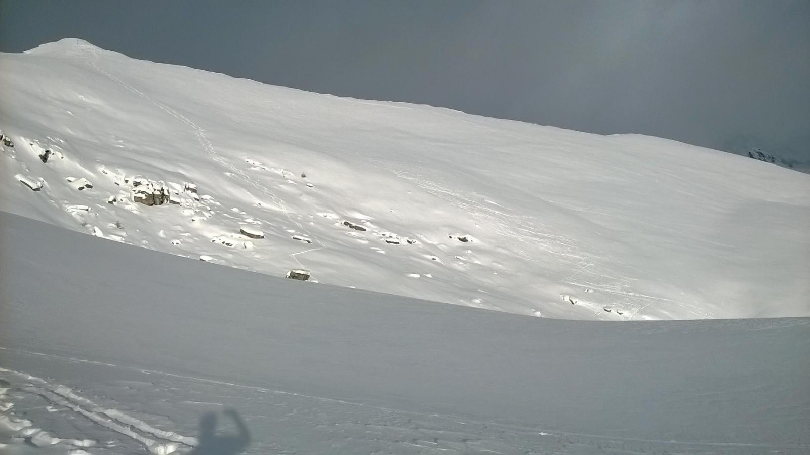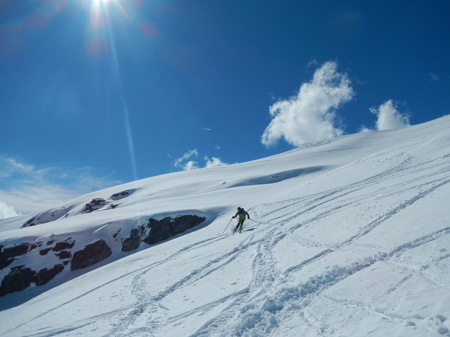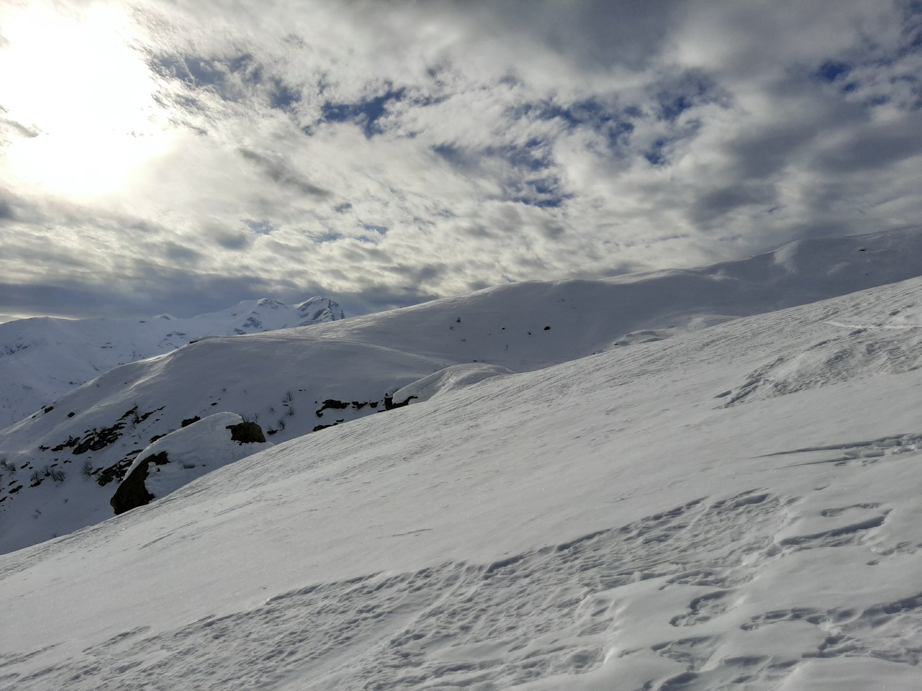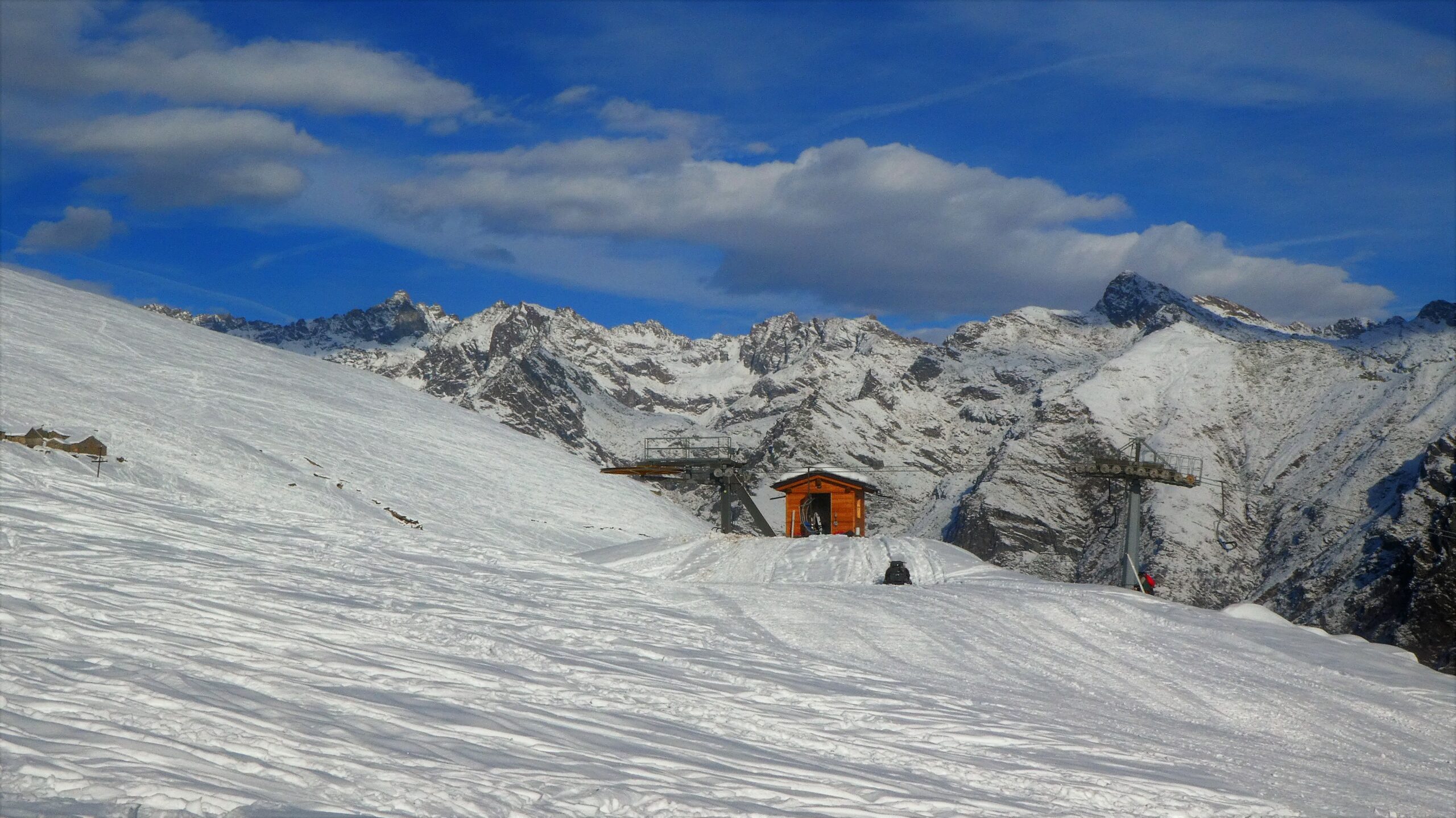 Dal piazzale seguire la pista di discesa più a destra e meno ripida, facendo attenzione agli sciatori.