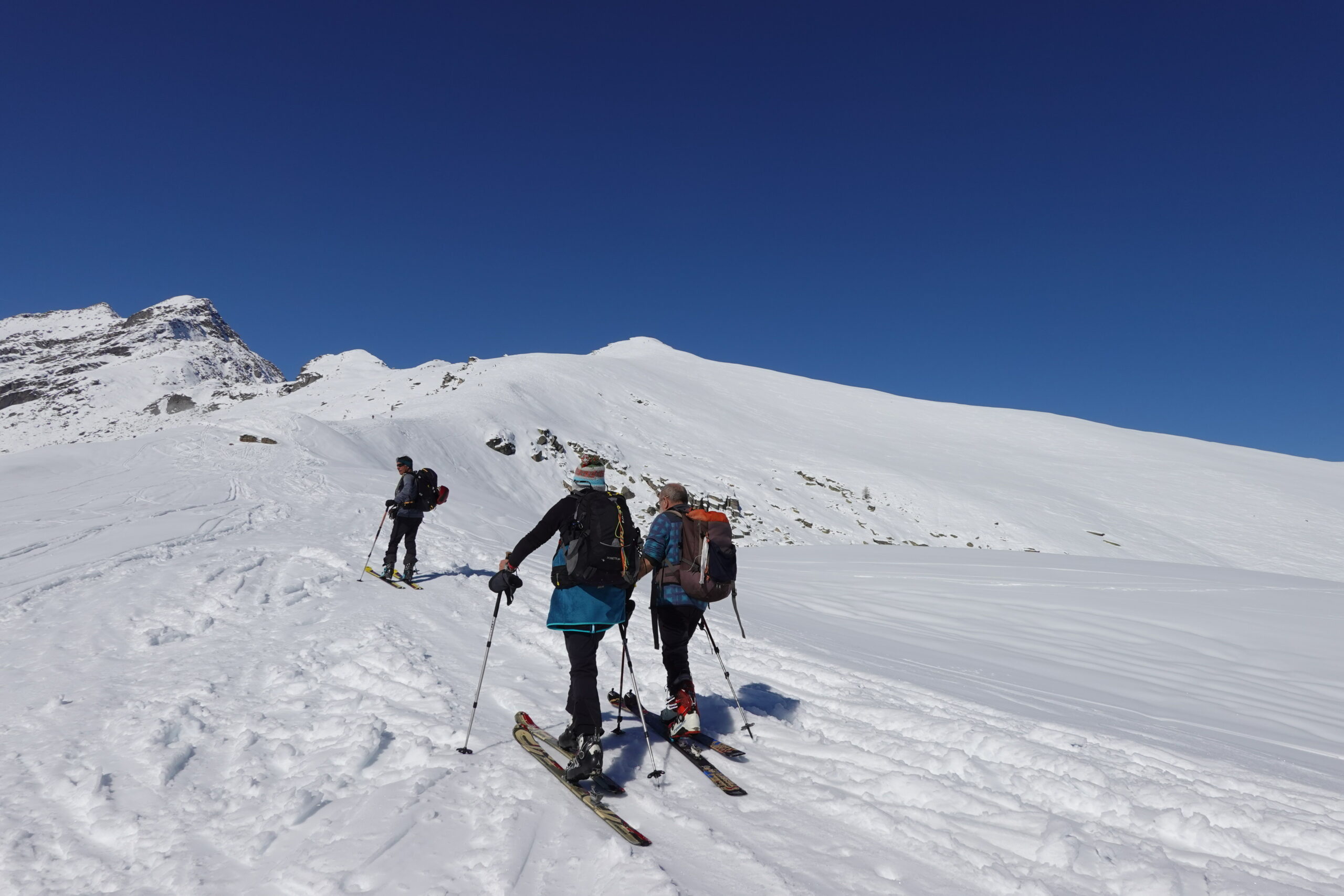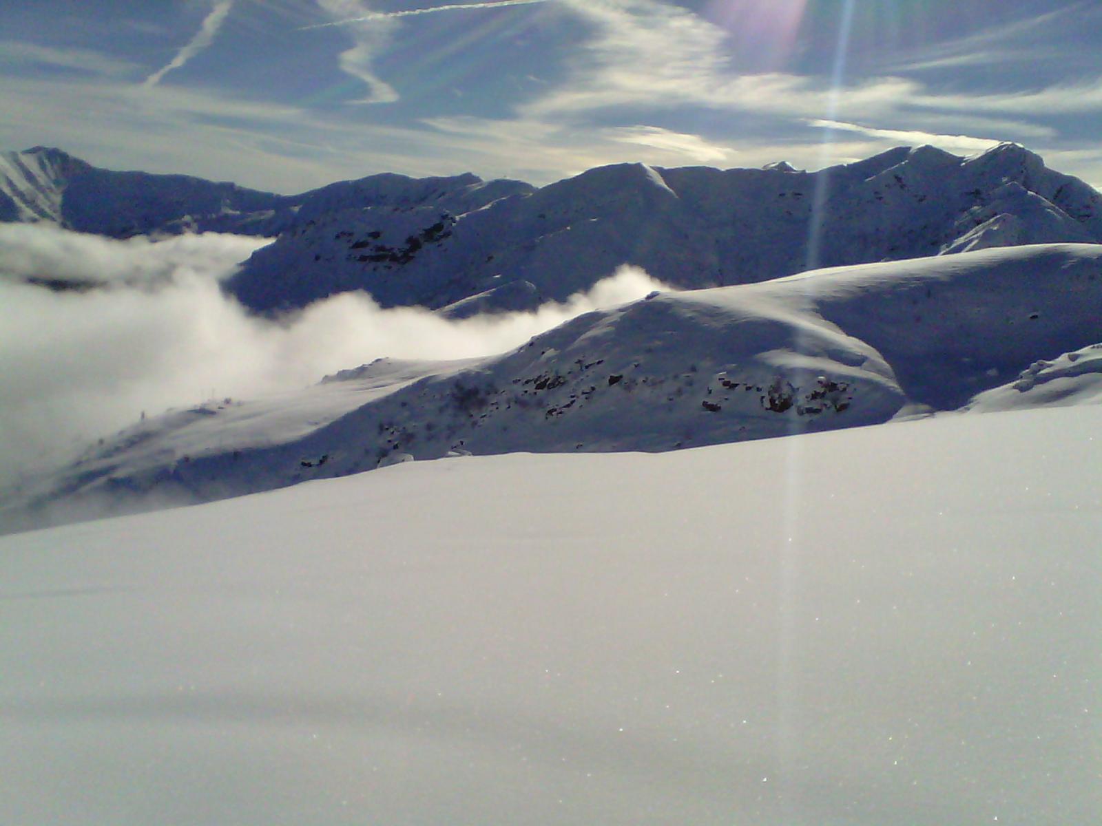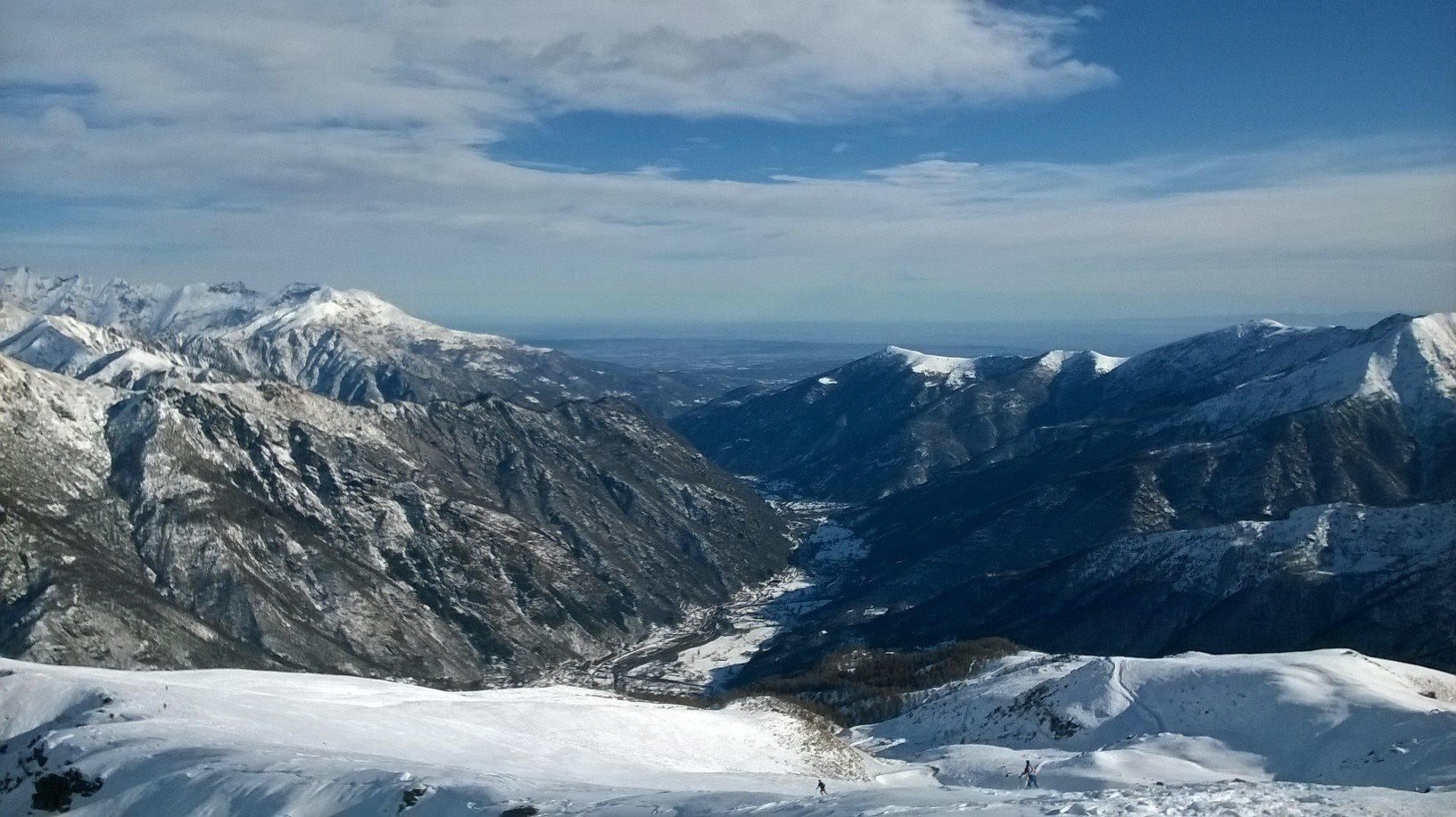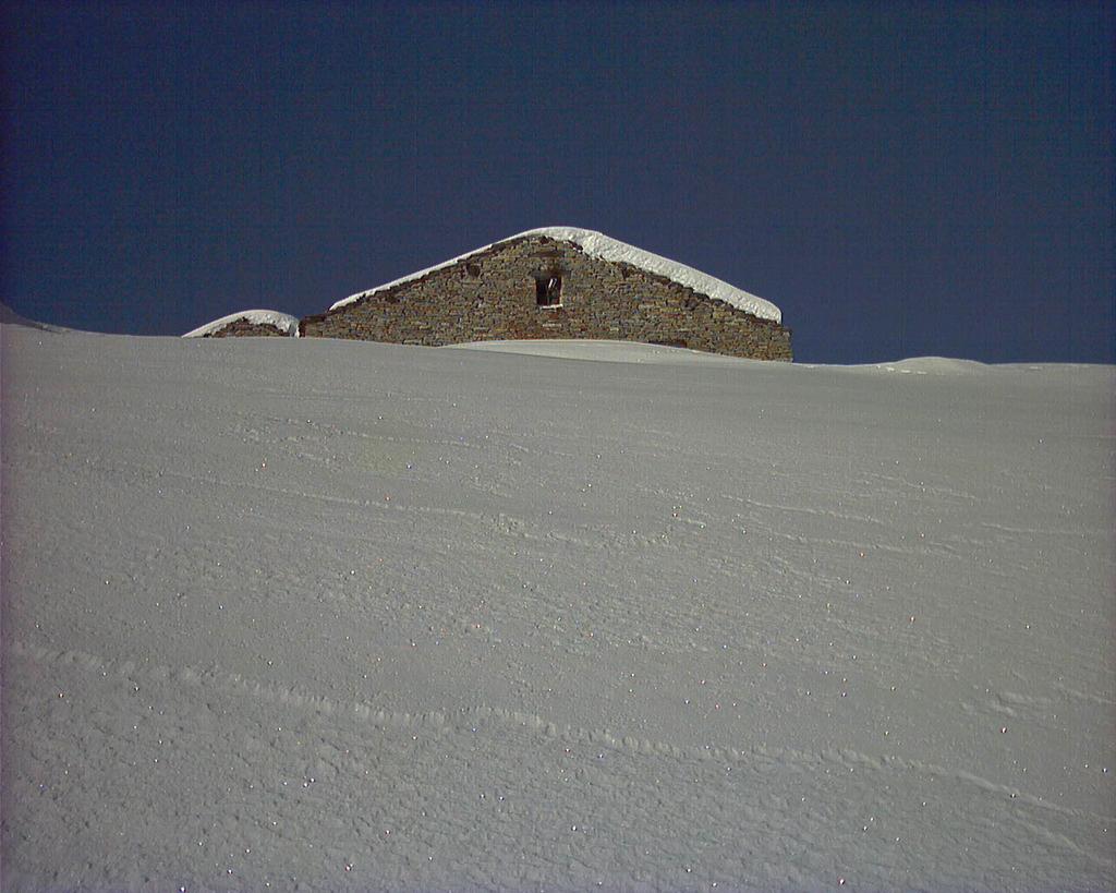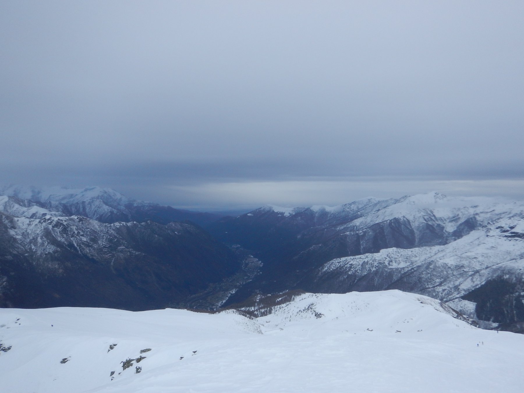 Dal piazzale seguire la pista di discesa più a destra e meno ripida, facendo attenzione agli sciatori.