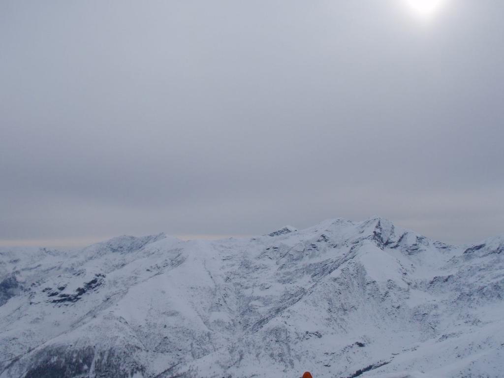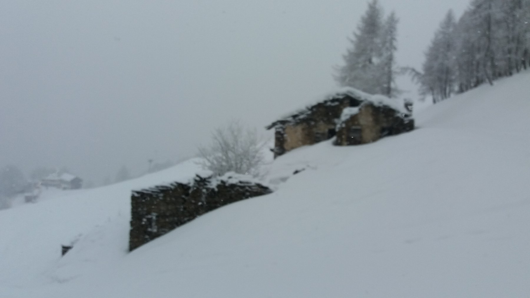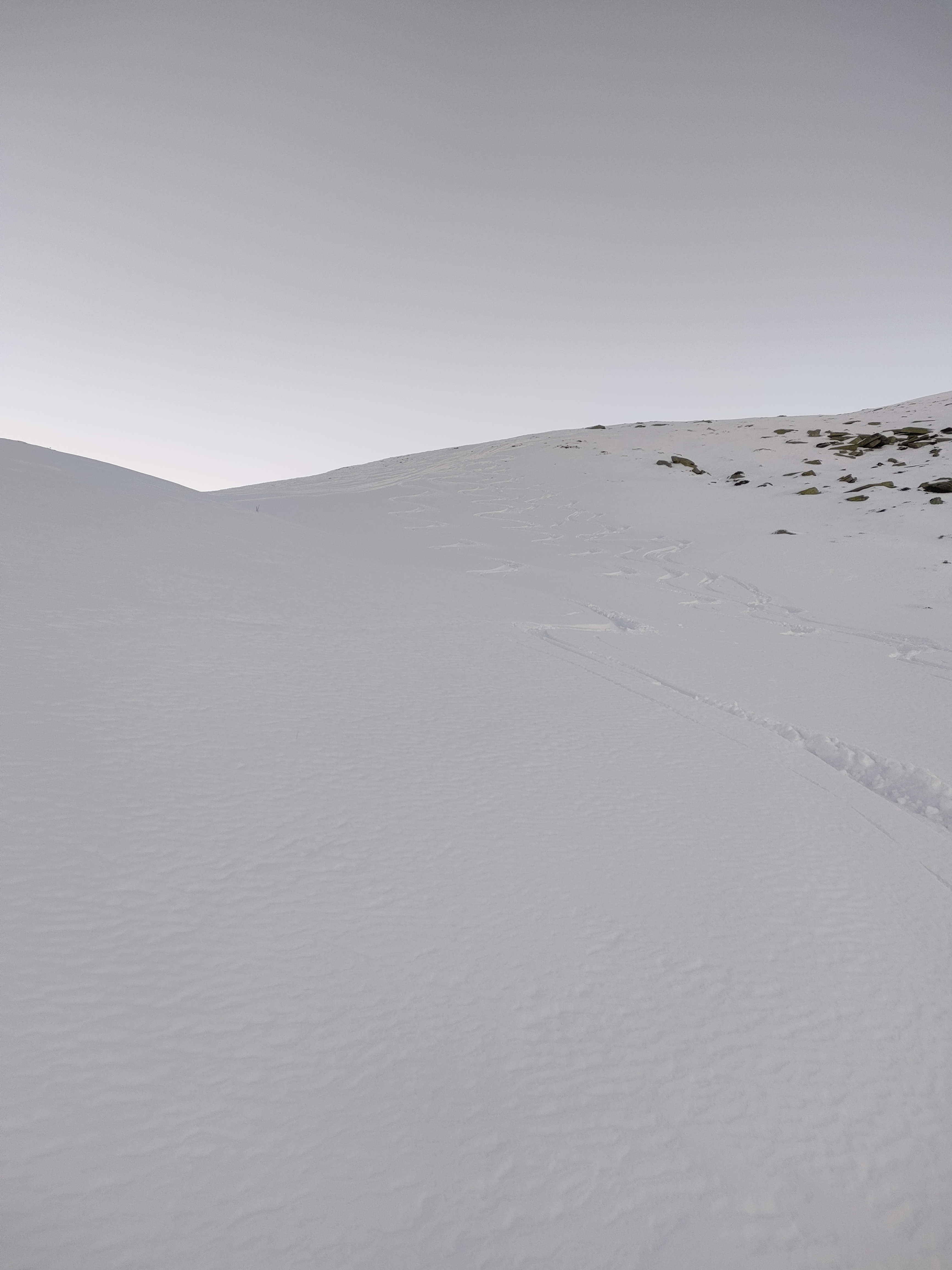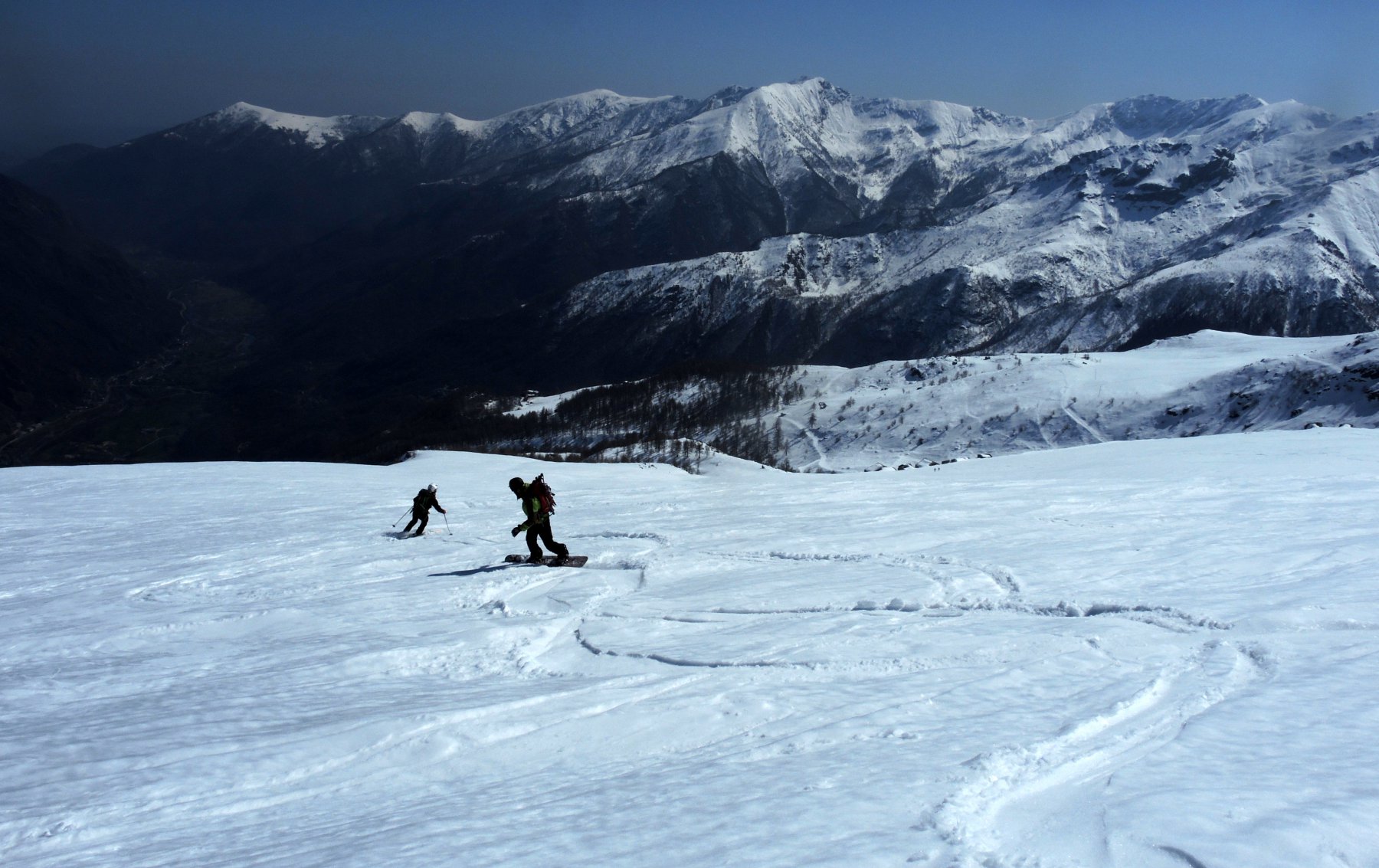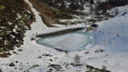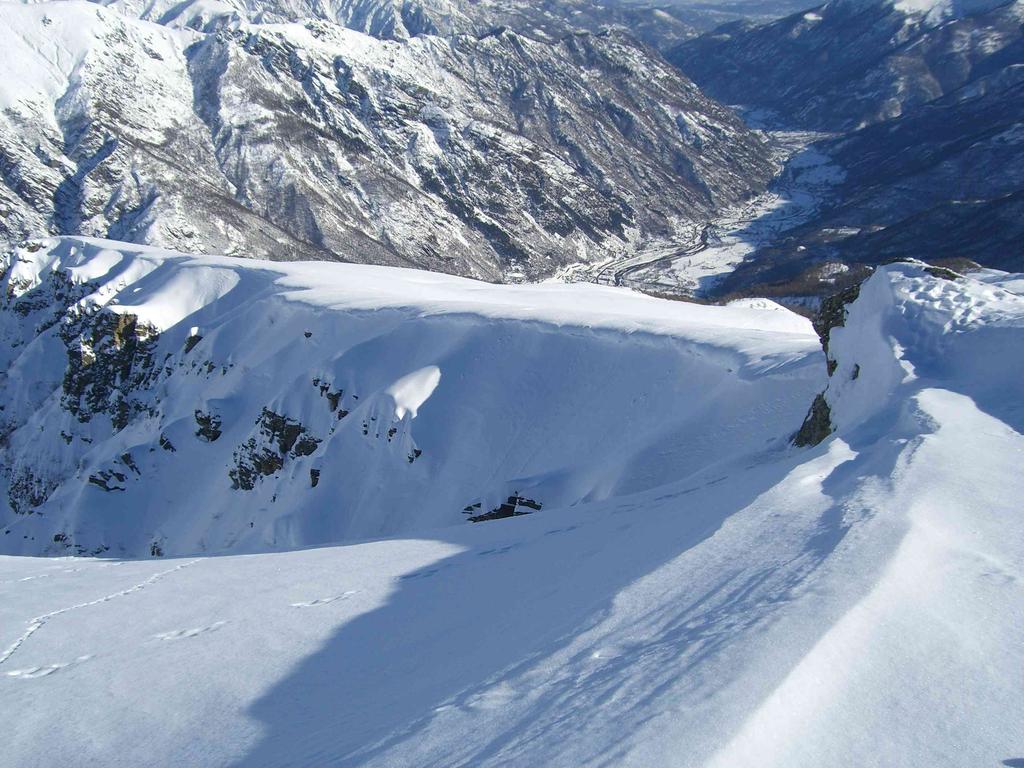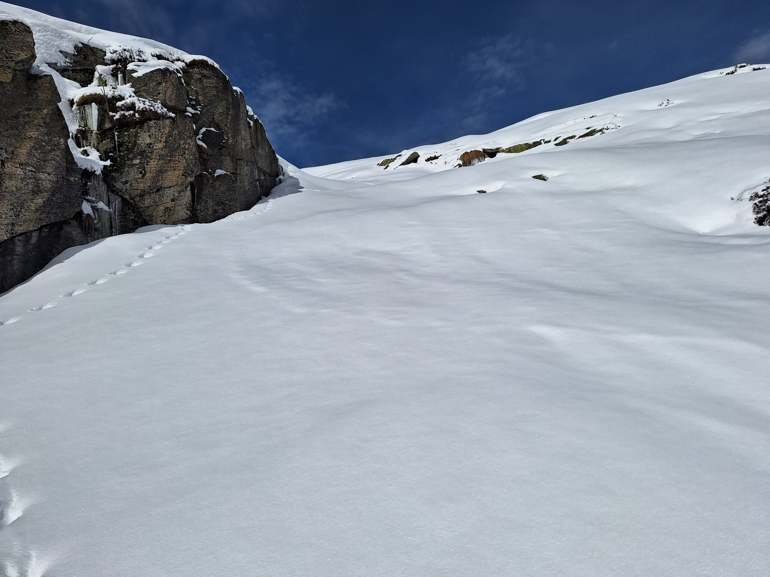 Dal piazzale seguire la pista di discesa più a destra e meno ripida, facendo attenzione agli sciatori.