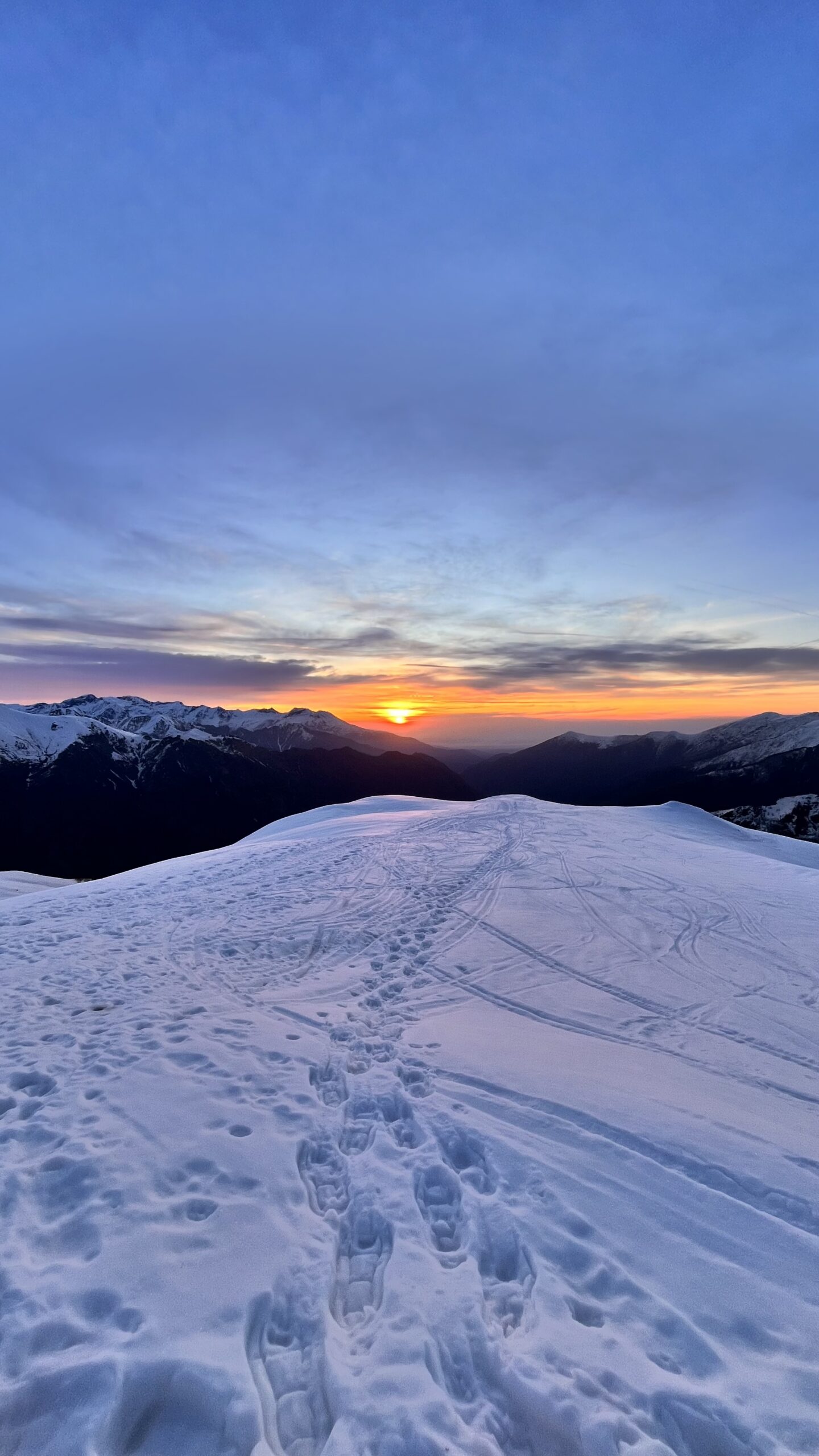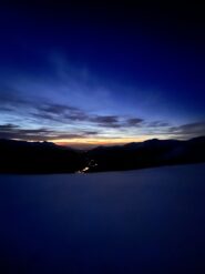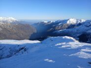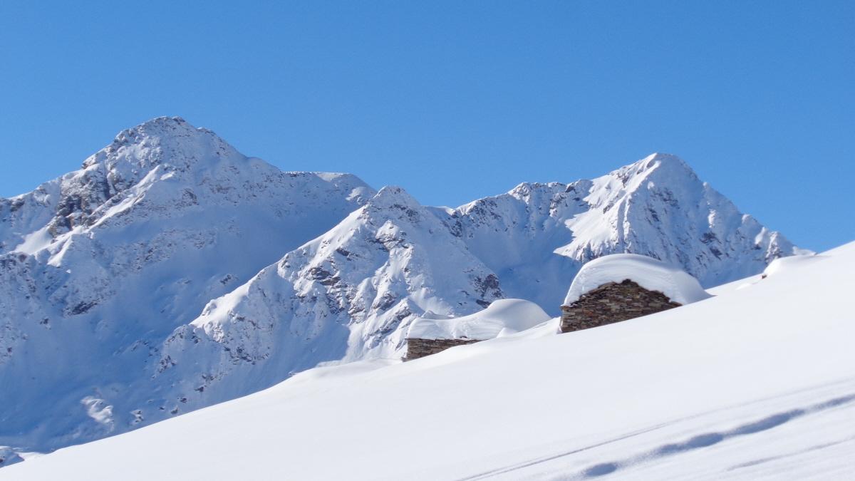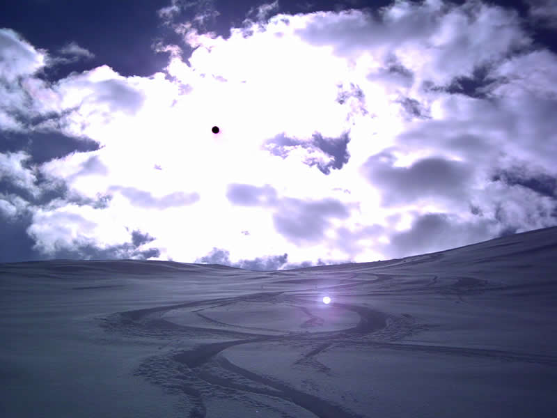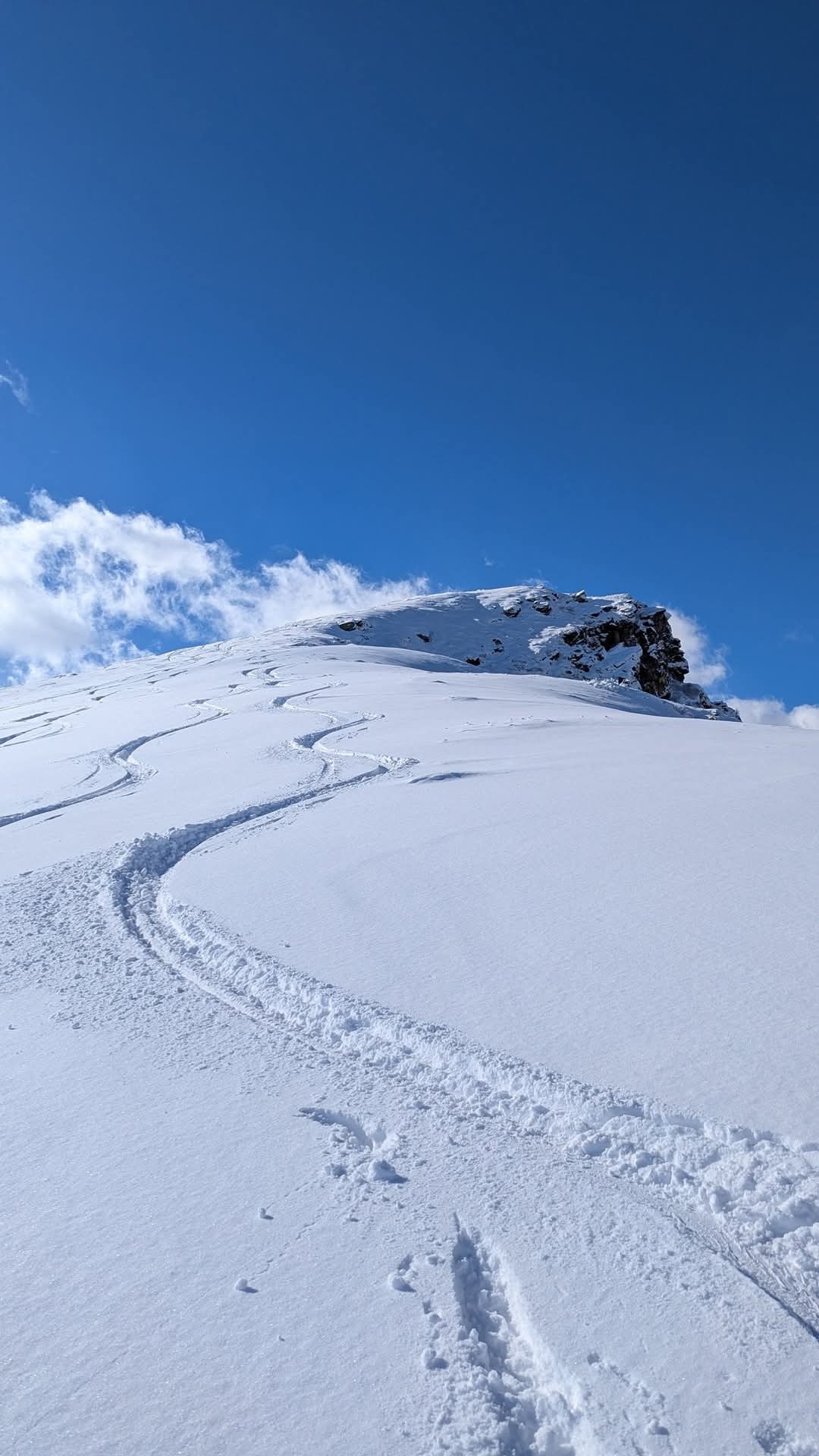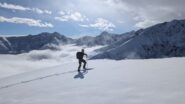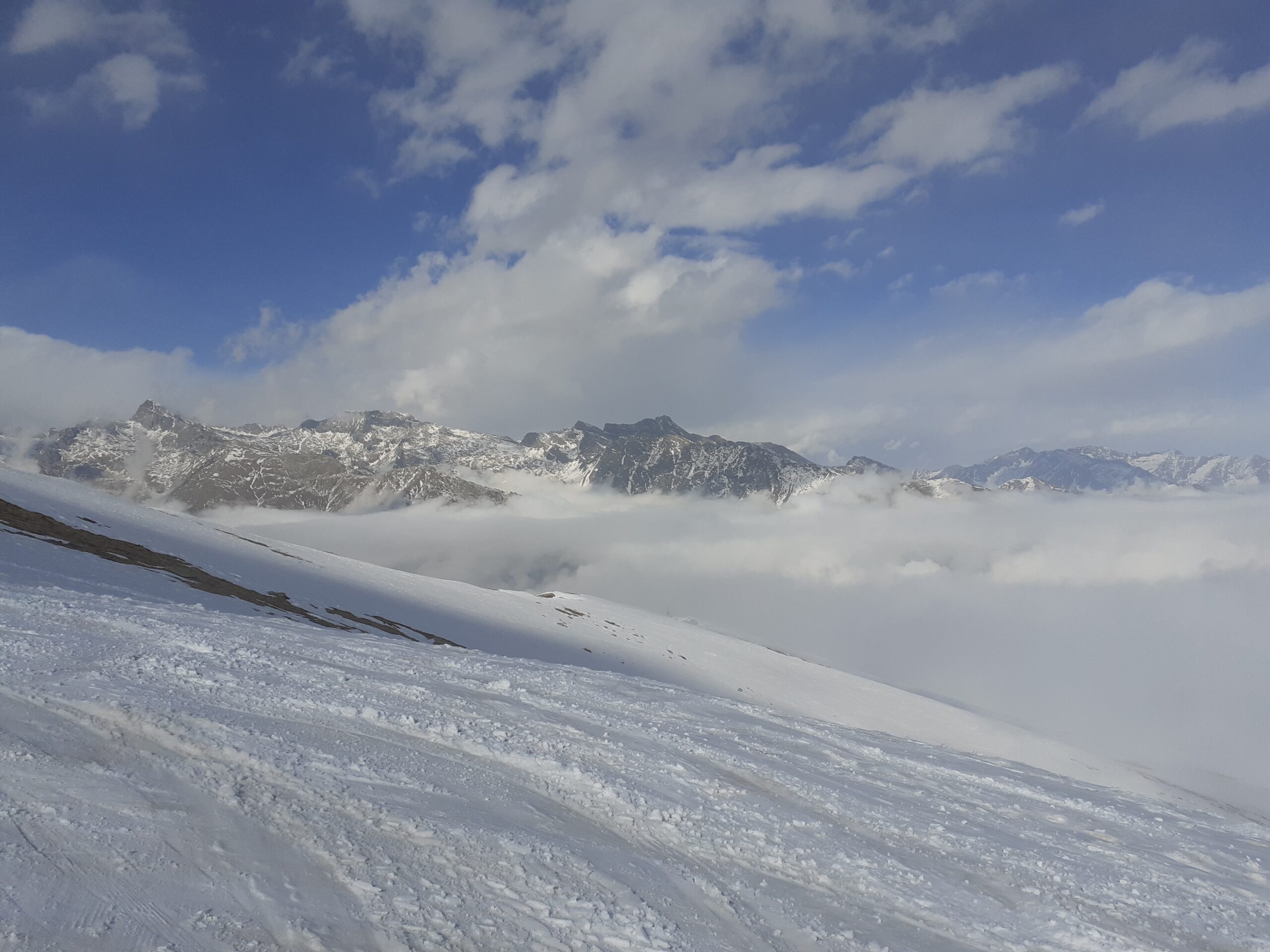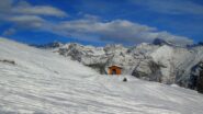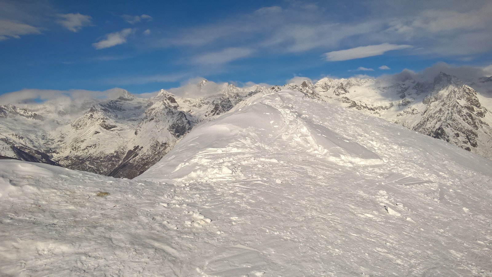 Dal piazzale seguire la pista di discesa più a destra e meno ripida, facendo attenzione agli sciatori.