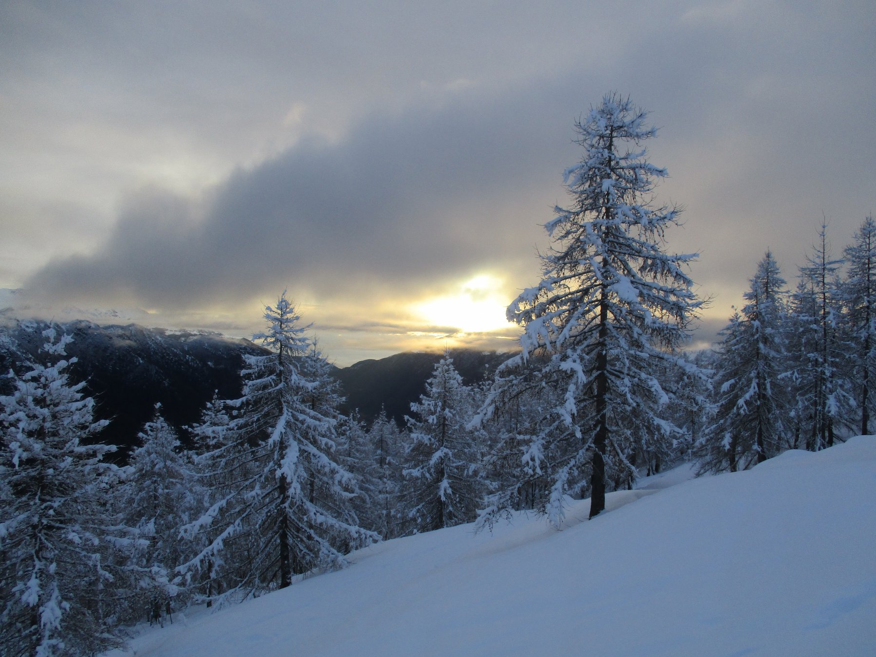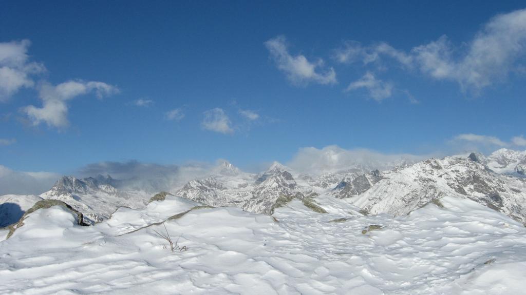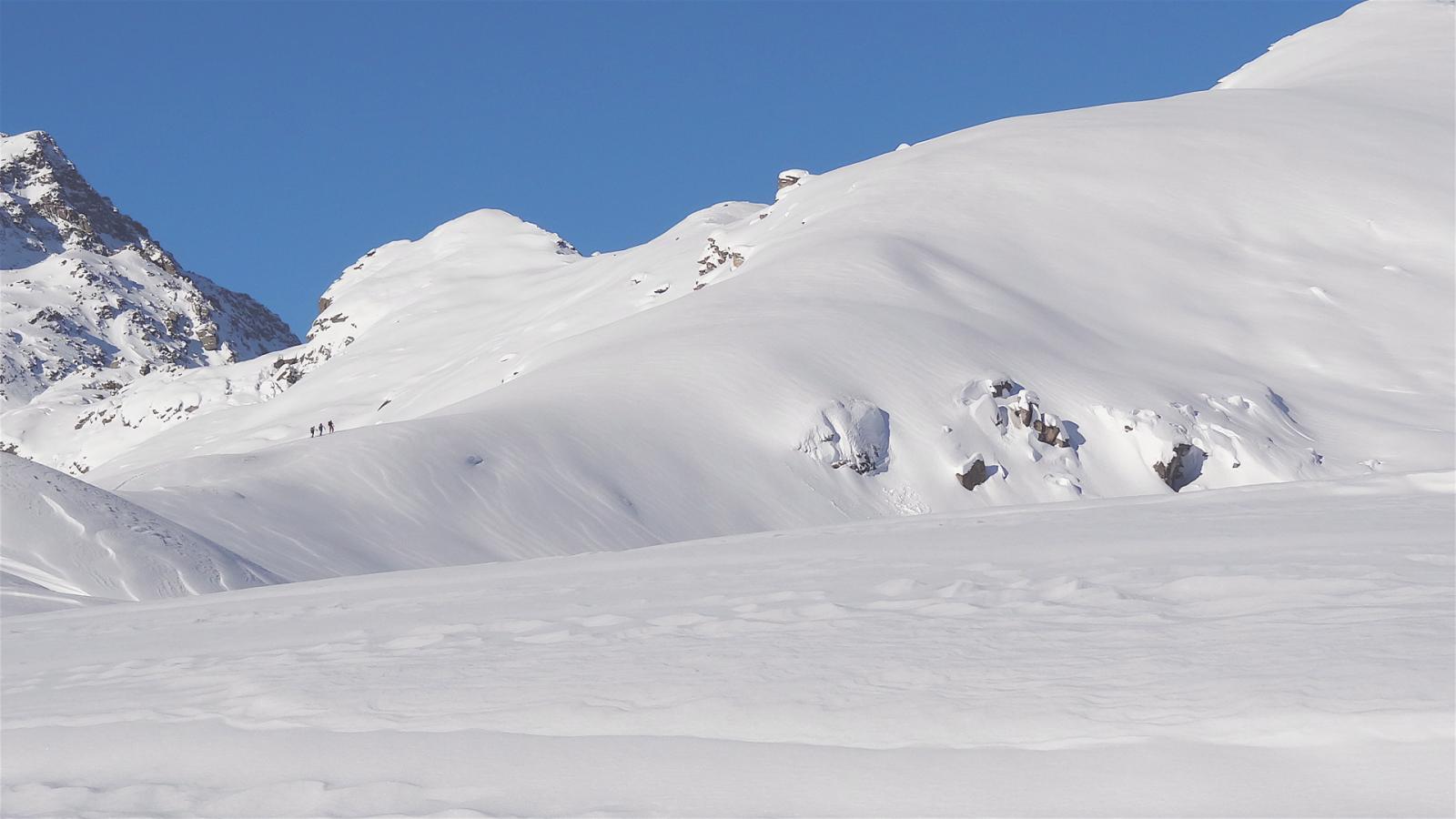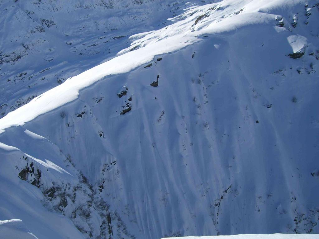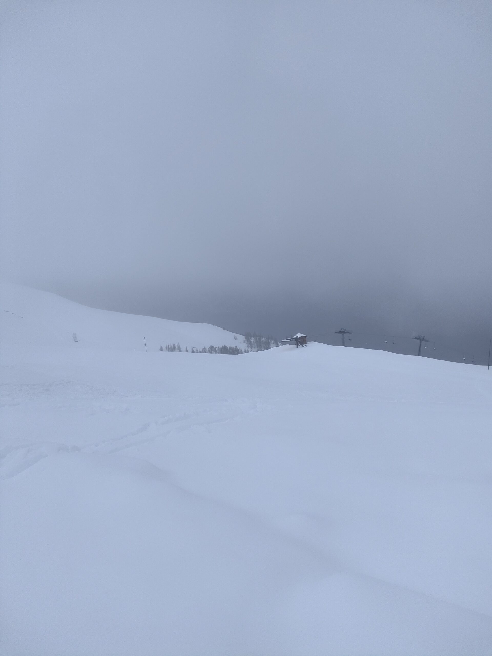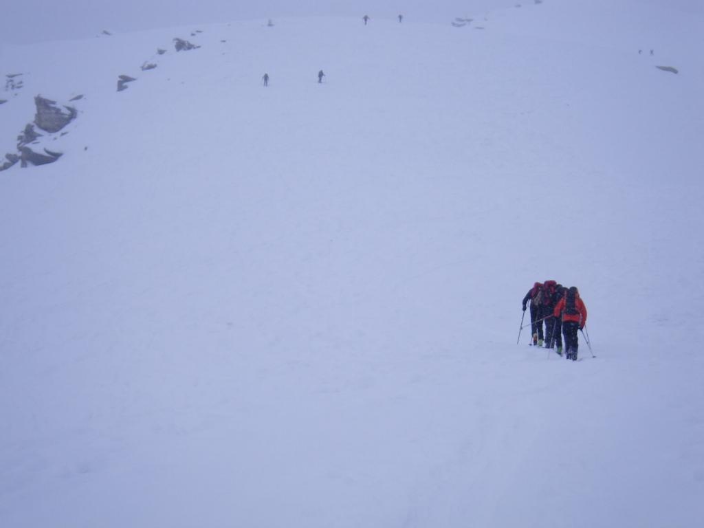 Dal piazzale seguire la pista di discesa più a destra e meno ripida, facendo attenzione agli sciatori.