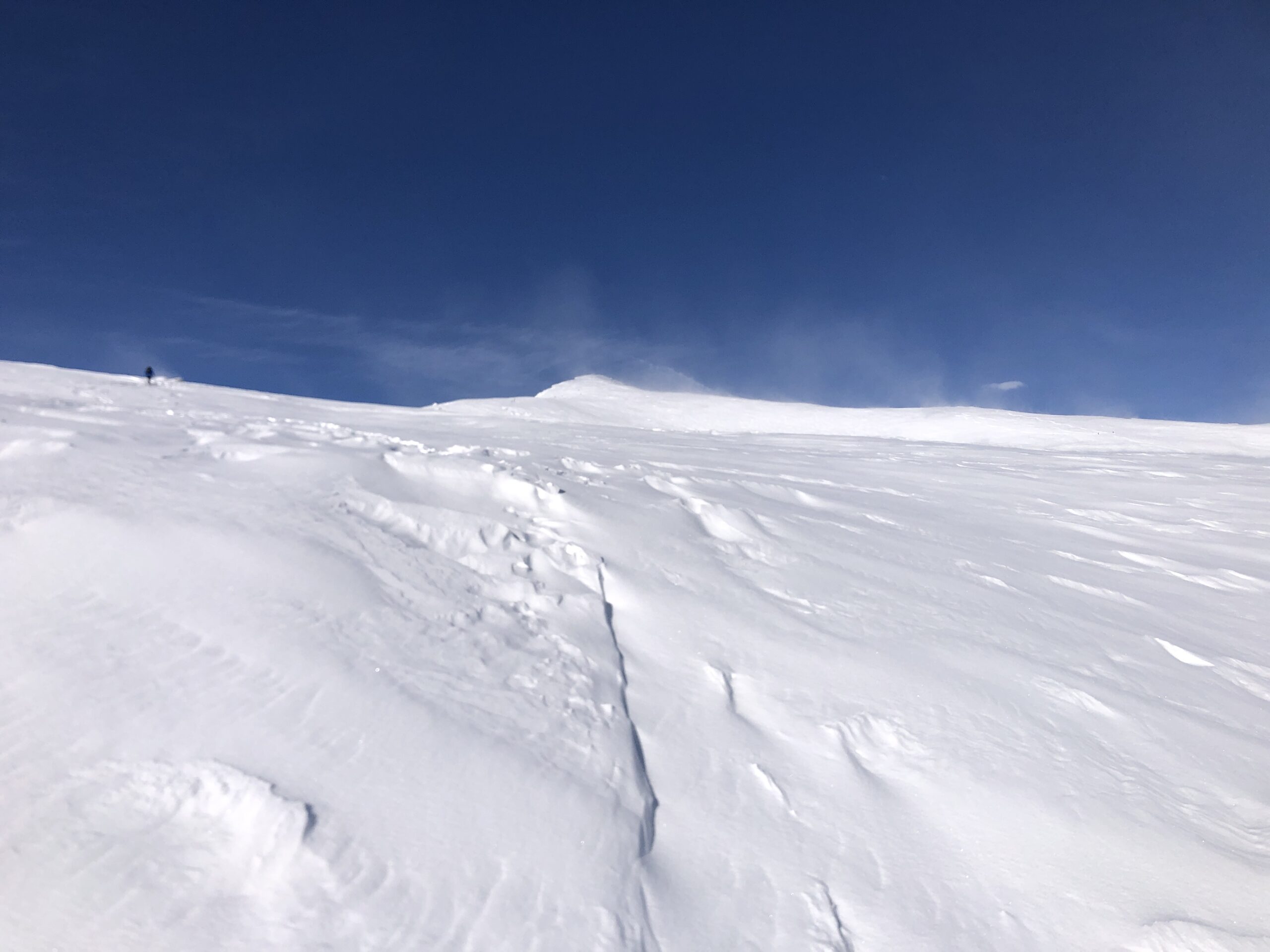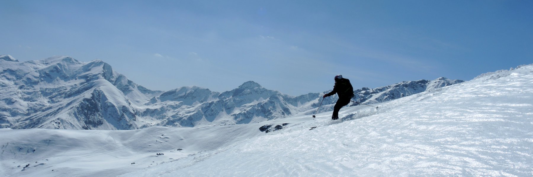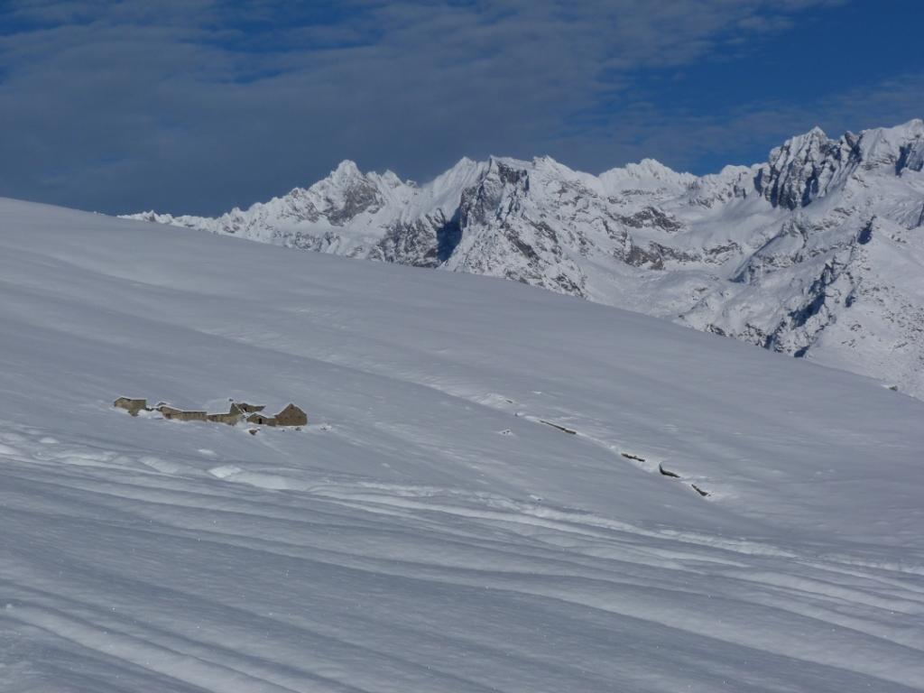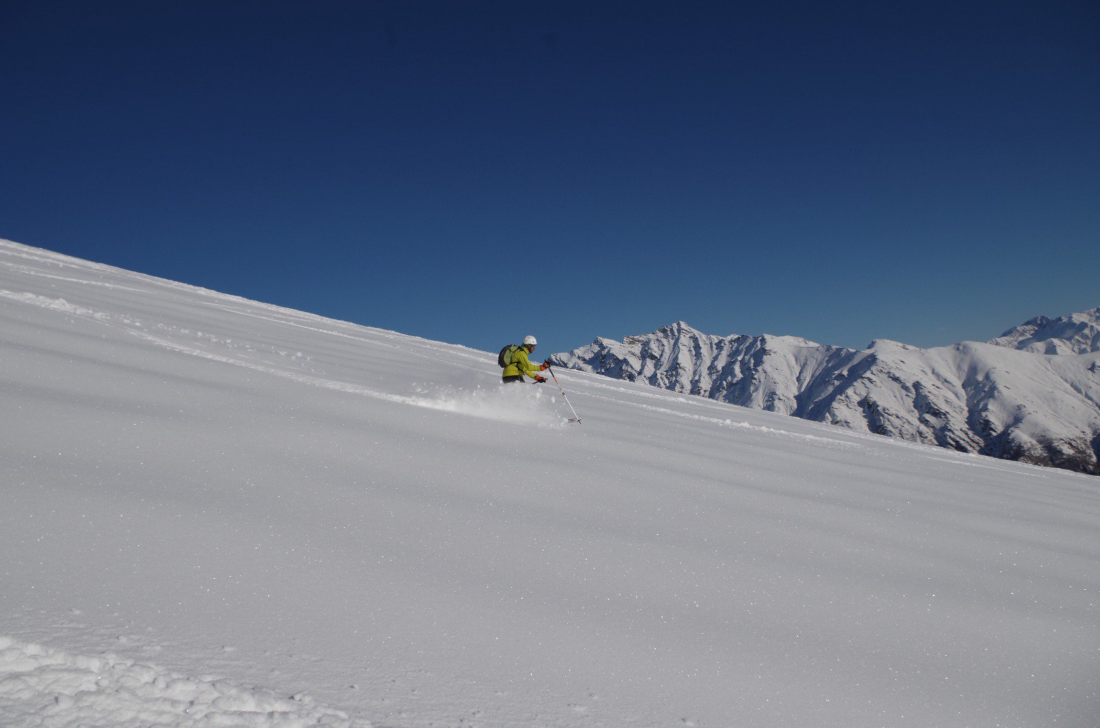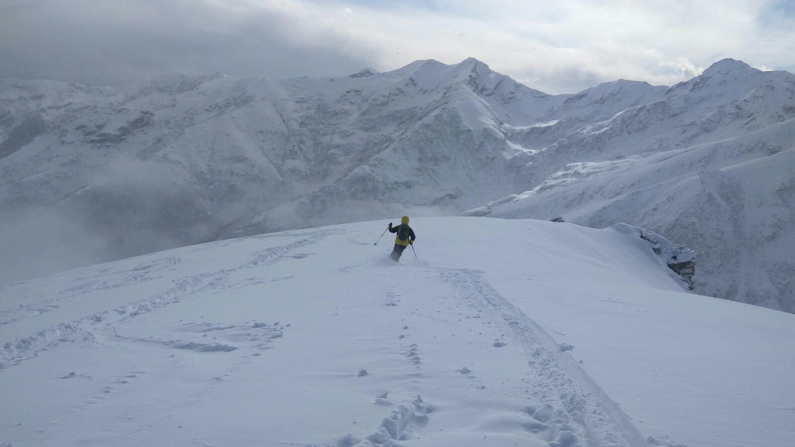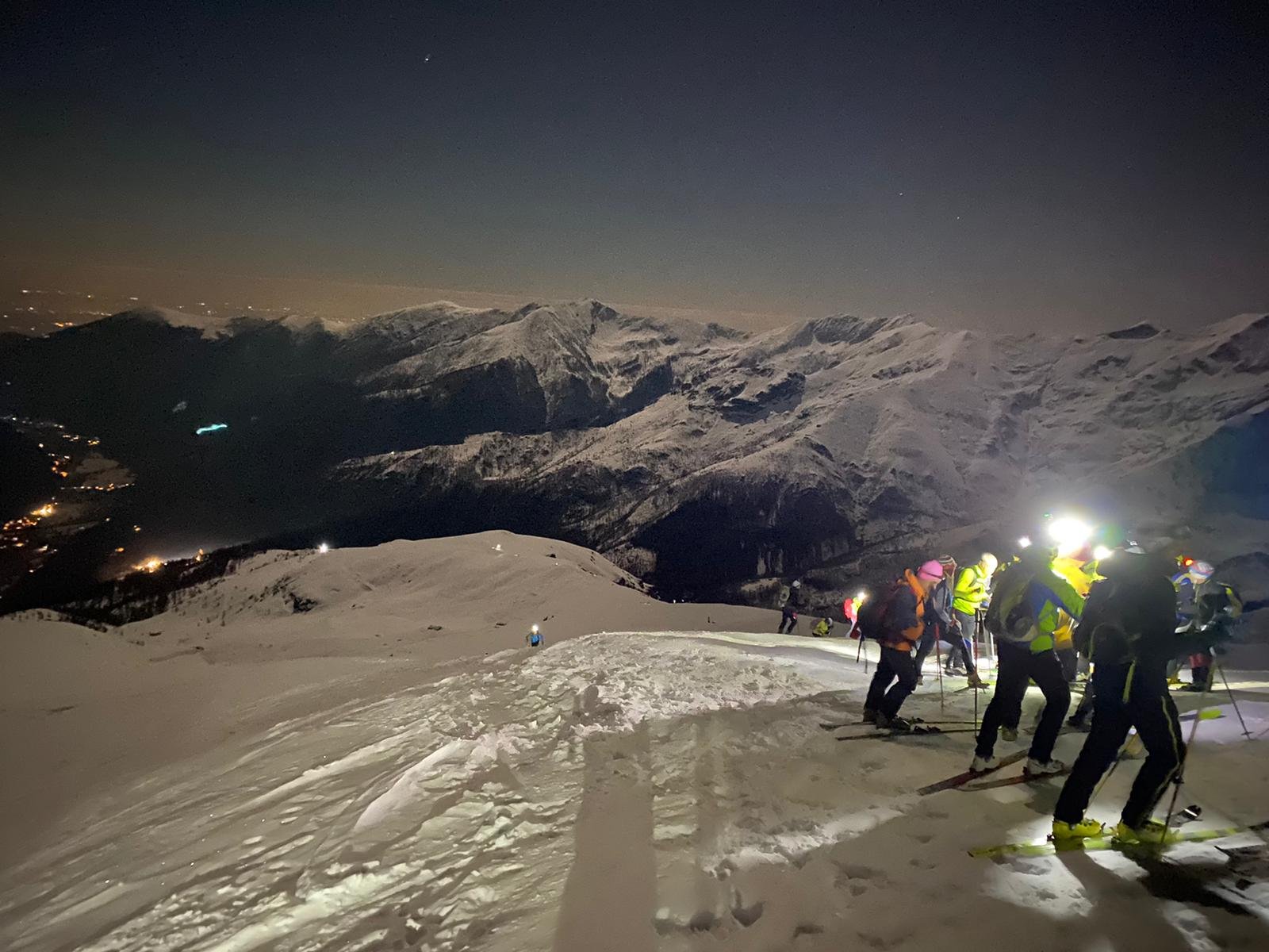 Dal piazzale seguire la pista di discesa più a destra e meno ripida, facendo attenzione agli sciatori.