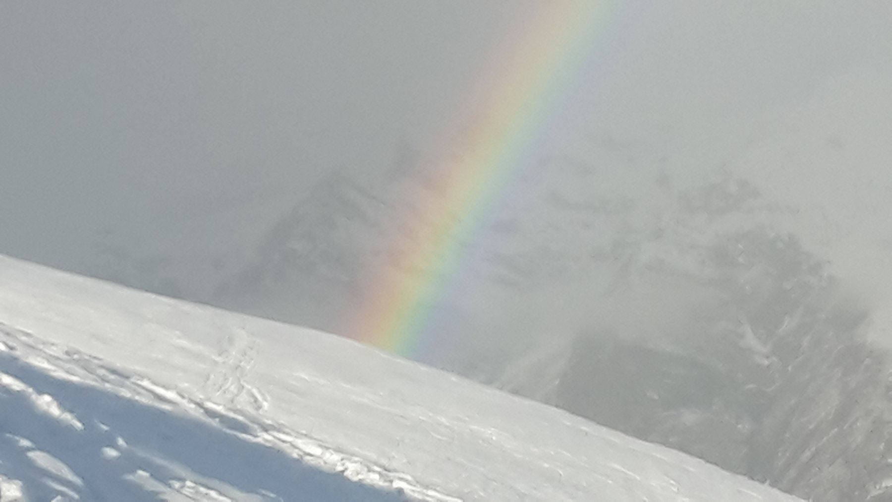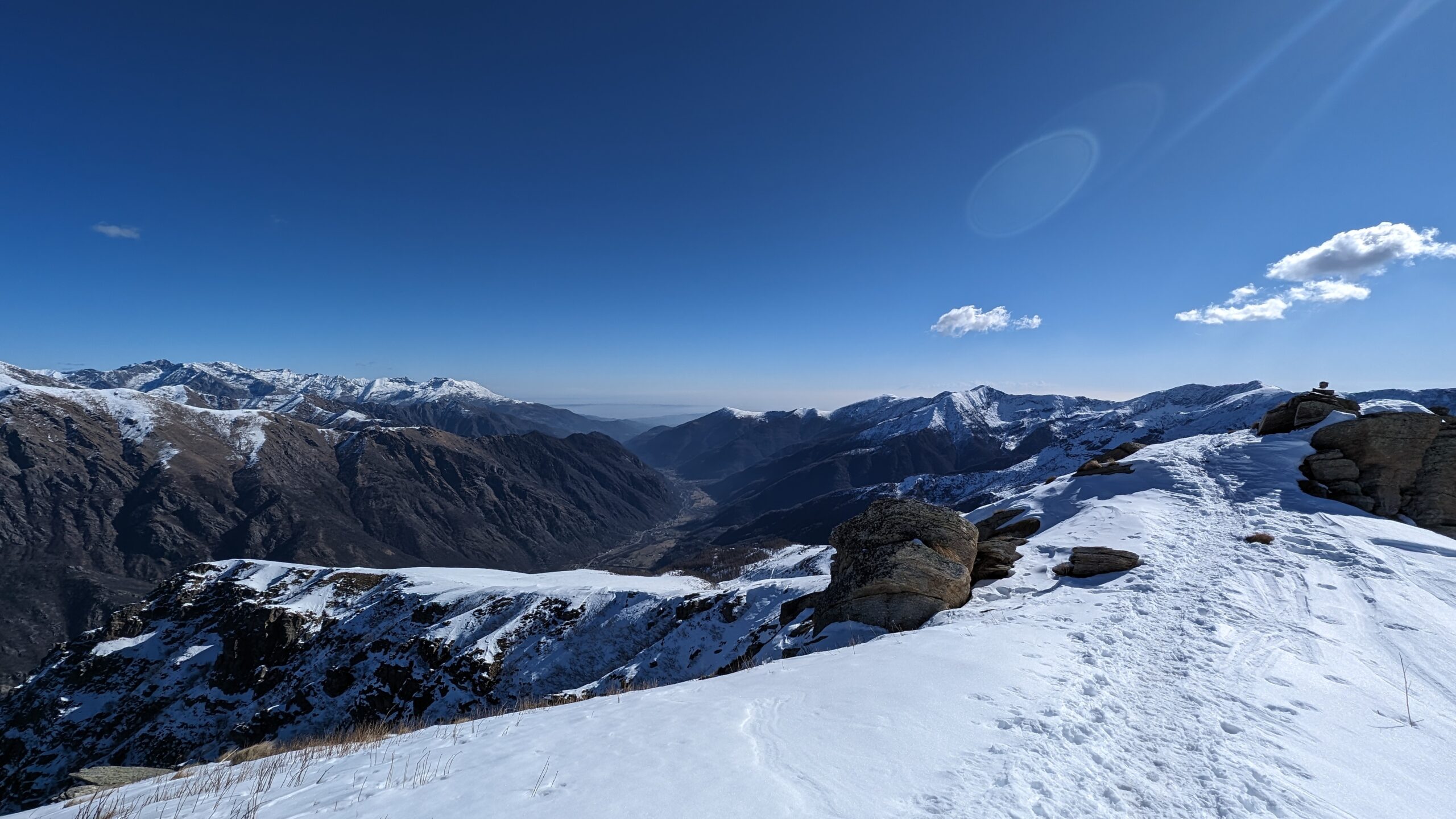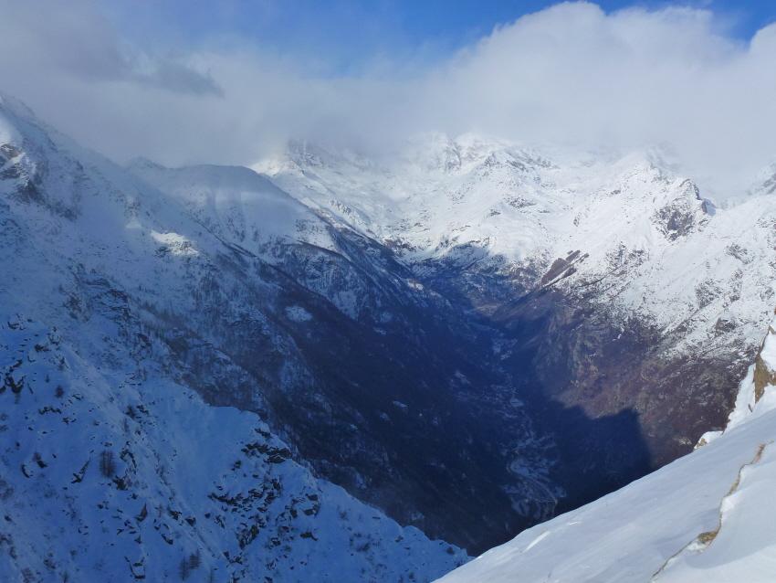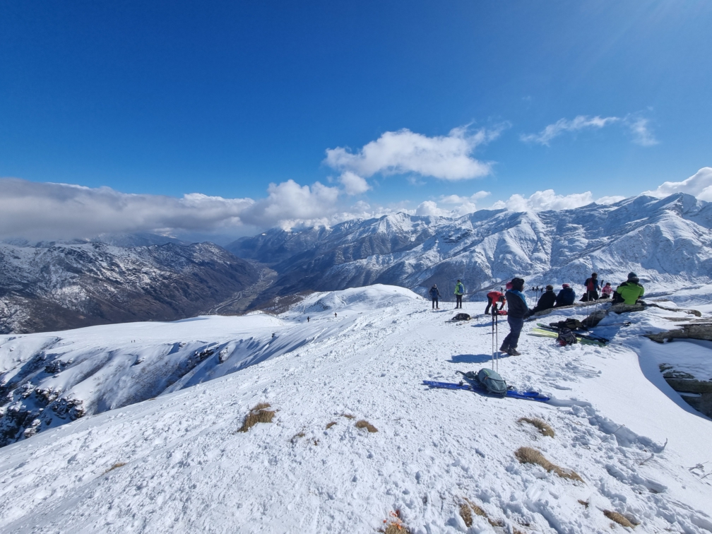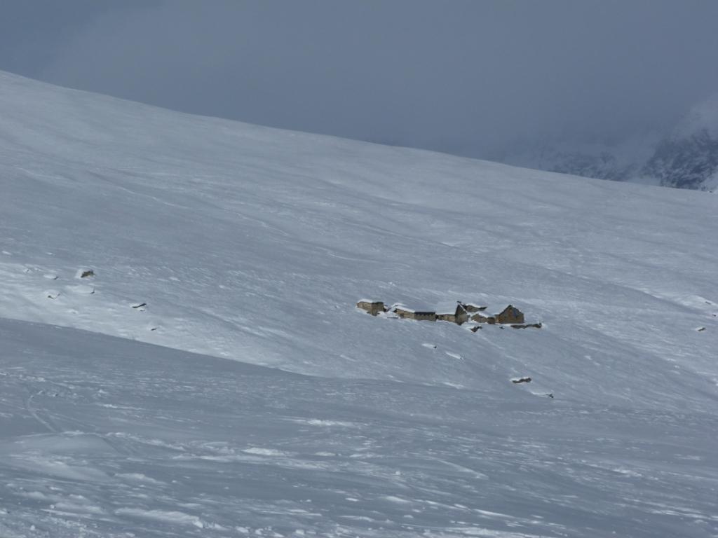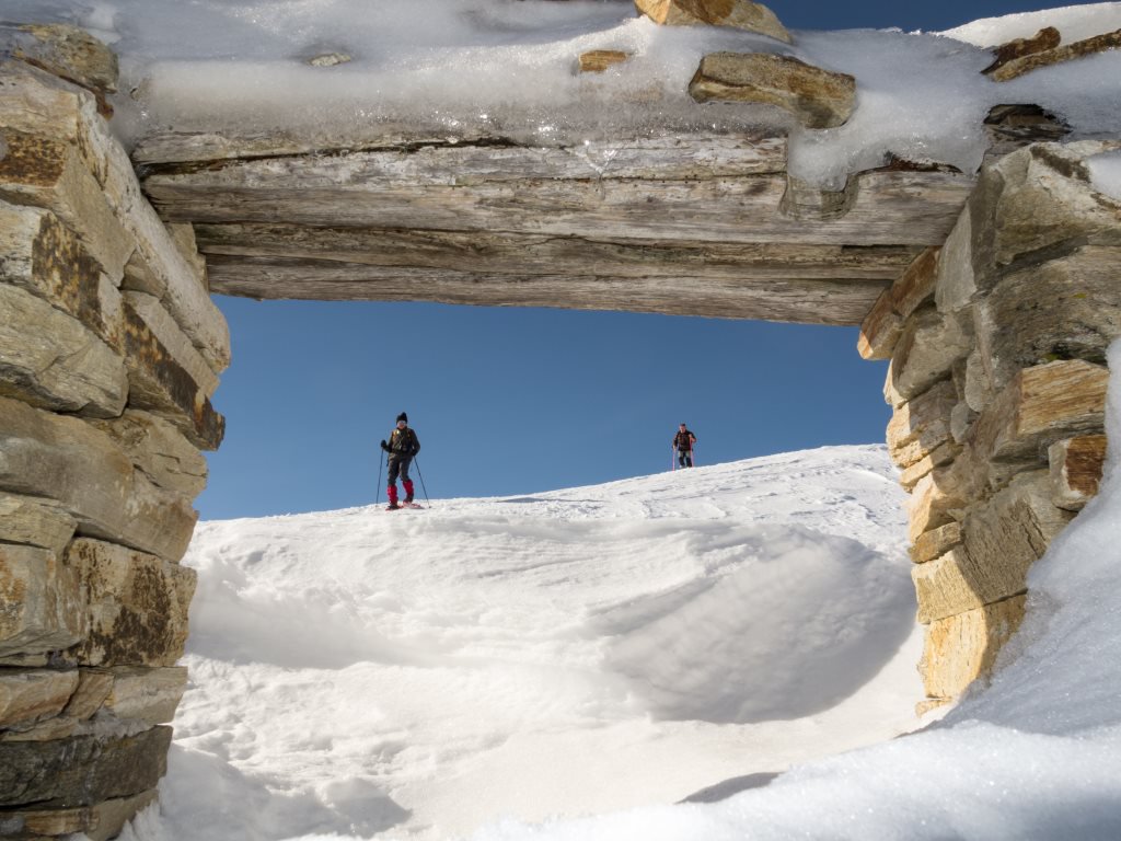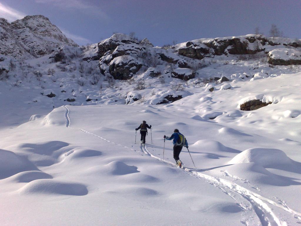 Dal piazzale seguire la pista di discesa più a destra e meno ripida, facendo attenzione agli sciatori.