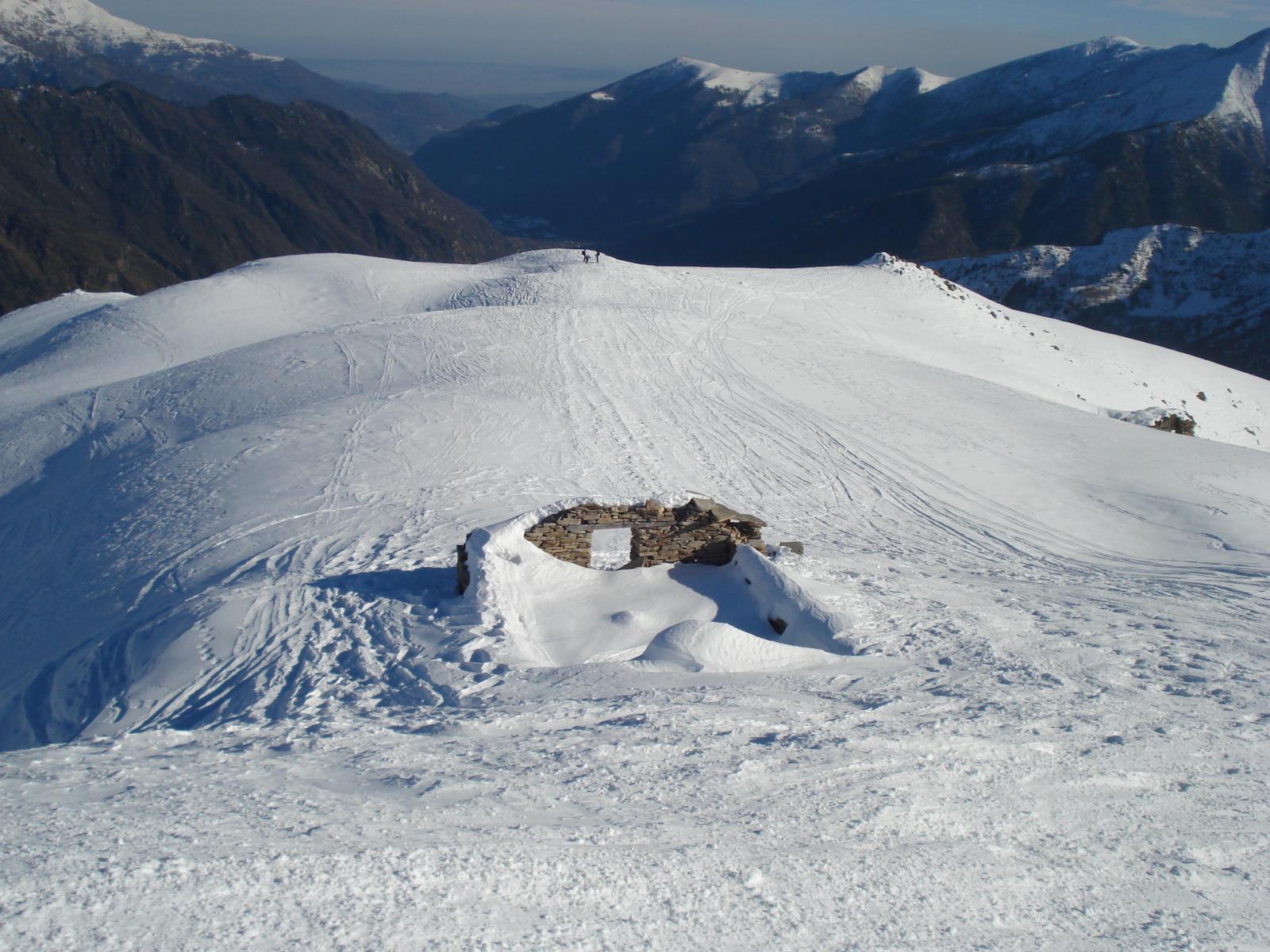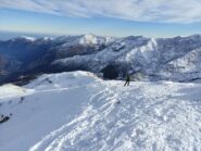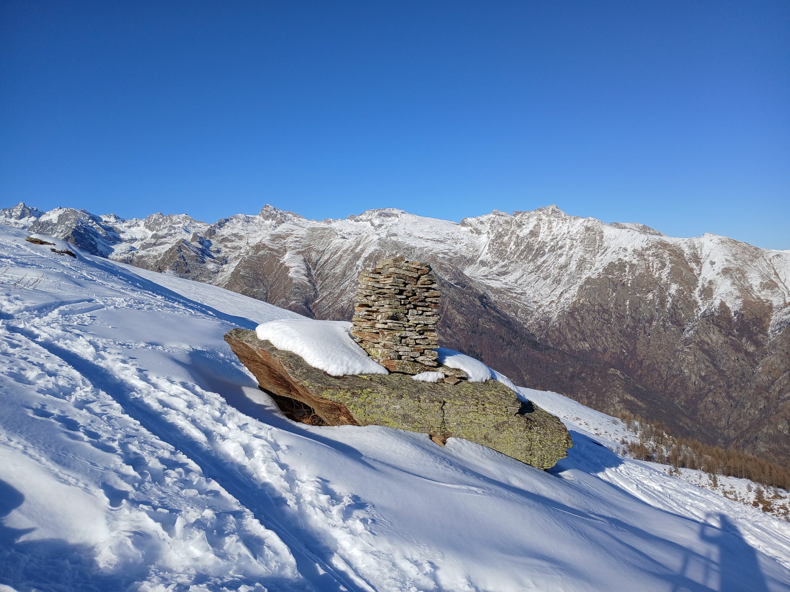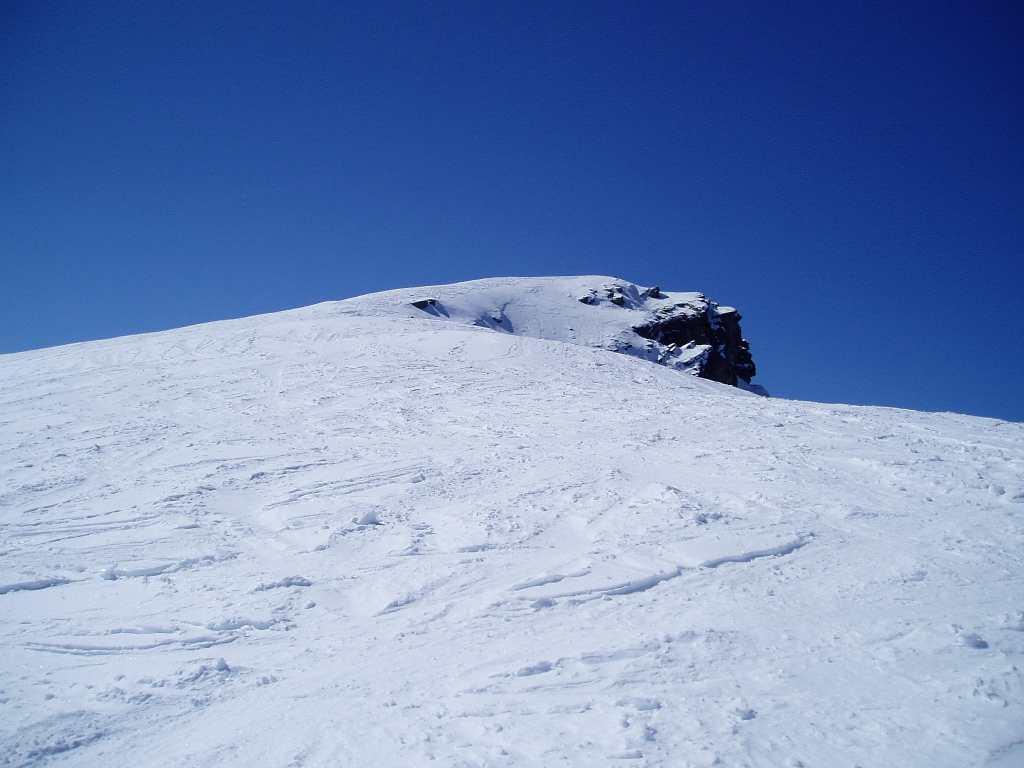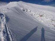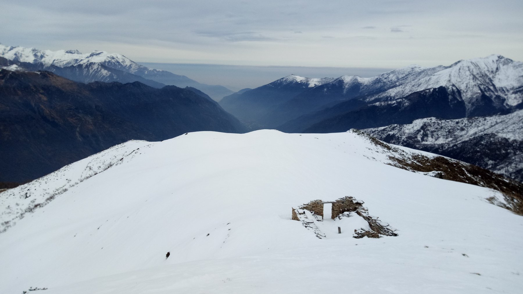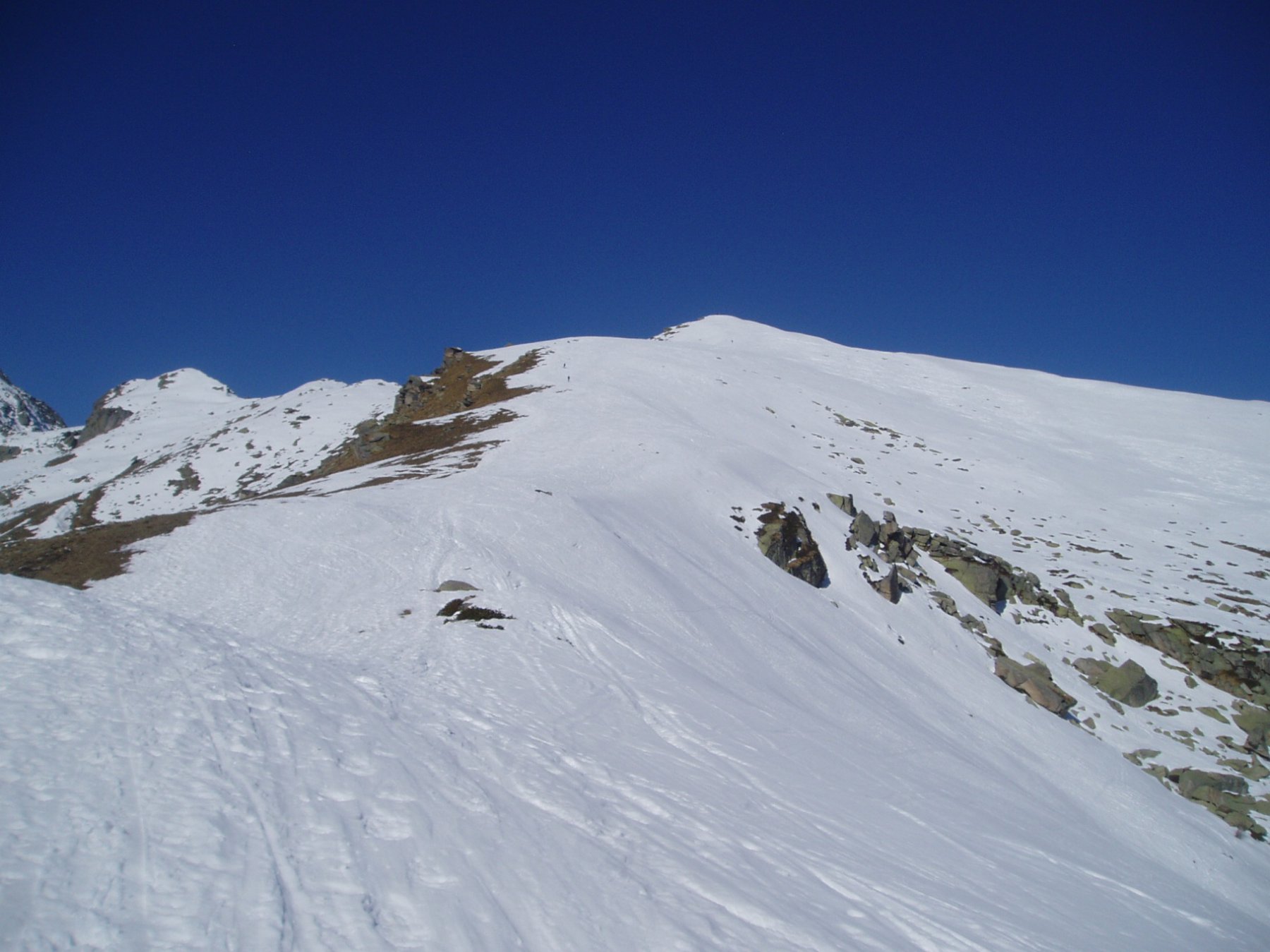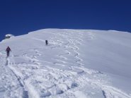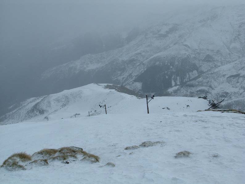 Dopo aver passato un gruppo di baite la dorsale si fa più stretta e conduce alla cima dove ancora si trova il pilone terminale di un vecchio impianto.