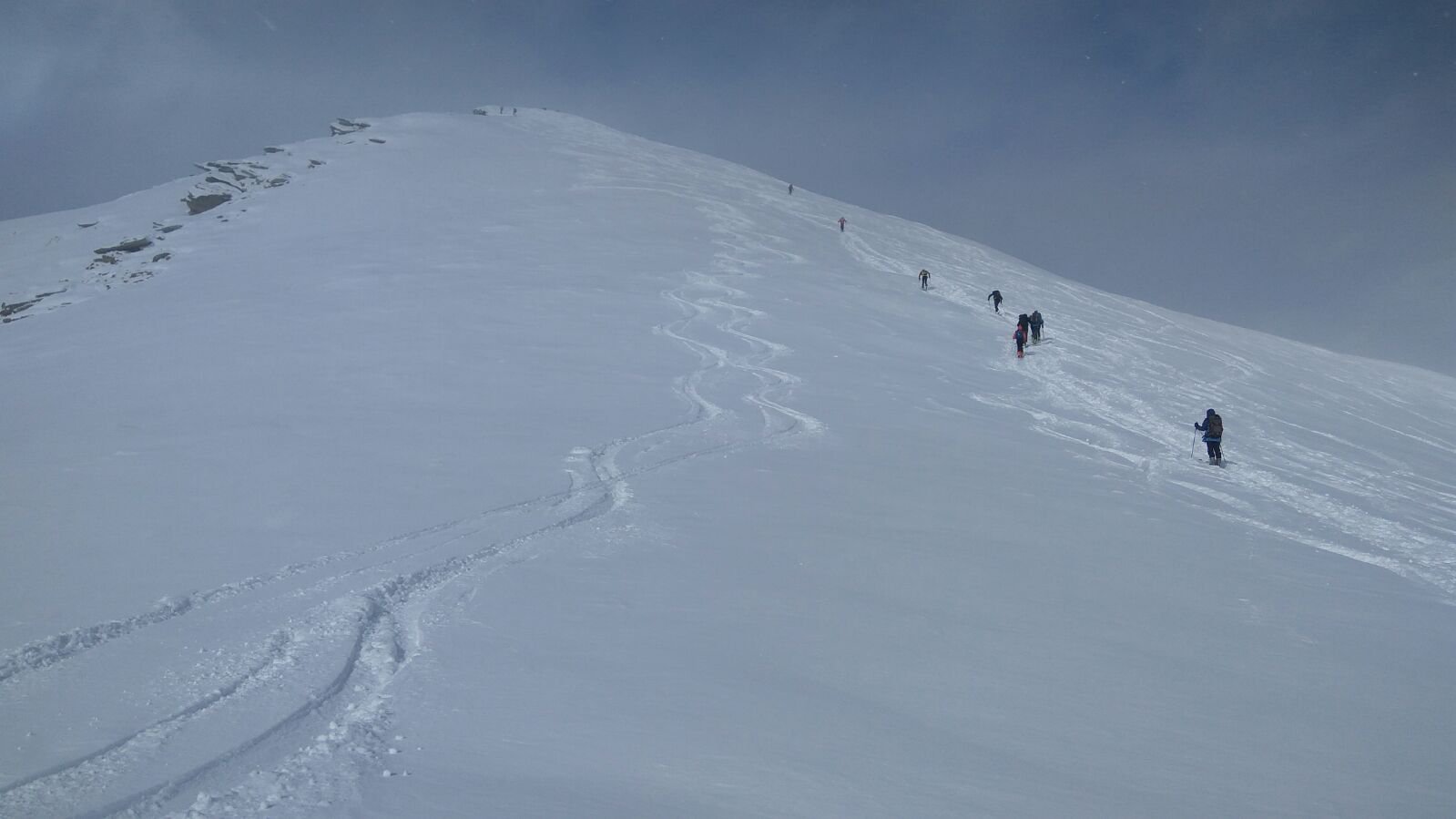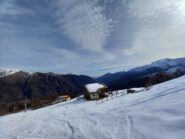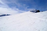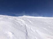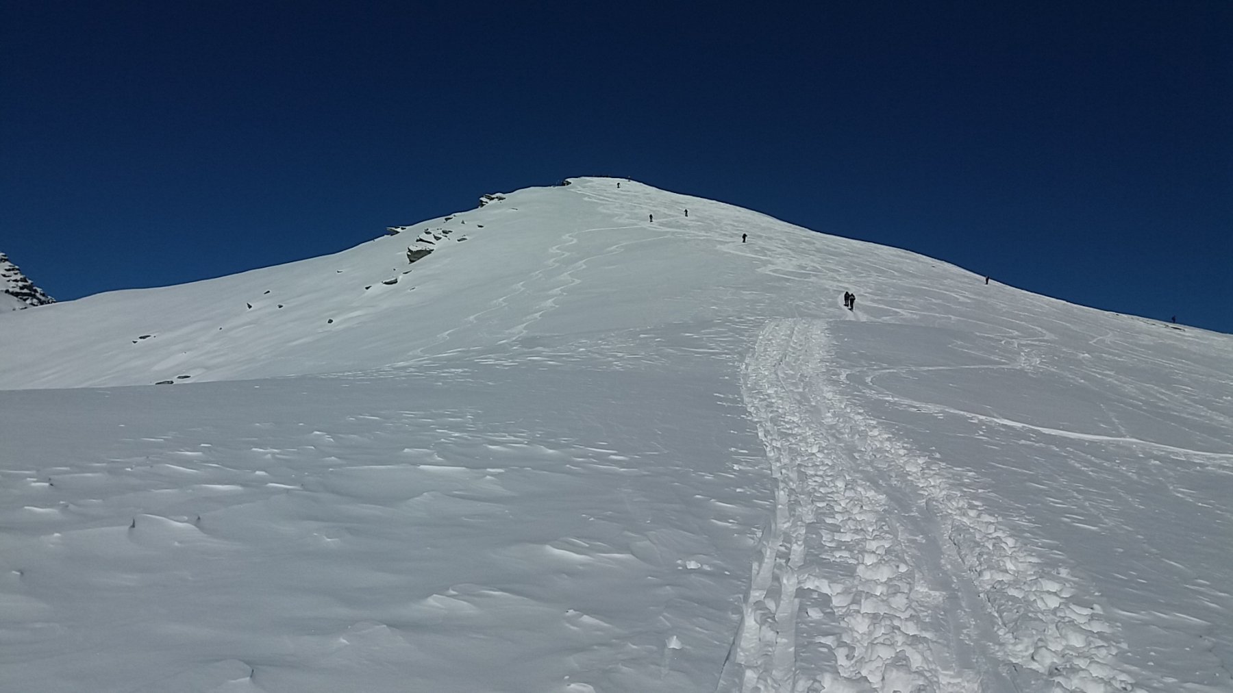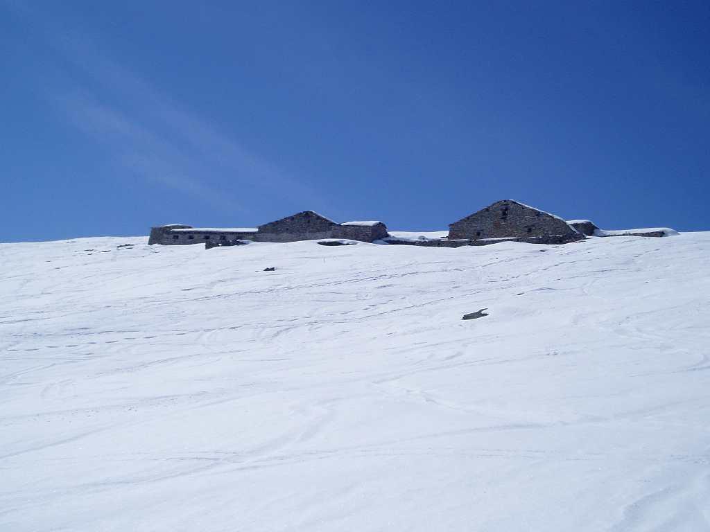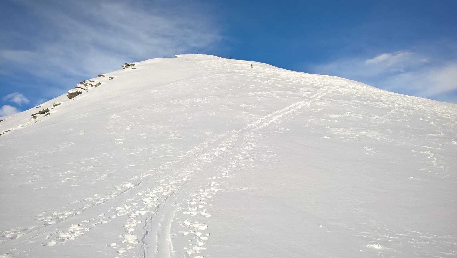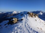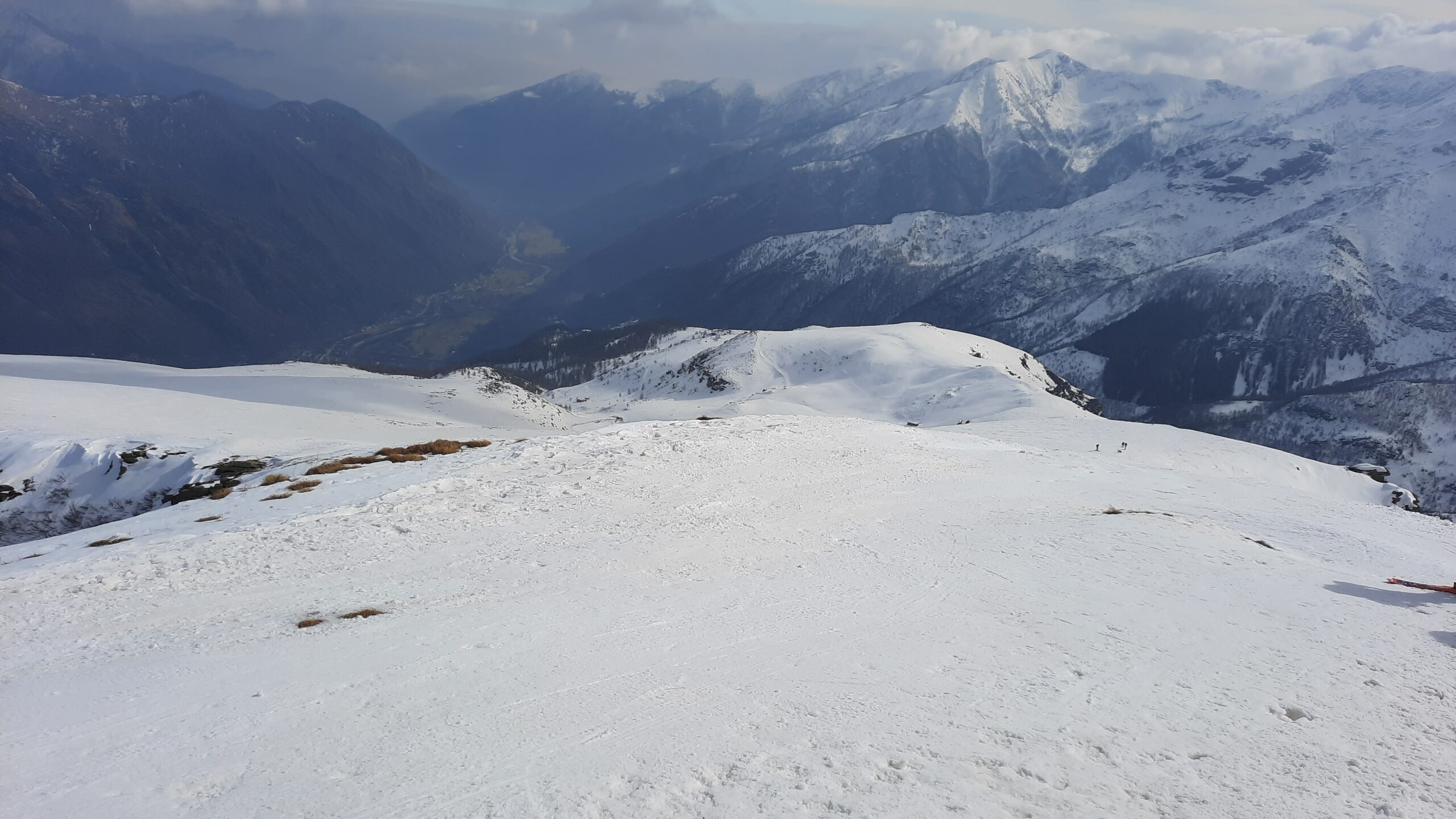 Dopo aver passato un gruppo di baite la dorsale si fa più stretta e conduce alla cima dove ancora si trova il pilone terminale di un vecchio impianto.
