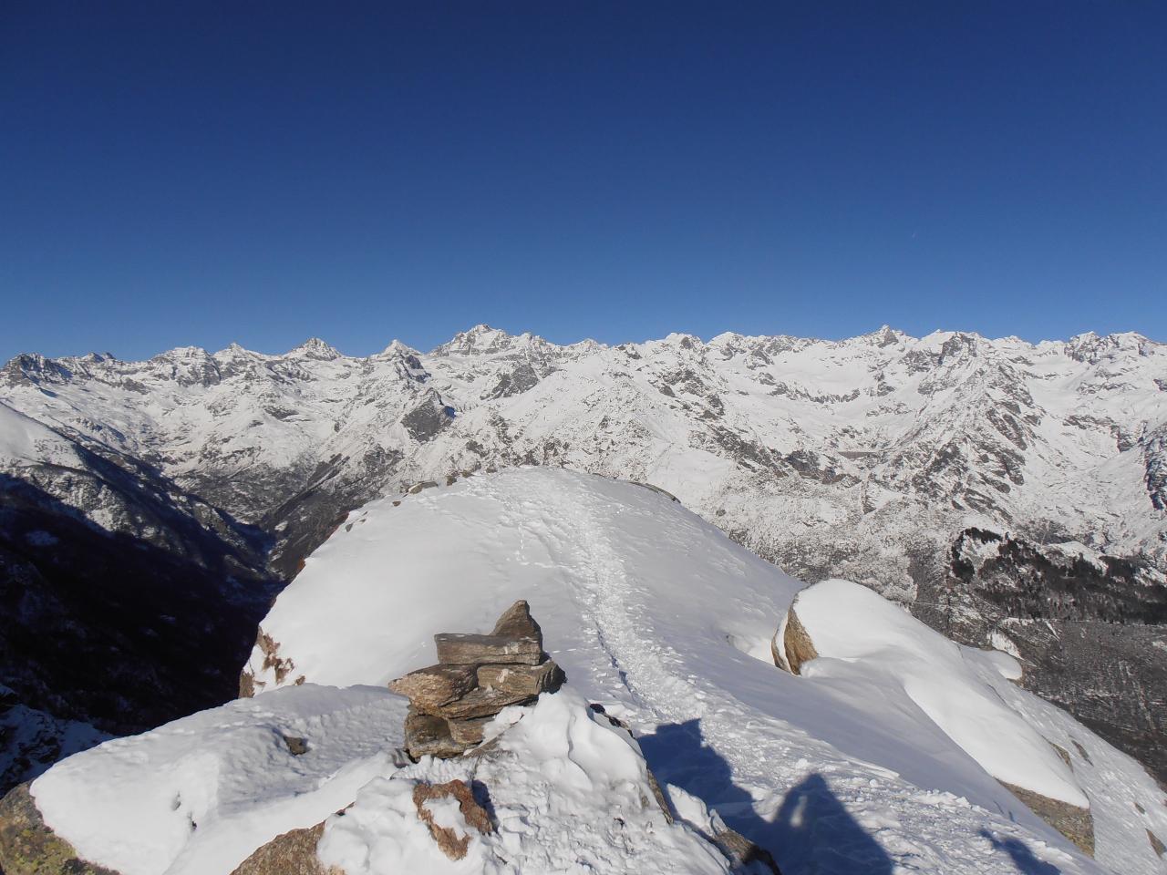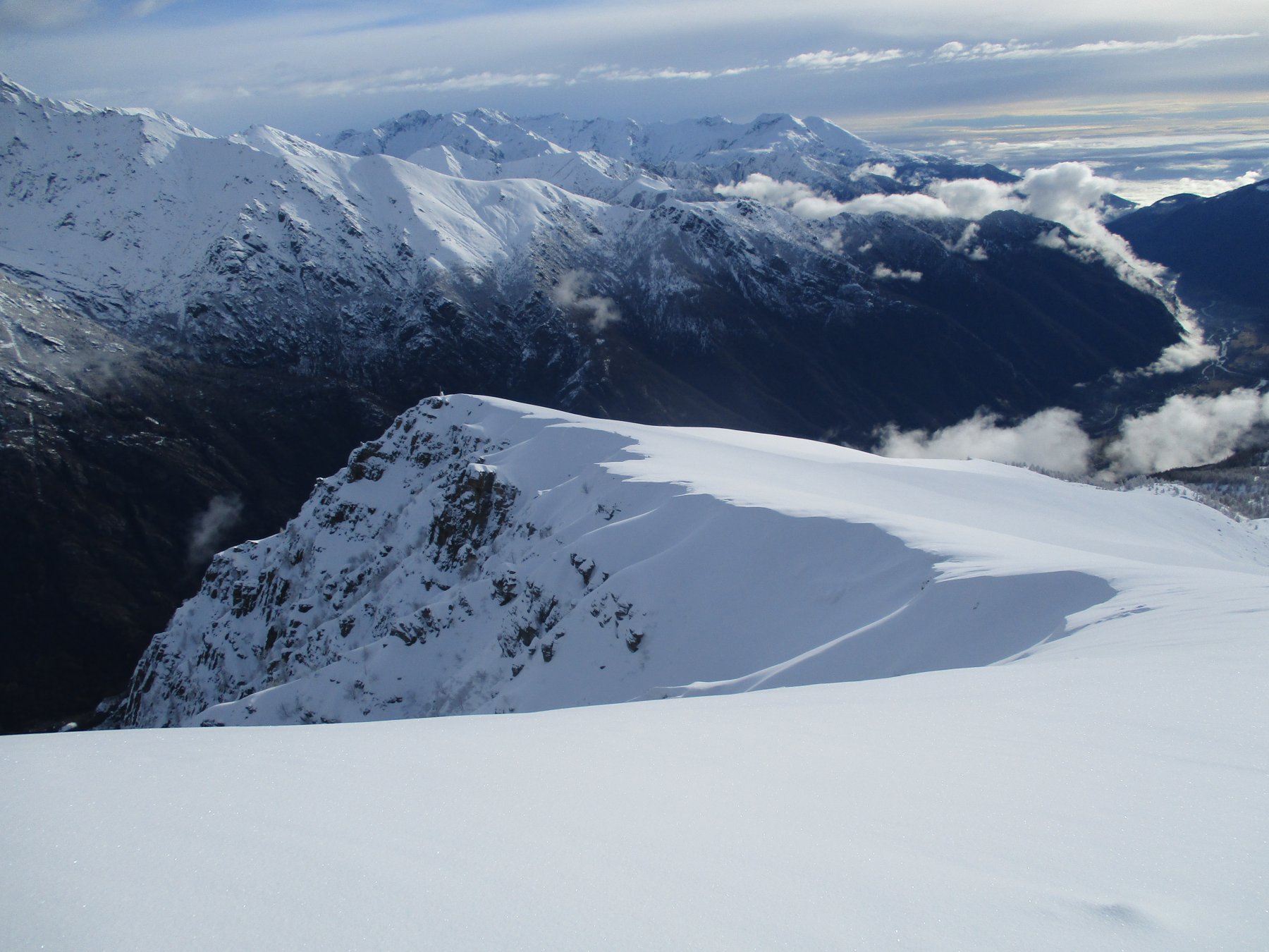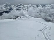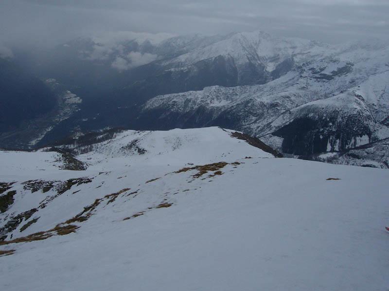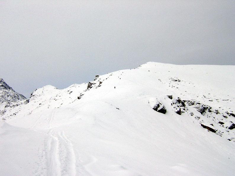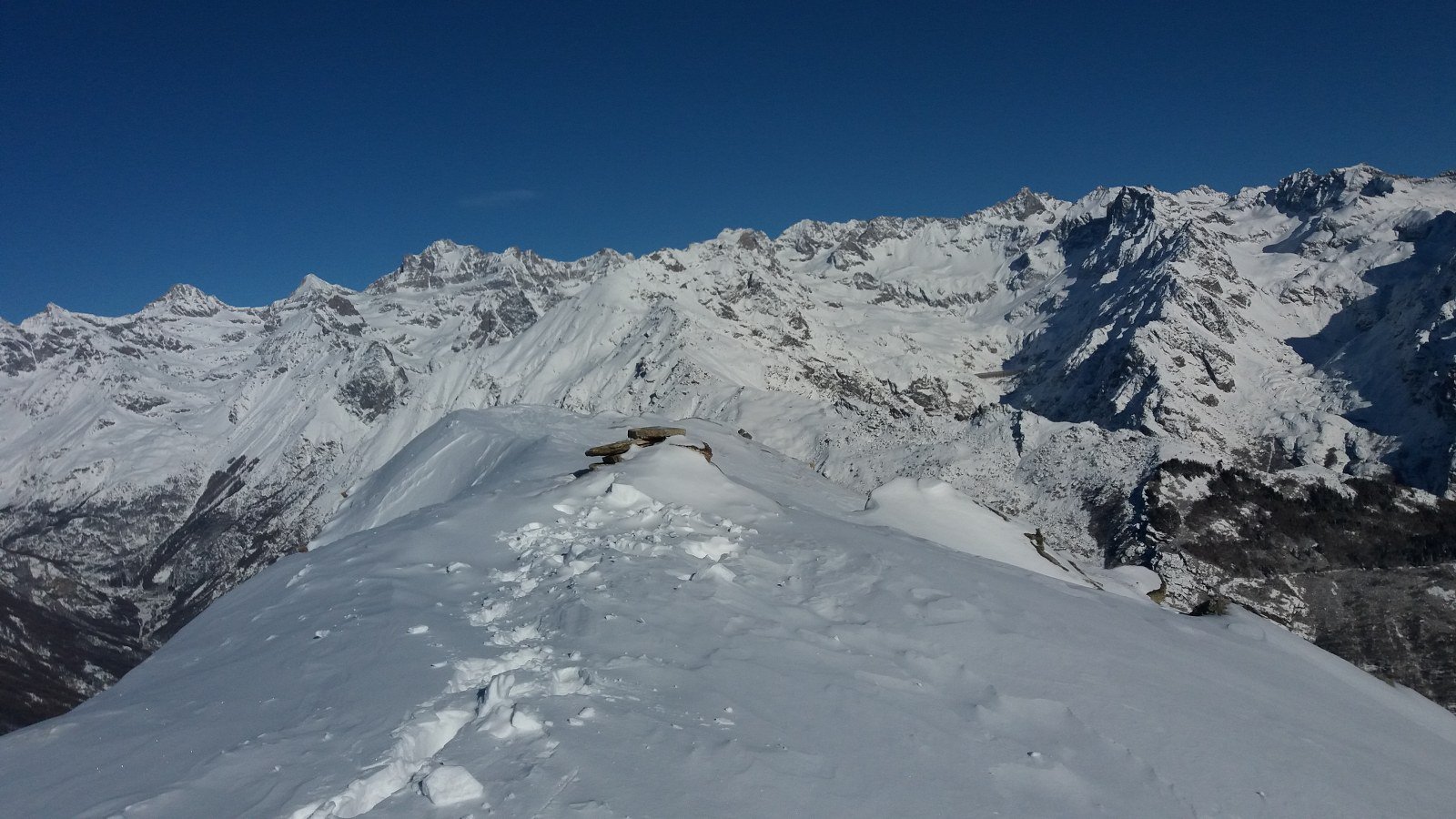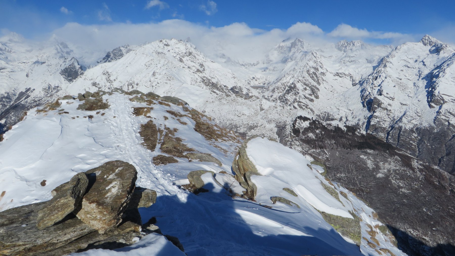 Dopo aver passato un gruppo di baite la dorsale si fa più stretta e conduce alla cima dove ancora si trova il pilone terminale di un vecchio impianto.