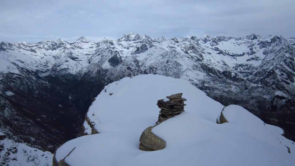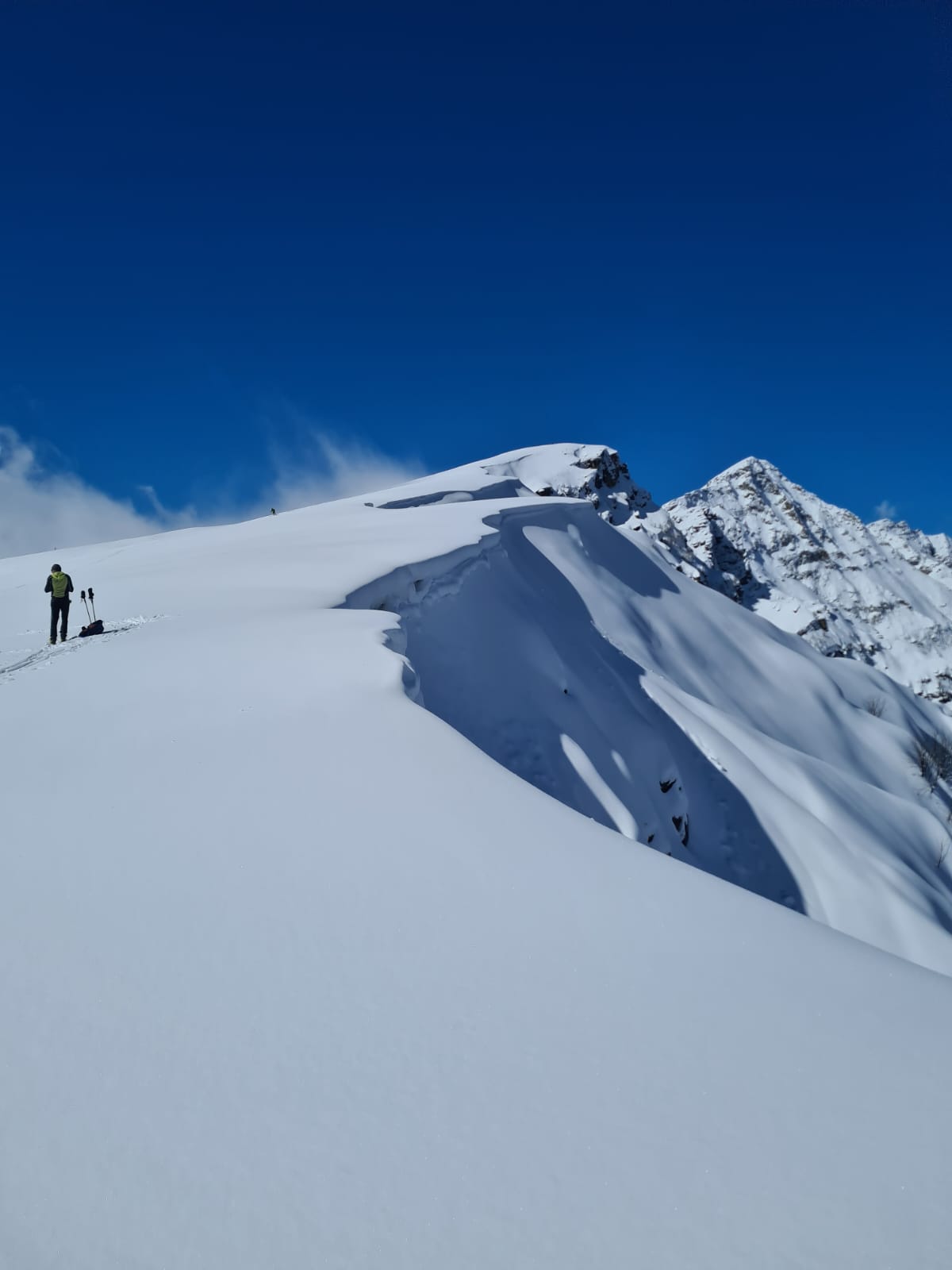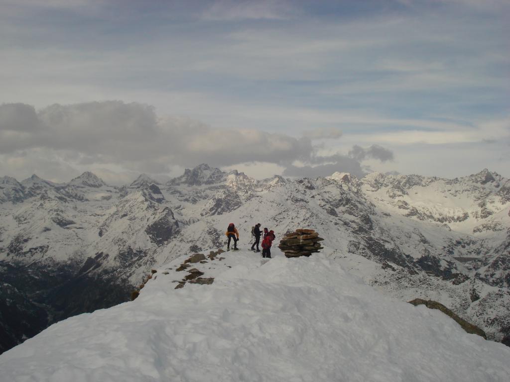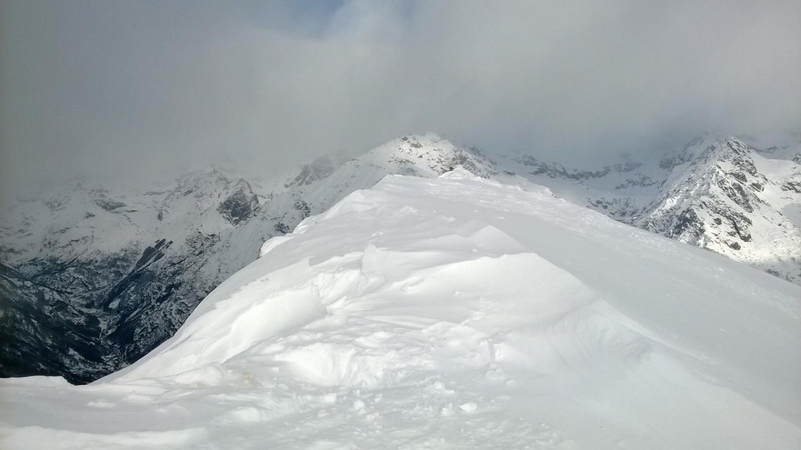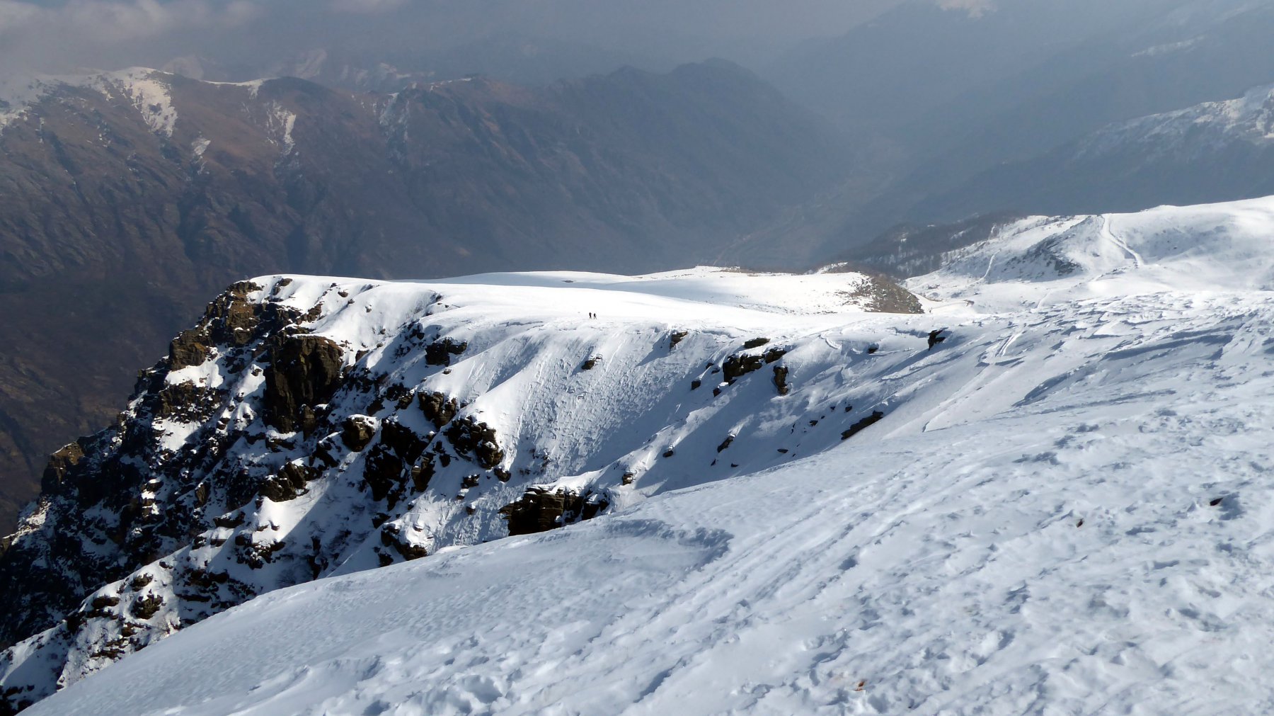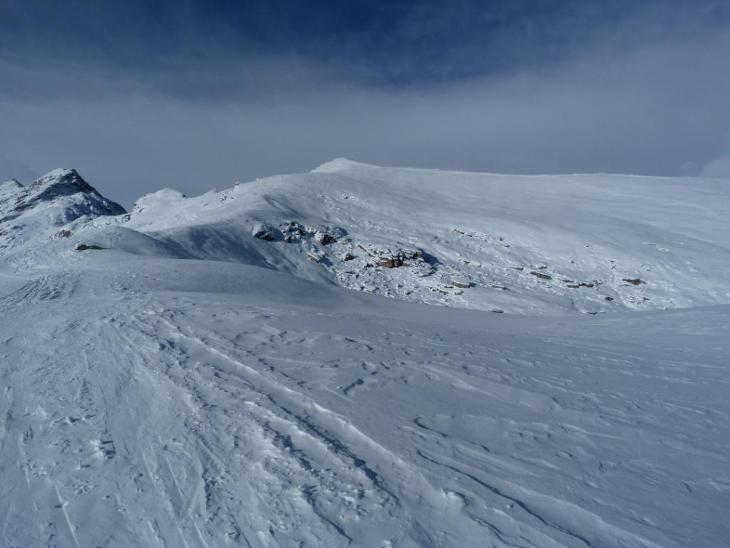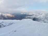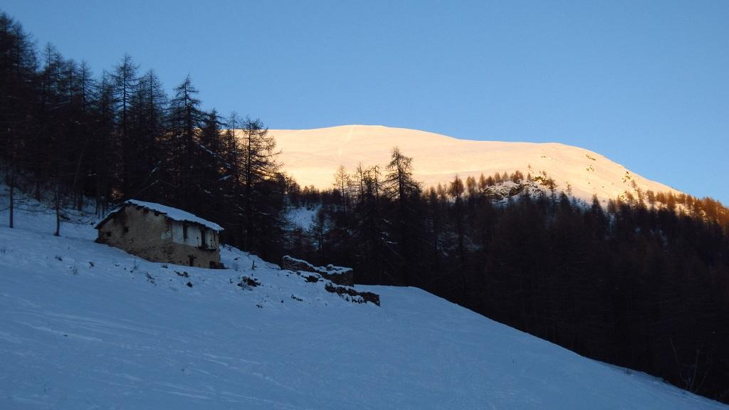 Dopo aver passato un gruppo di baite la dorsale si fa più stretta e conduce alla cima dove ancora si trova il pilone terminale di un vecchio impianto.
