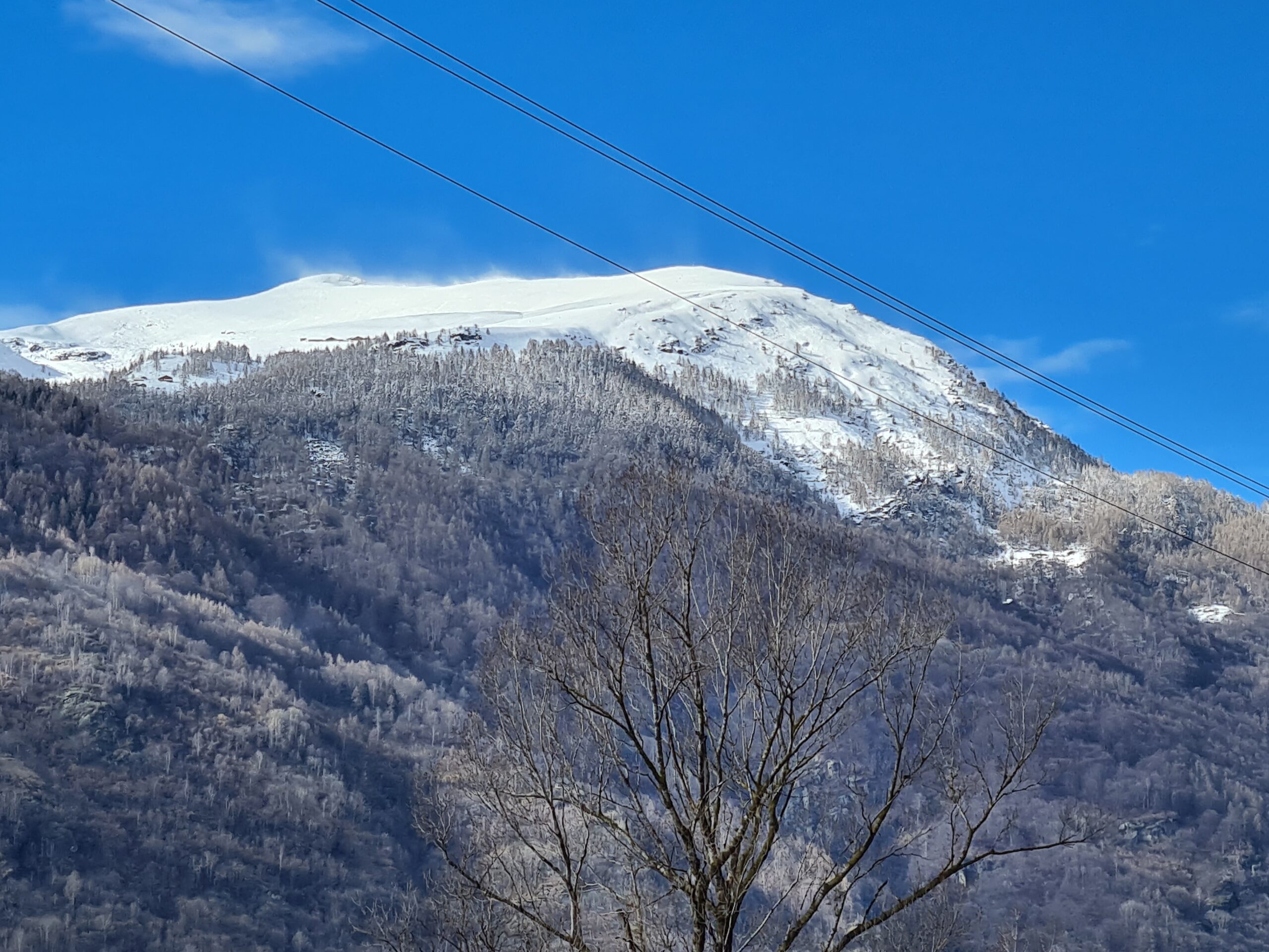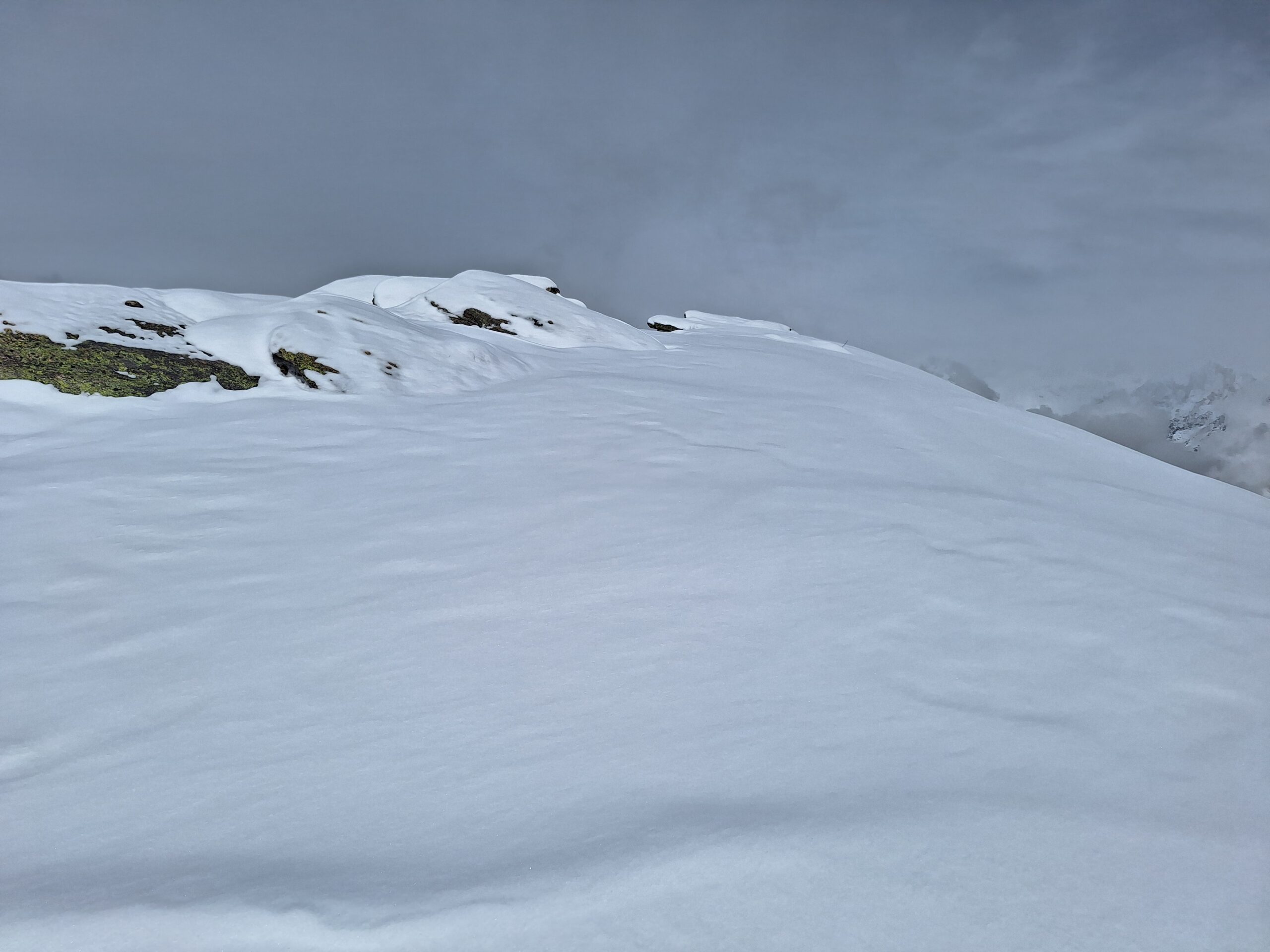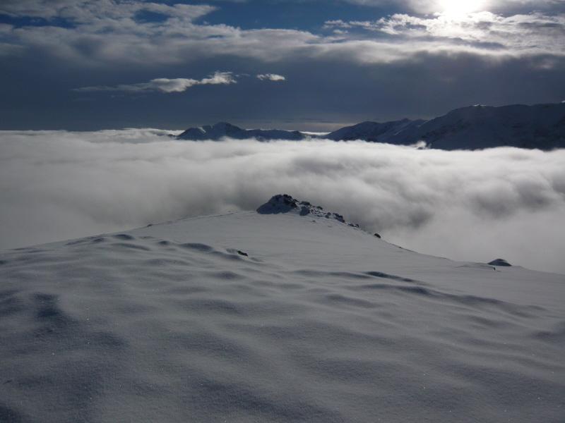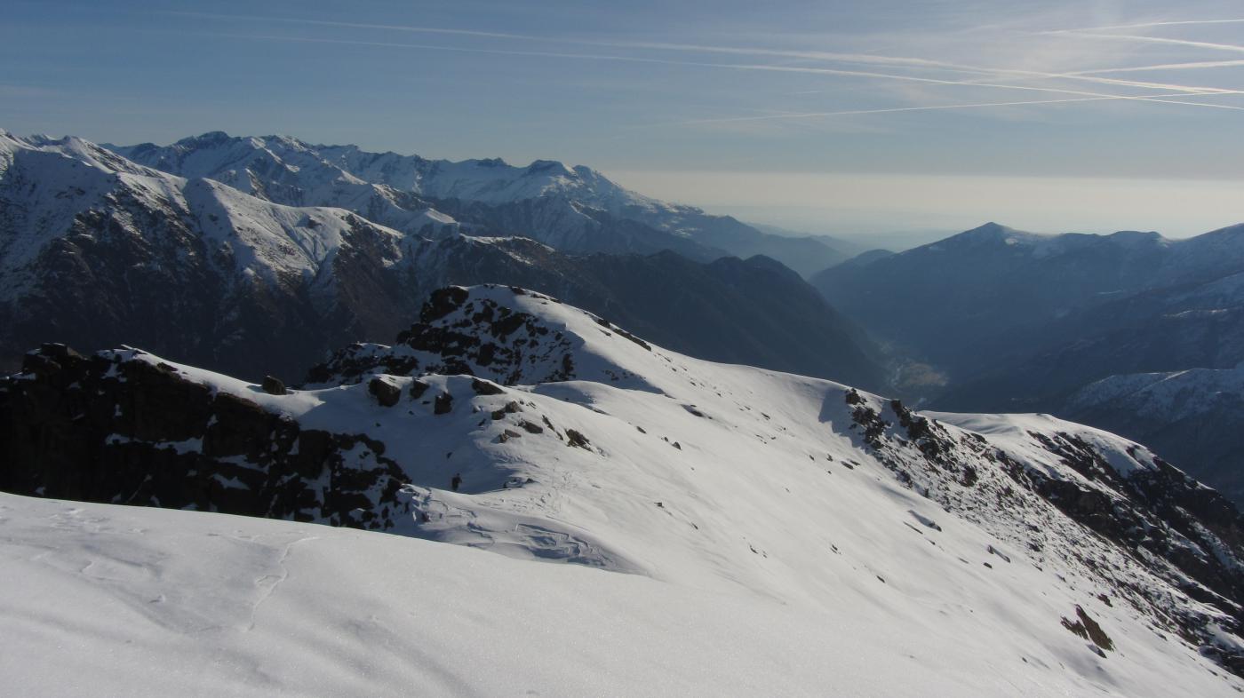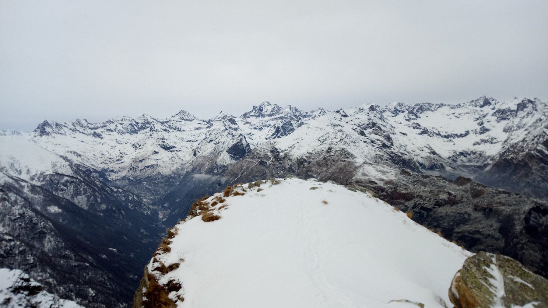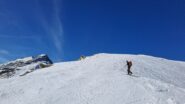 Dopo aver passato un gruppo di baite la dorsale si fa più stretta e conduce alla cima dove ancora si trova il pilone terminale di un vecchio impianto.