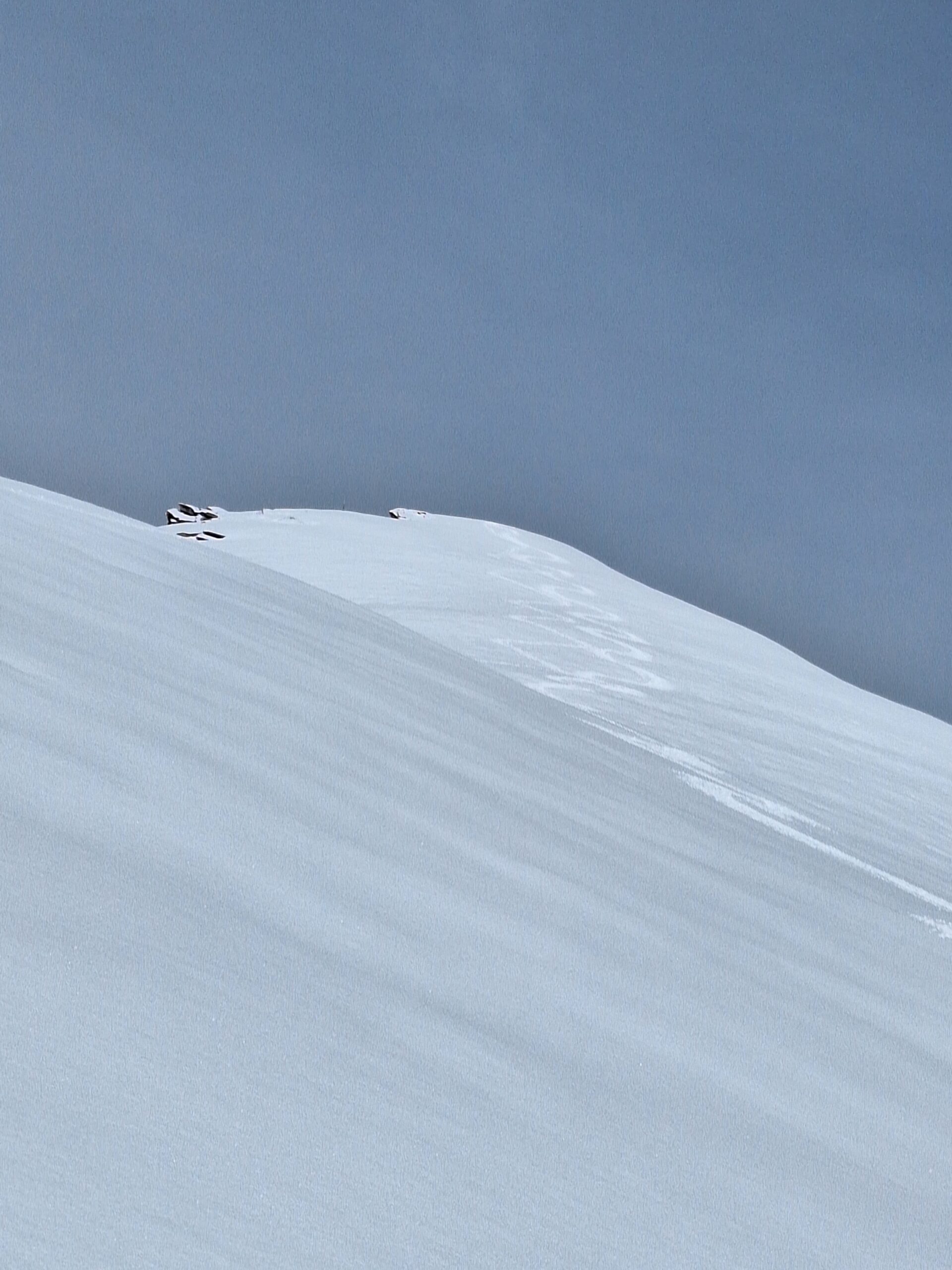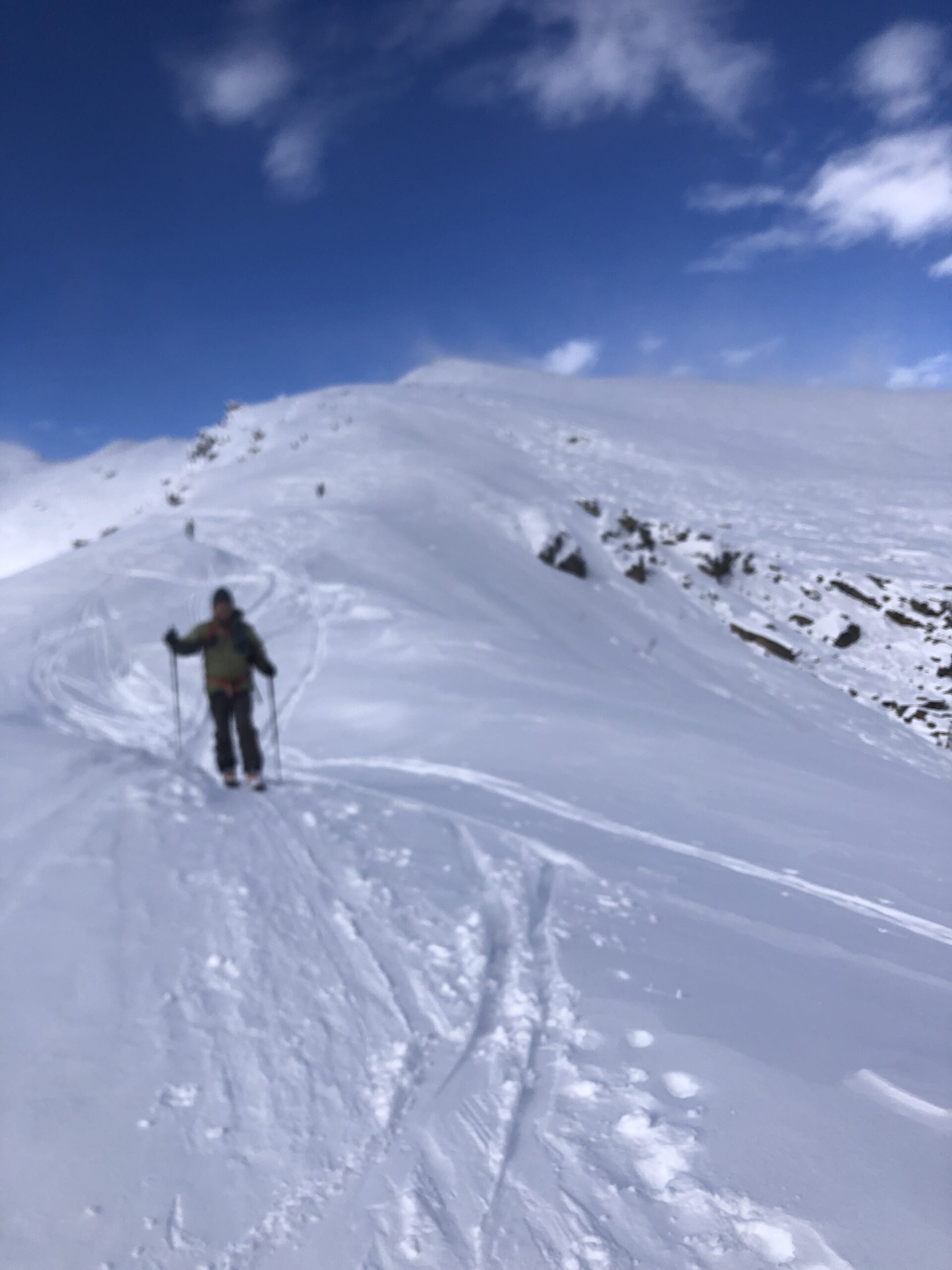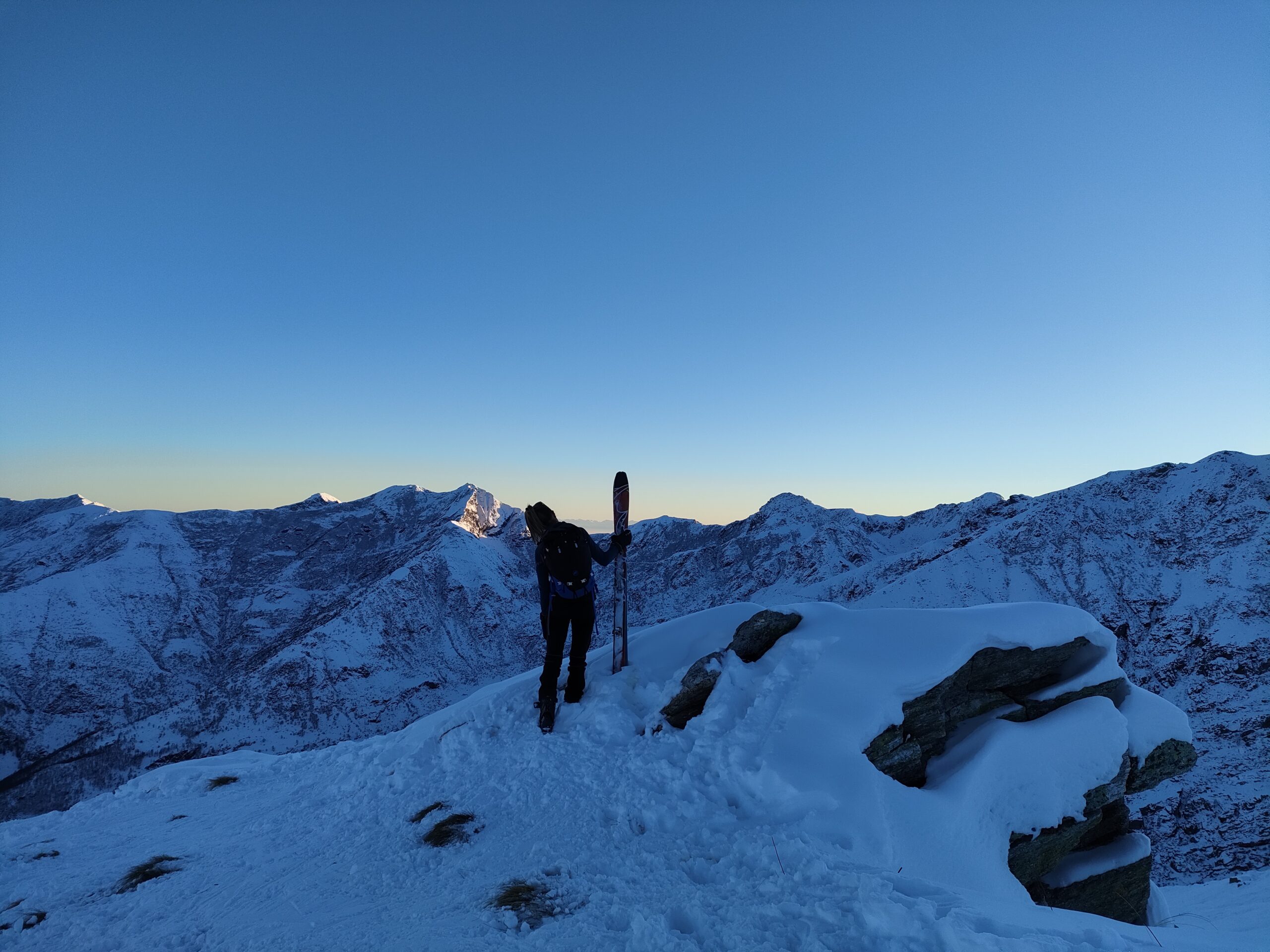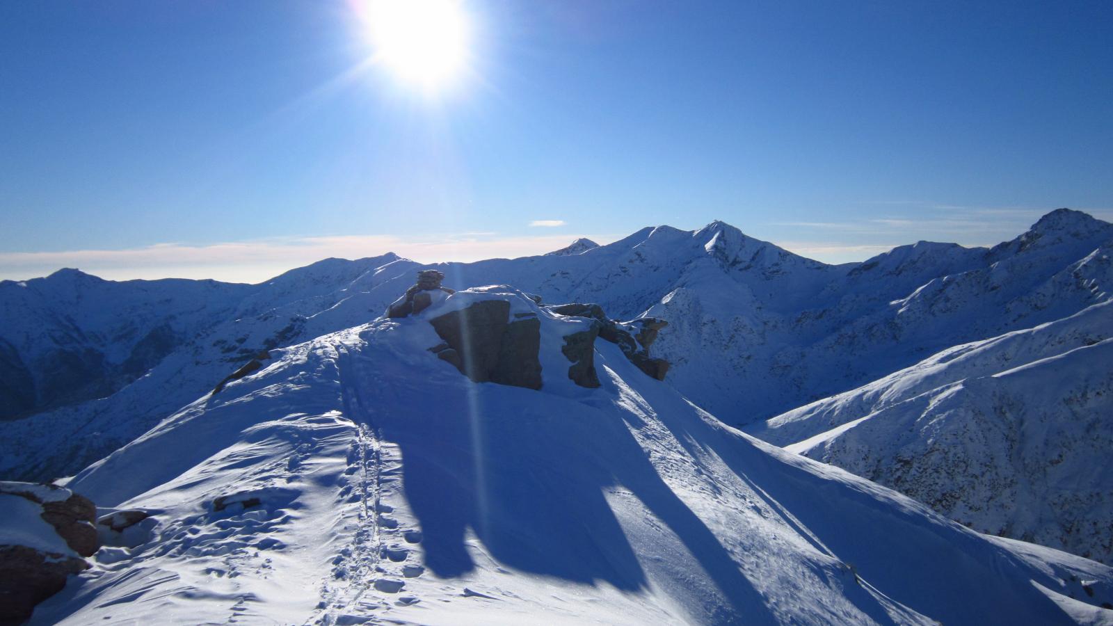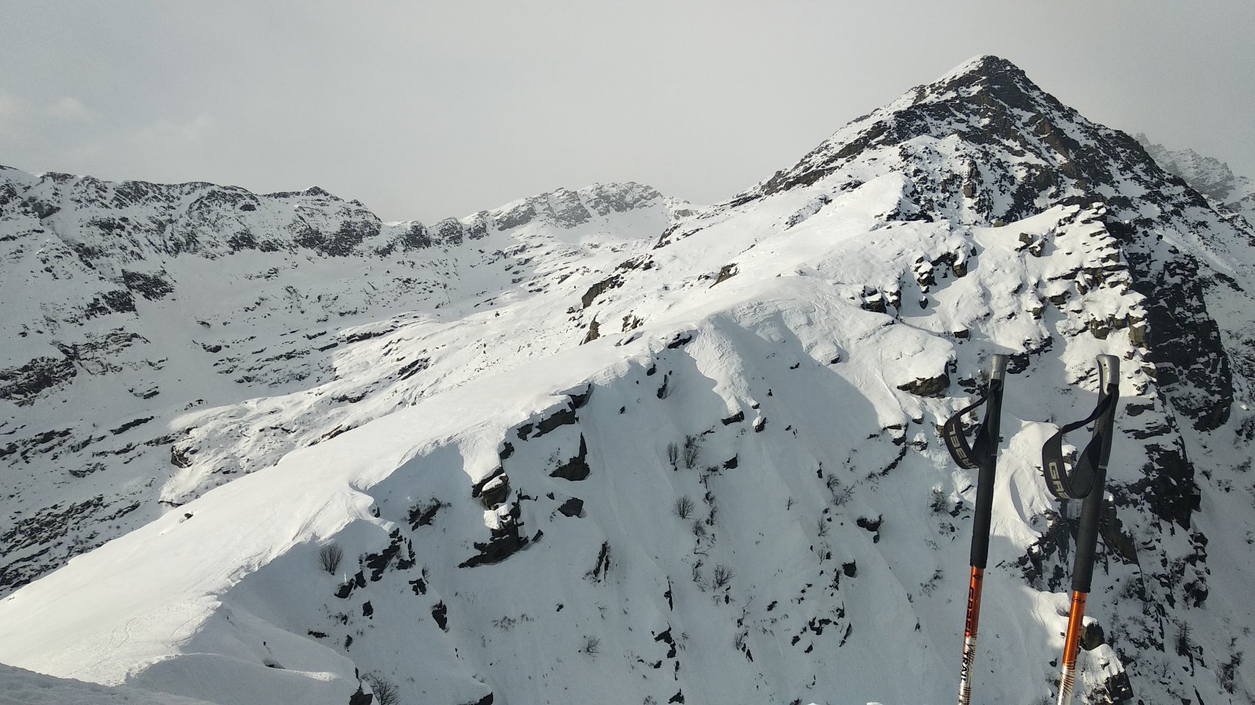 Dopo aver passato un gruppo di baite la dorsale si fa più stretta e conduce alla cima dove ancora si trova il pilone terminale di un vecchio impianto.