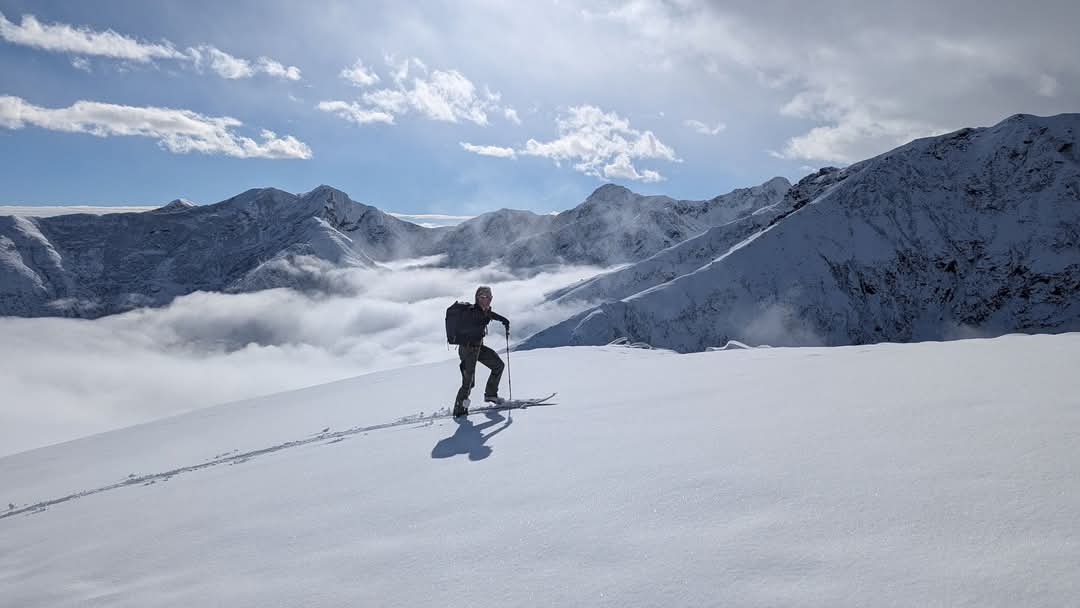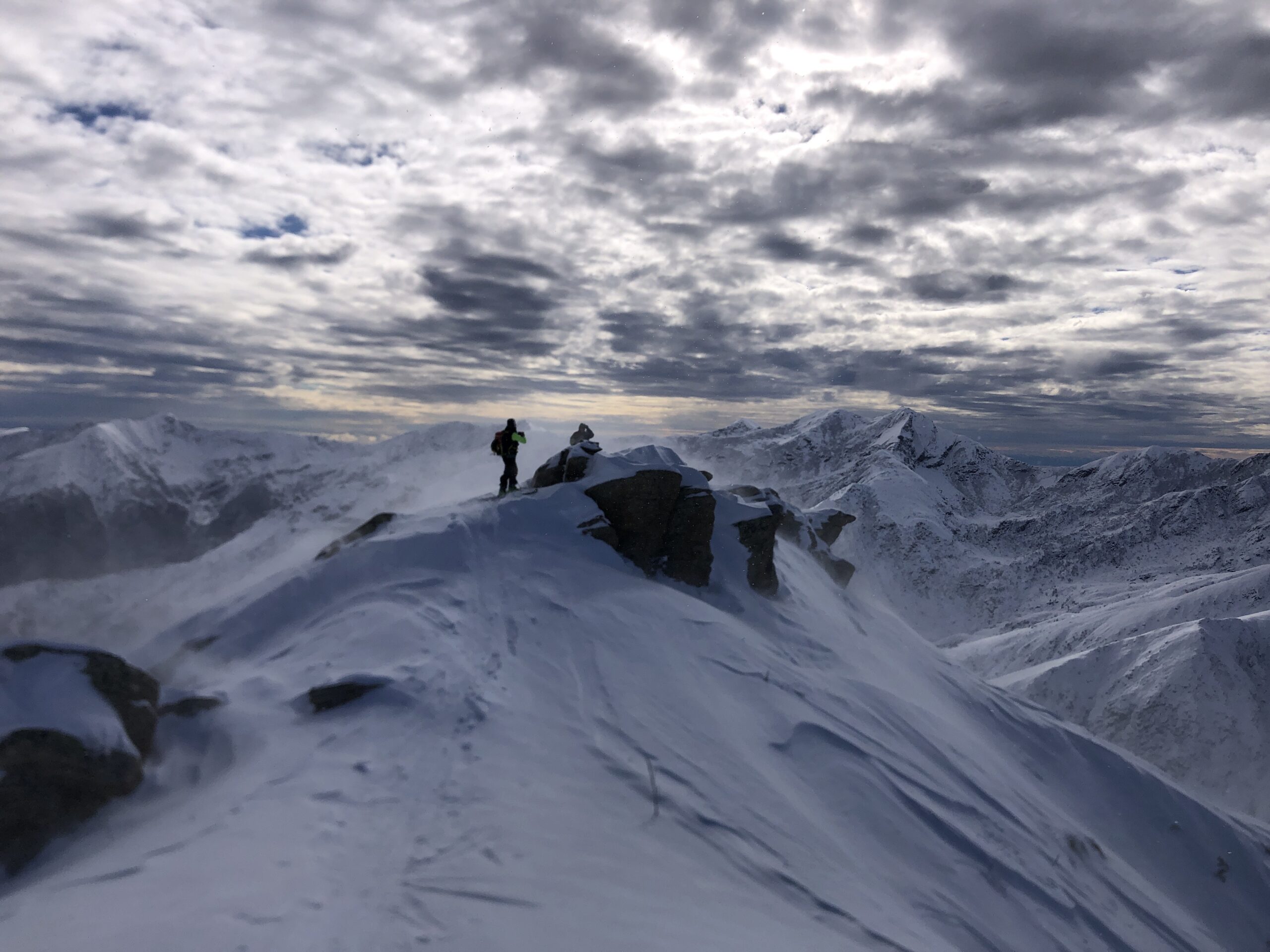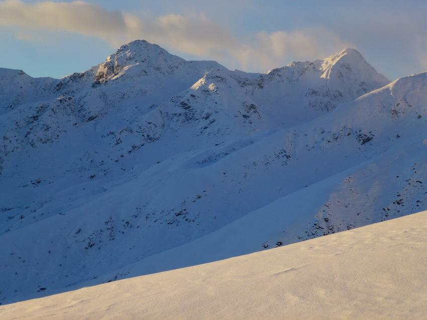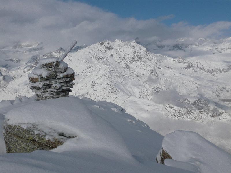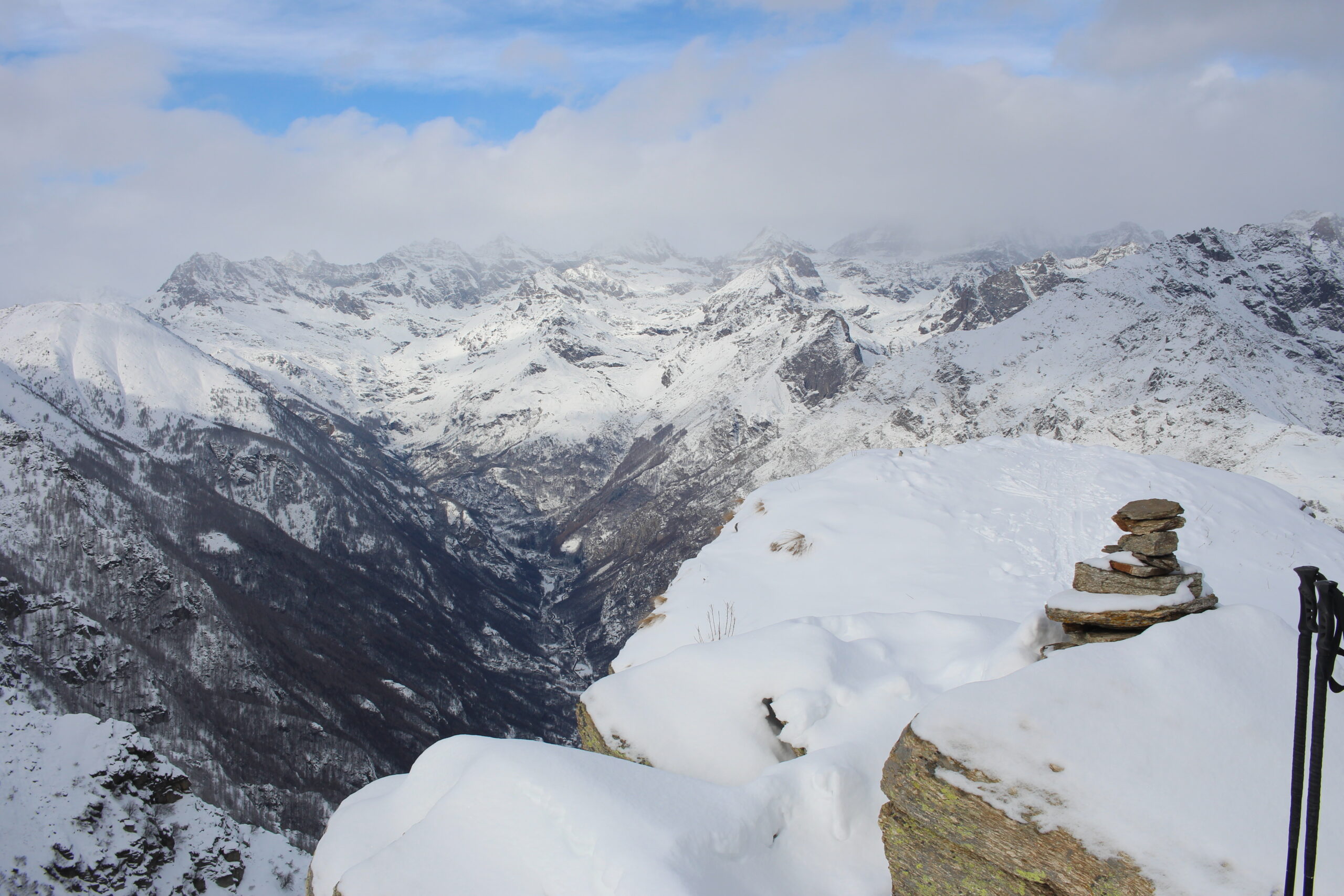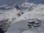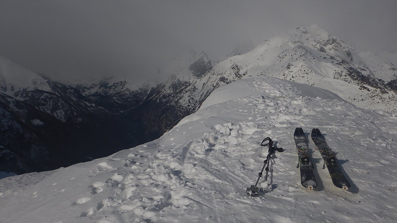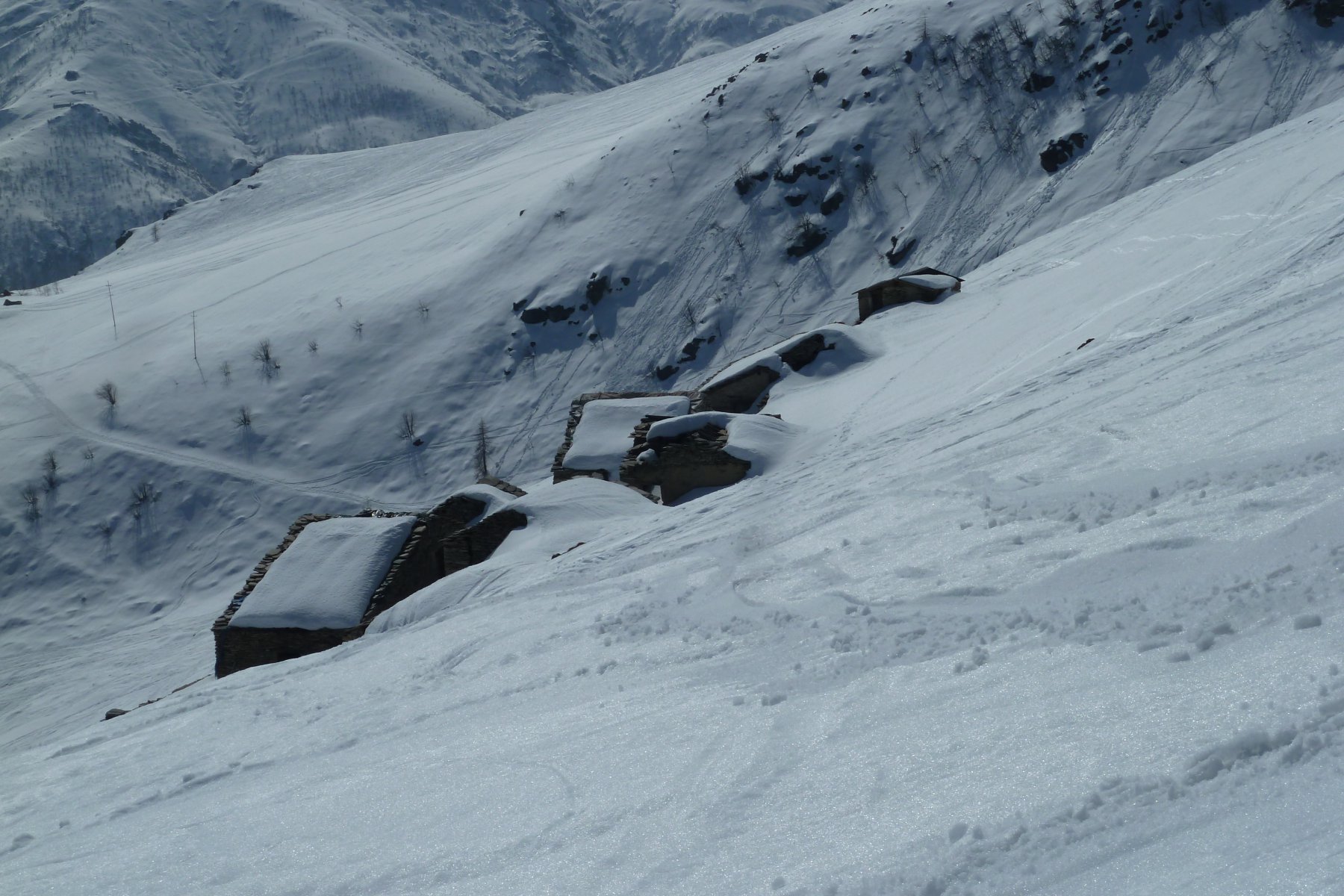 Dopo aver passato un gruppo di baite la dorsale si fa più stretta e conduce alla cima dove ancora si trova il pilone terminale di un vecchio impianto.
