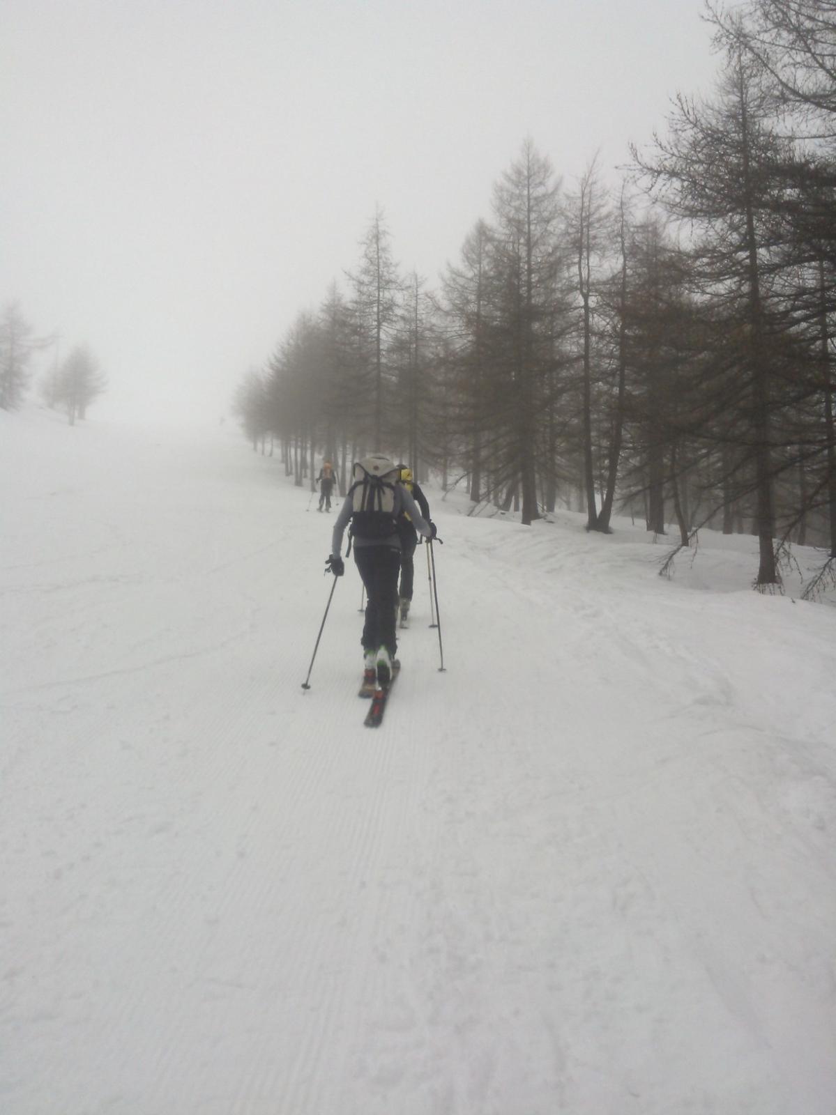 Salita a punta Cia per gran parte del percorso immersi in una nebbia sempre più fitta fino a quota 1.900 quando, forato lo strato di nubi, abbiamo potuto godere di una visibilità buona fino in vetta. Molto appagante la vista sul gruppo del Gran Paradiso svettante da un mare di nuvole. Discesa ok, su manto reso simile a una pista dai ripetuti passaggi, solo per i primi 150 metri in quanto nel frattempo la coltre nebbiosa si era alzata. Se si fosse potuto vedere qualcosa la neve sarebbe stata anche bella, ad eccezione della parte mediana dove era più crostosa. Ultimi 300 metri alla grande sulla pista, con visibilità finalmente buona. Scesi dalla variante a sinistra su neve molto divertente e ancora più che sufficiente per far divertire quanti avevano deciso di passare la giornata sullo skilift della Cialma. Nonostante l’assenza del sole, neve quasi primaverile nella parte finale anche per la giornata eccezionalmente calda per il mese di gennaio. Gita “familiare” con Barbara, Paolo e Laura.