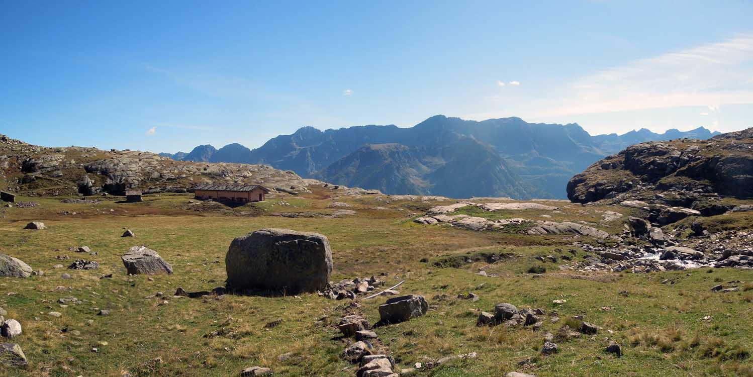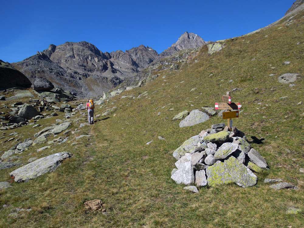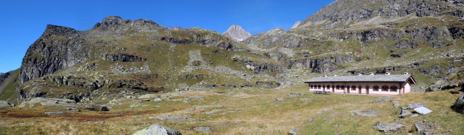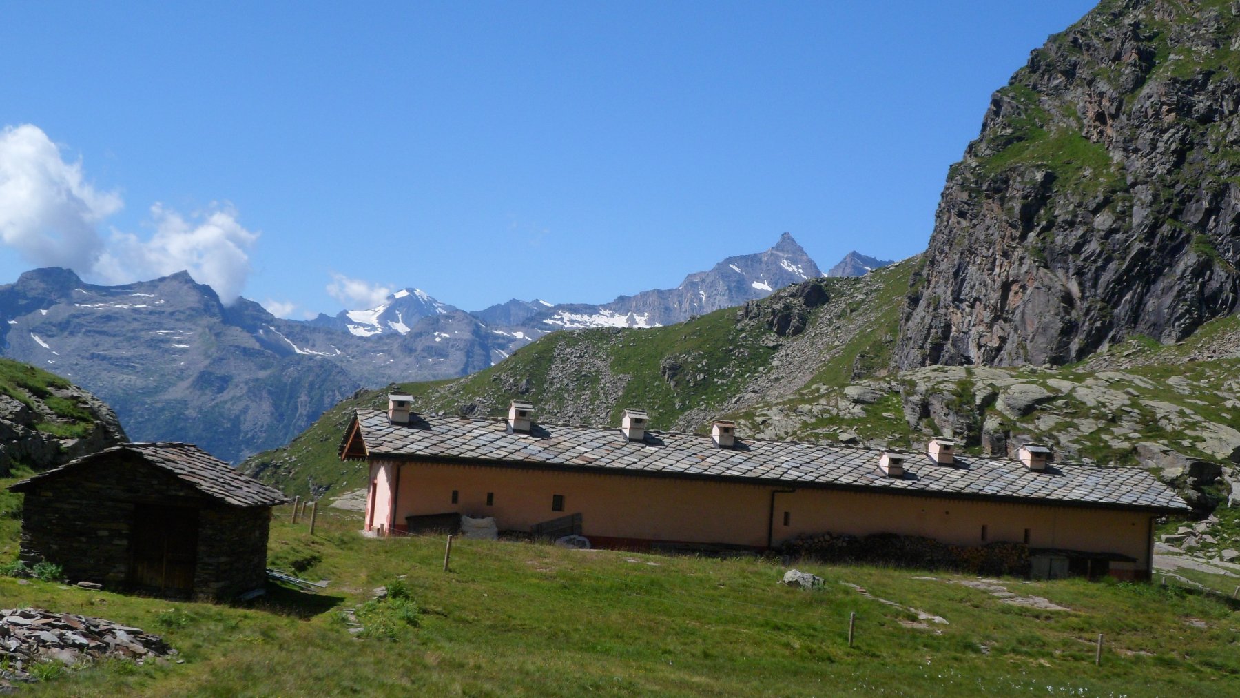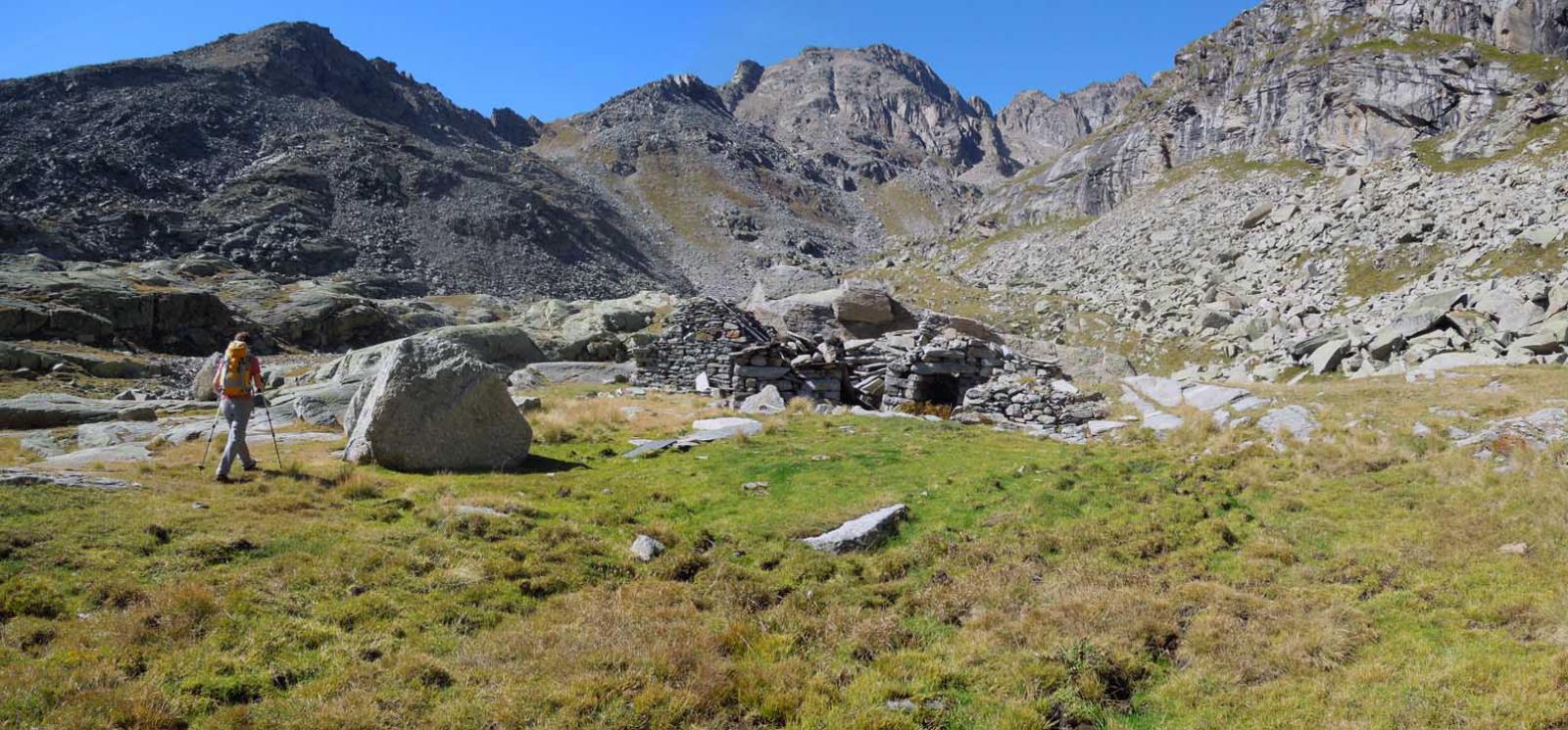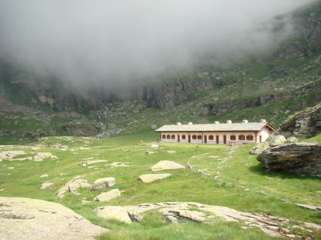 Si mantiene il sentiero di dx sempre segnato r/b (trascurando le tracce che salgono a sx) siamo in zona del Gran Pra, si va verso il Torrente Gran Piano che forma numerosi balzi e cascatelle e lo si attraversa su un paio di rudimentali ma stabili ponticelli a tronchi di legno percorso un breve traverso si incrocia a quota 1870m proveniente da dx il “Sentiero Reale” che sale da Noasca (ma che è interrotto e minacciato da una vecchia frana). Si percorre l’ampio sentiero (anche se per breve tratti è franato, ma sempre ben evidente e percorribile) che con pendenza live e costante con ad ampi traversi e svolte porta al Gran Piano dove e presente e ben ristrutturata l’ex Casa di Caccia ora Casotto PNGP 2222m.
