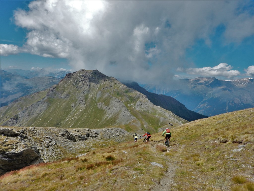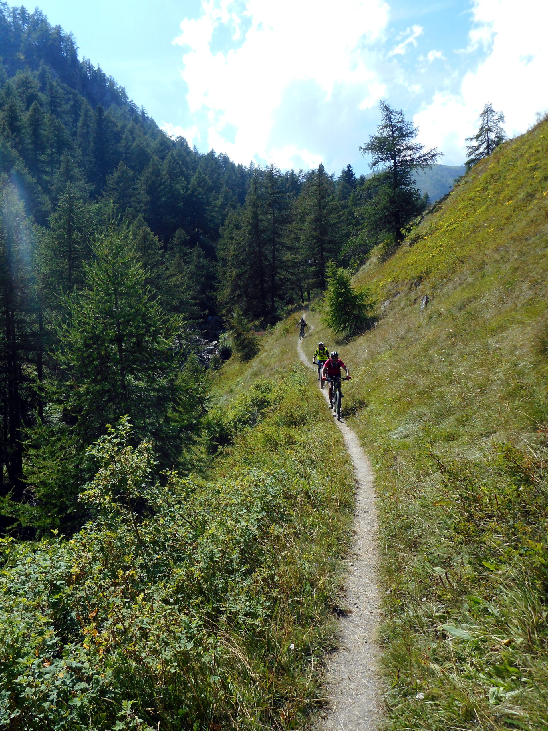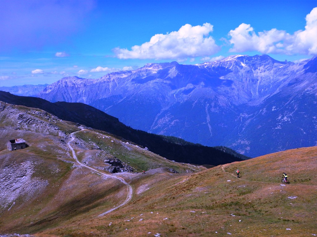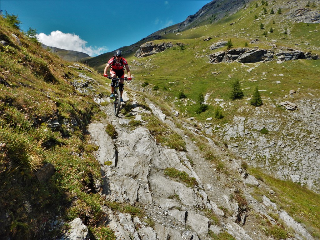 VARIANTE: volendo accorciare il giro e un pò anche il dislivello dal Colle dell’Assietta si può scendere direttamente con il sentiero GTA (anch’esso divertente e di difficoltà OC, con alcuni passaggini un pò esposti e un leggero tratto di risalita): il sentiero inizialmente scende per prati (seguire i paletti), poi raggiunge un laghetto e l’Alpe Assietta; da qui il sentiero presenta alcuni tratti esposti da superare con bici alla mano, poi ritorna divertente e filante. Si raggiunge l’abitato di Cerogne, che si attraversa per reperire un altro ripido sentiero che in breve porta a Pourrieres.