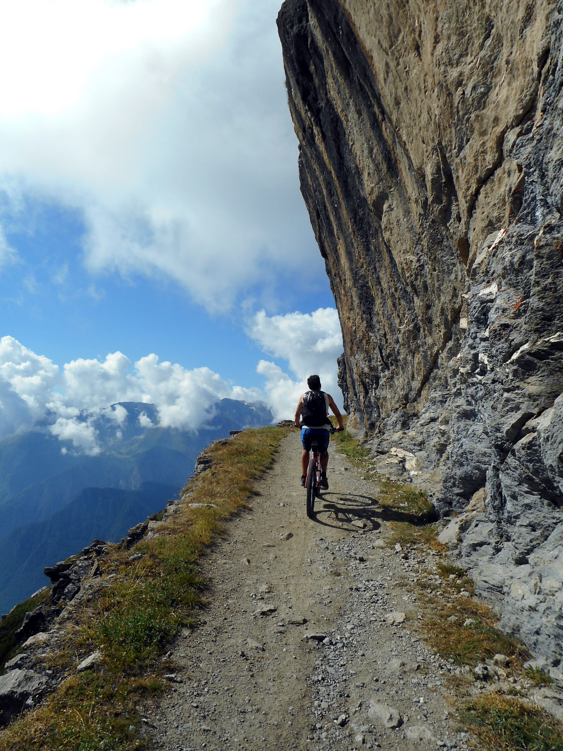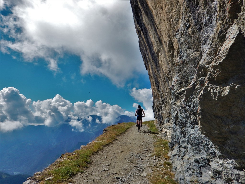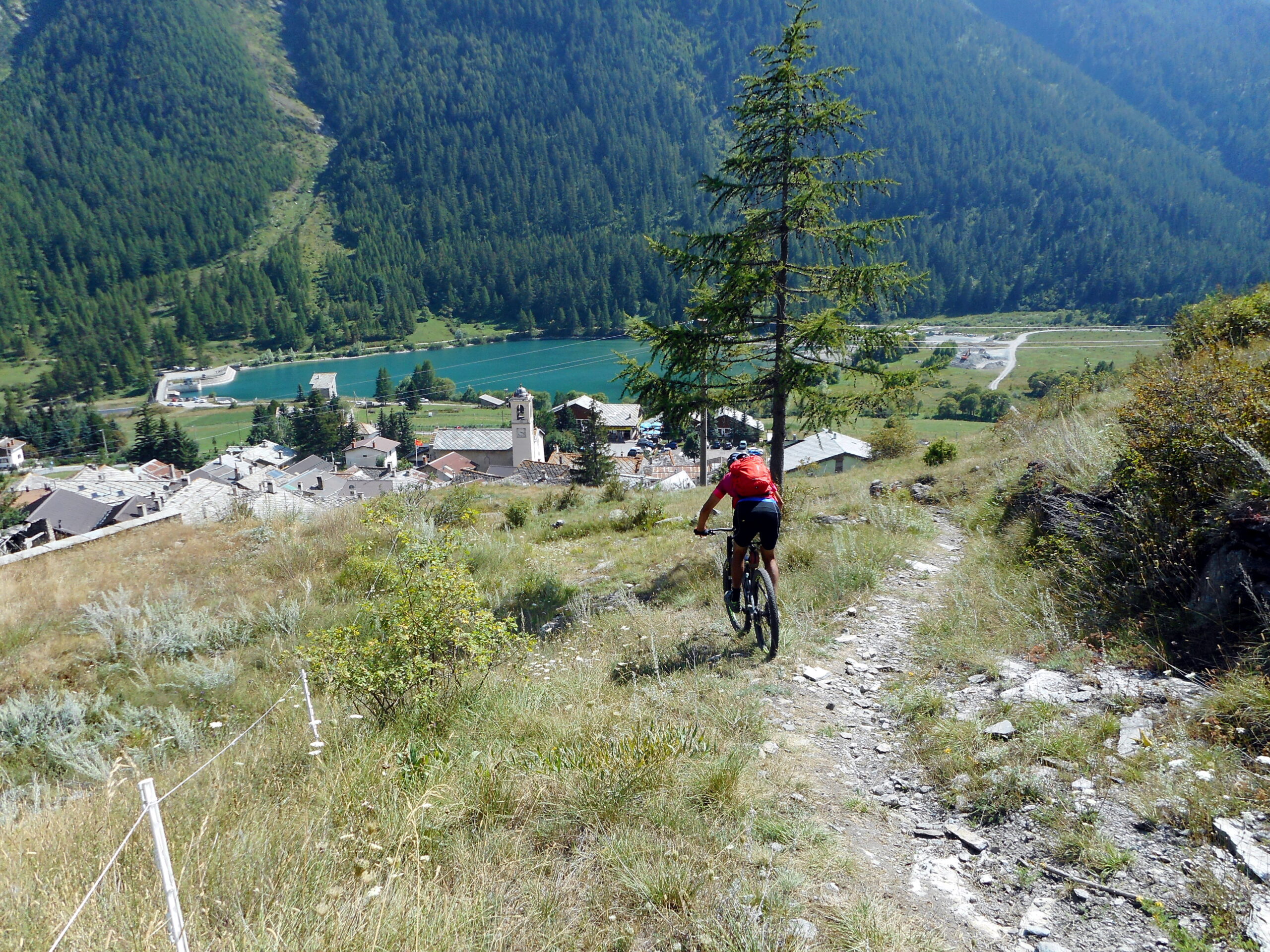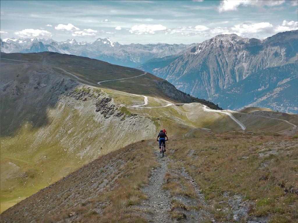 VARIANTE: volendo accorciare il giro e un pò anche il dislivello dal Colle dell’Assietta si può scendere direttamente con il sentiero GTA (anch’esso divertente e di difficoltà OC, con alcuni passaggini un pò esposti e un leggero tratto di risalita): il sentiero inizialmente scende per prati (seguire i paletti), poi raggiunge un laghetto e l’Alpe Assietta; da qui il sentiero presenta alcuni tratti esposti da superare con bici alla mano, poi ritorna divertente e filante. Si raggiunge l’abitato di Cerogne, che si attraversa per reperire un altro ripido sentiero che in breve porta a Pourrieres.