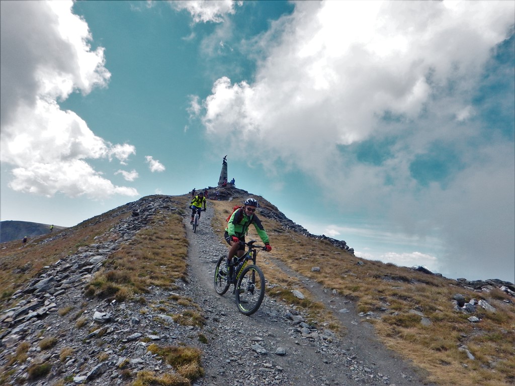 Tornati al bivio proseguire sulla militare per il Colle delle Vallette e la Caserma del Gran Serin; da qui proseguire sulla strada e nei pressi di un tornante a sin. sotto al Gran Serin reperire un sentierino che permette di raggiungere il Colle dell’Assietta. Proseguiamo la cavalcata fino al monumento della Testa dell’Assietta altro punto molto panoramico di questa gita. Dapprima in discesa poi in falsopiano sempre sulla strada militare raggiungiamo il Col Lauson, dove terminano le fatiche pedalatorie! la splendida discesa a tratti molto tecnica avverrà lungo il sentiero 328 che raggiunge il laghetto di Lauson e poi sempre in single track, l’alpe Rocce, Gran Puy e Pragelato. Da qui appena possibile oltrepassare il Chisone e raggiungere Pourrieres su una bellissima e veloce sterrata.