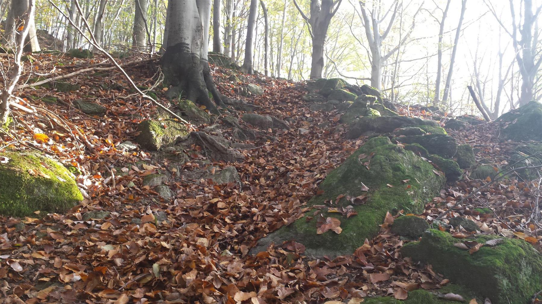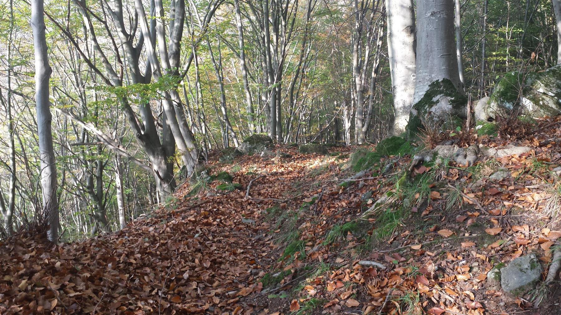 Il sentiero parte in salita e per 10 minuti si porta la bici poi puro divertimento nel bel bosco di faggi con un po’ troppe foglie ma rare le pietre e i rami vaganti. Solo 2 brevi risalite. Sotto le 2 baite abbandonate il sentiero è meno evidente e non ci sono più i segni rossi sbiaditi sui tronchi ma, andando un po’ a naso, si arriva alla sterrata. In salita si prosegue verso l’alpe Caprasio e Pratobotrile e scendendo si raggiunge la strada asfaltata di salita poco sopra Campambiardo. Rientro a Caprie.