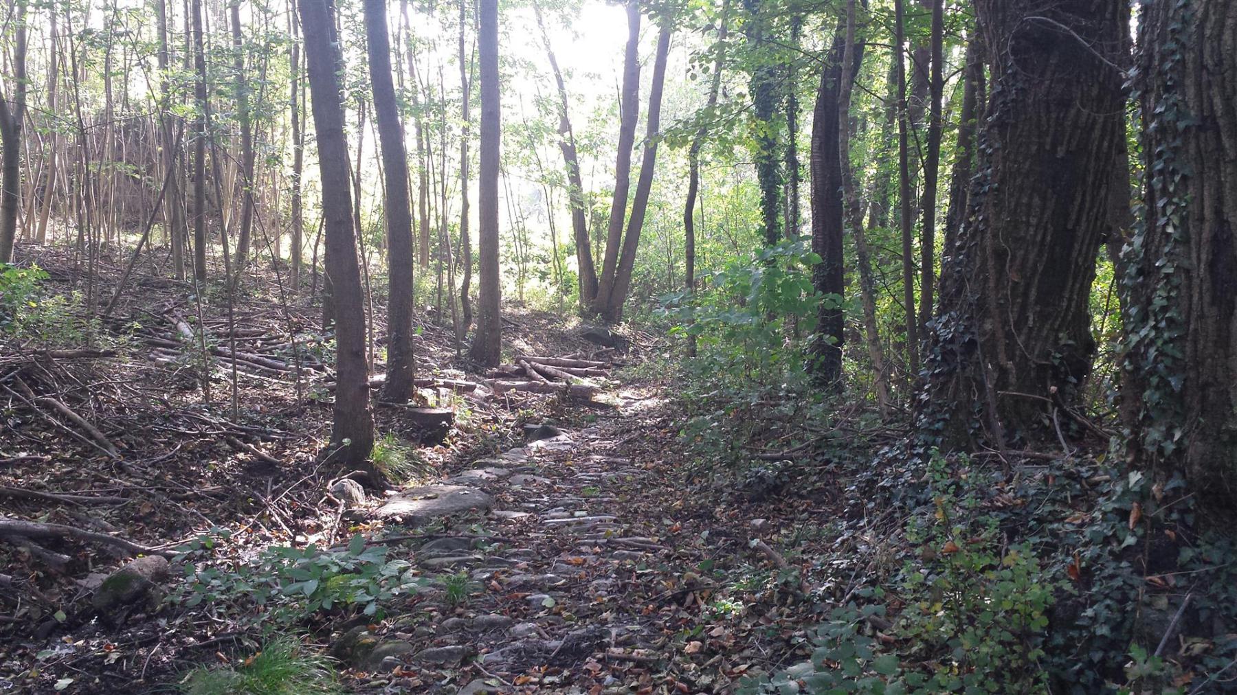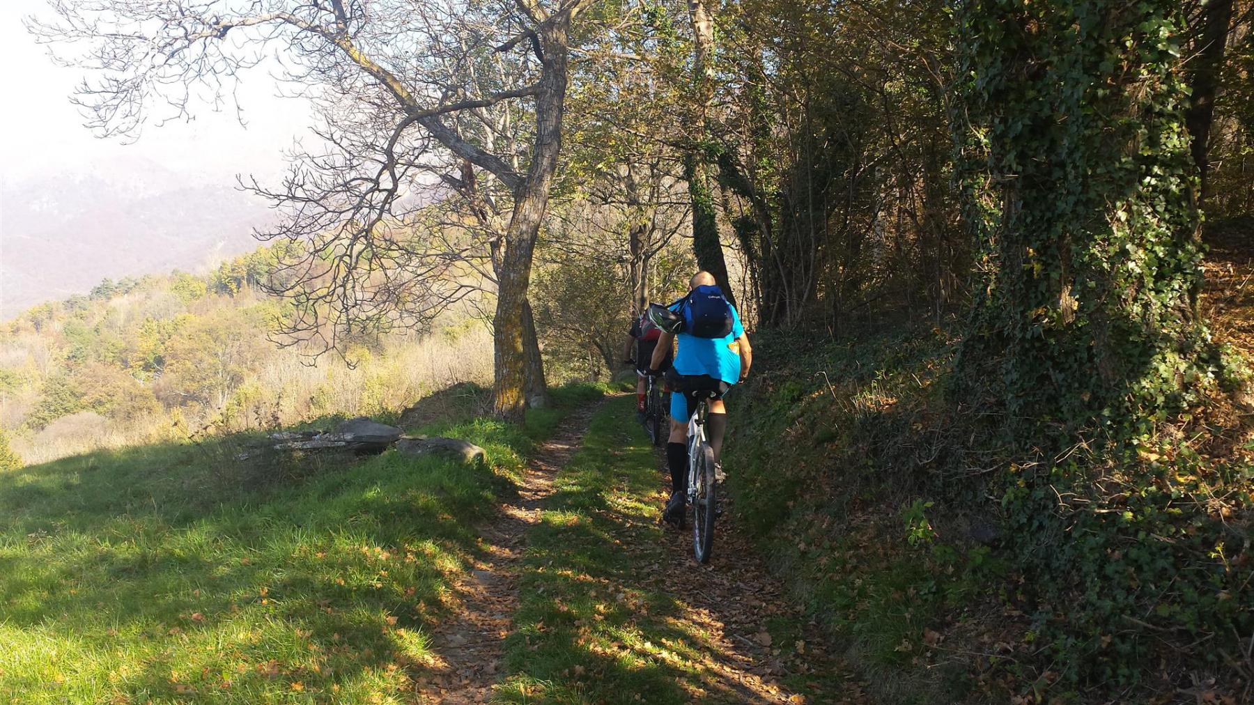 Prendiamo la sterrata verso fontana Ciapet e poi giù nel bosco di faggi con le foglie che sono ormai troppe e poi rientriamo a Campambiardo. Con il tempo a disposizione troppo tiranno, anziché risalire per fare il sentiero visto in salita, scendiamo a valle. A Peroldrado, invece di seguire l’asfalto passiamo in mezzo alle case e seguiamo una mulattiera in parte lastricata ed abbastanza impegnativa perché quest’anno non è stata pulita; sbuchiamo poco sopra Case Comba da dove, nuovamente, prendiamo un’altra mulattiera più scorrevole e arriviamo alla fine della Via Kennedy di Caprie.