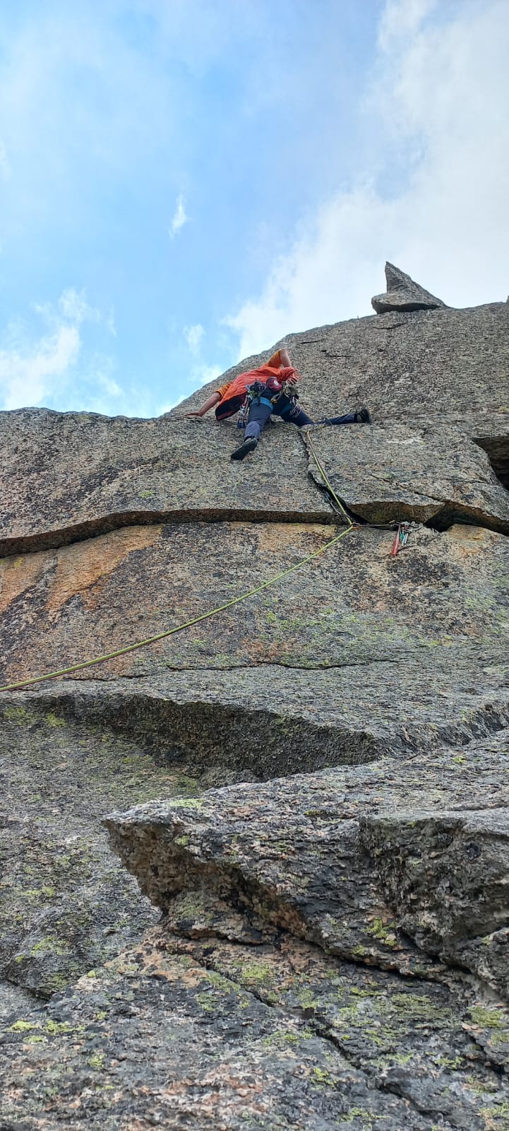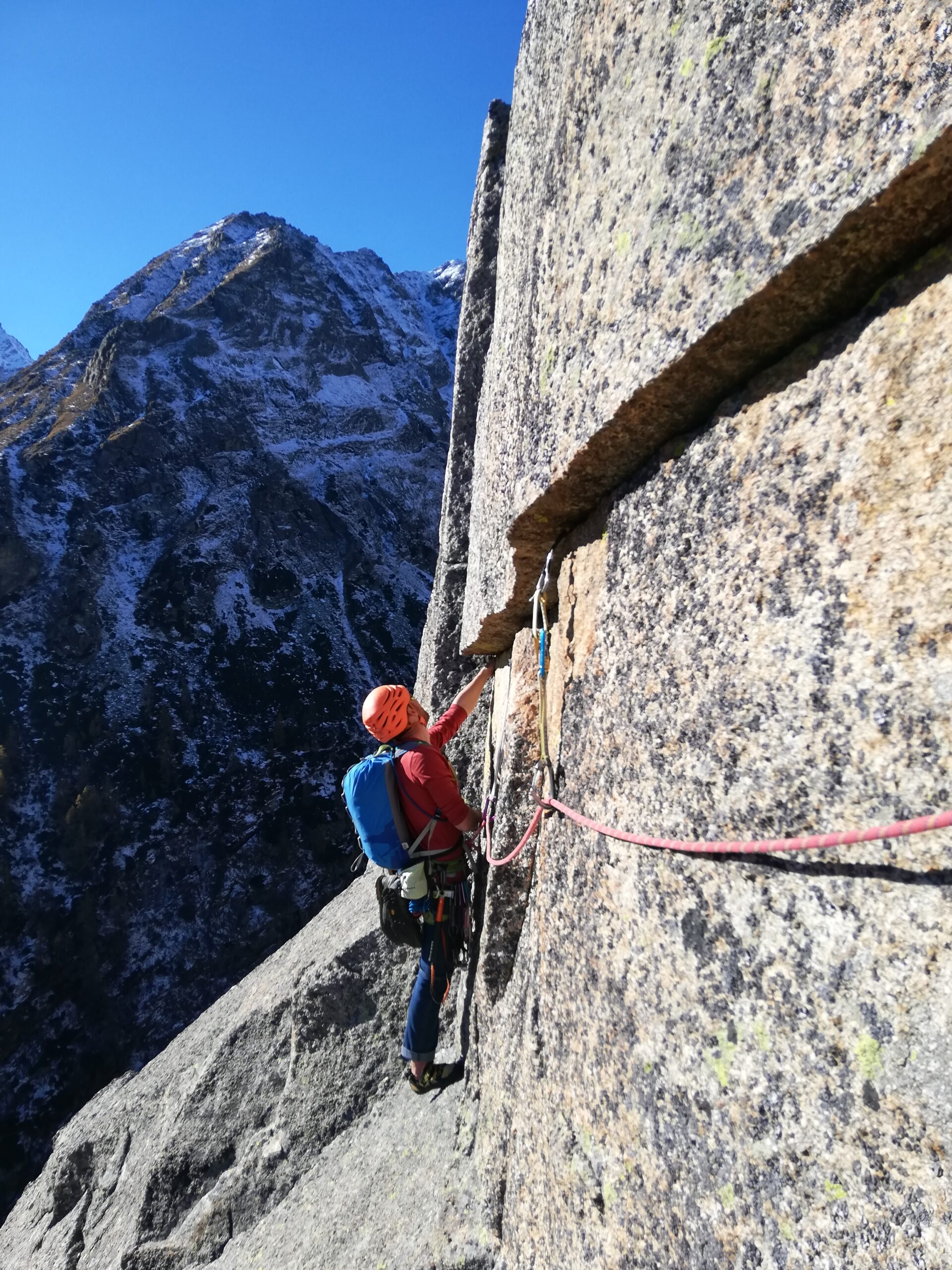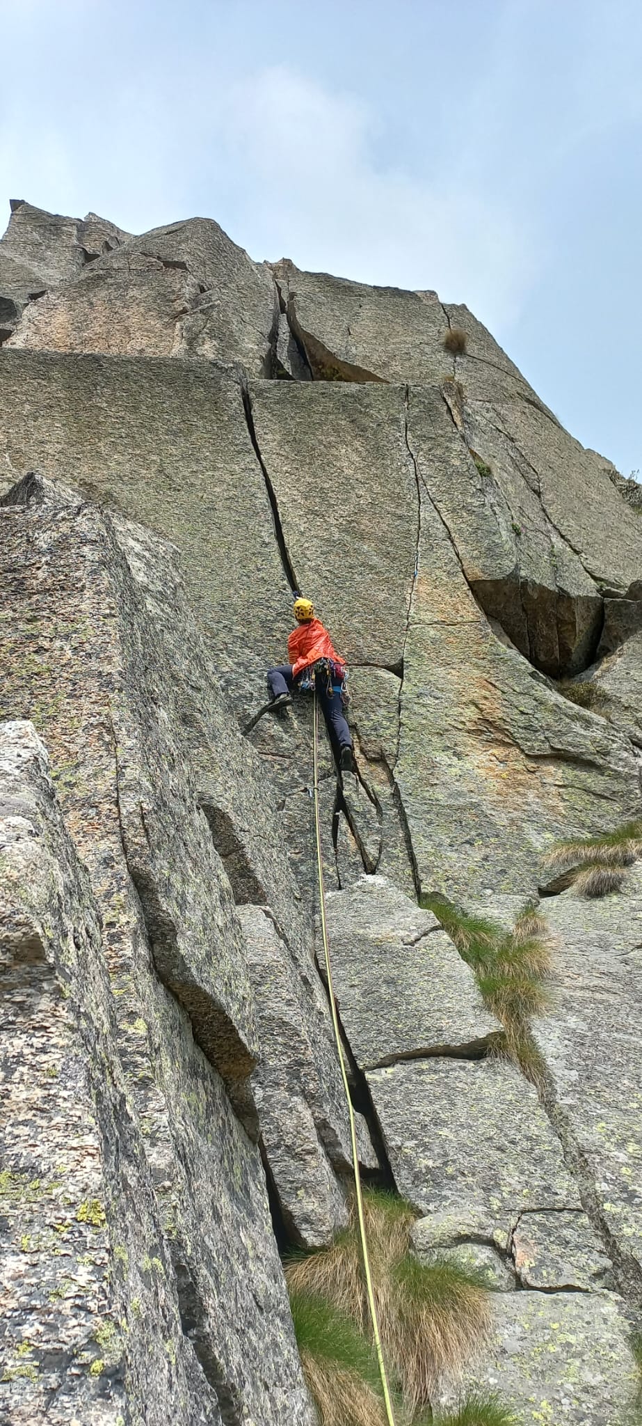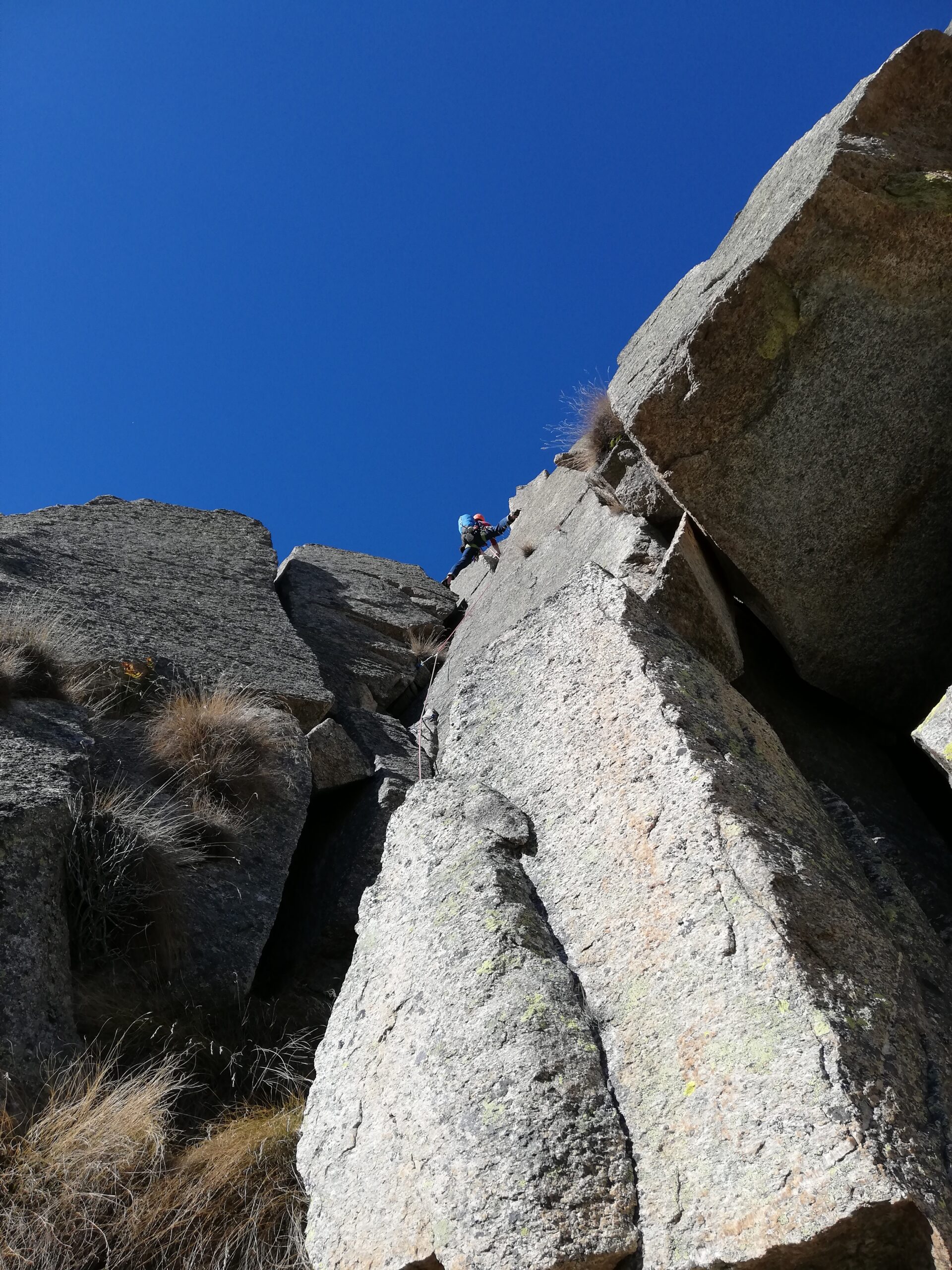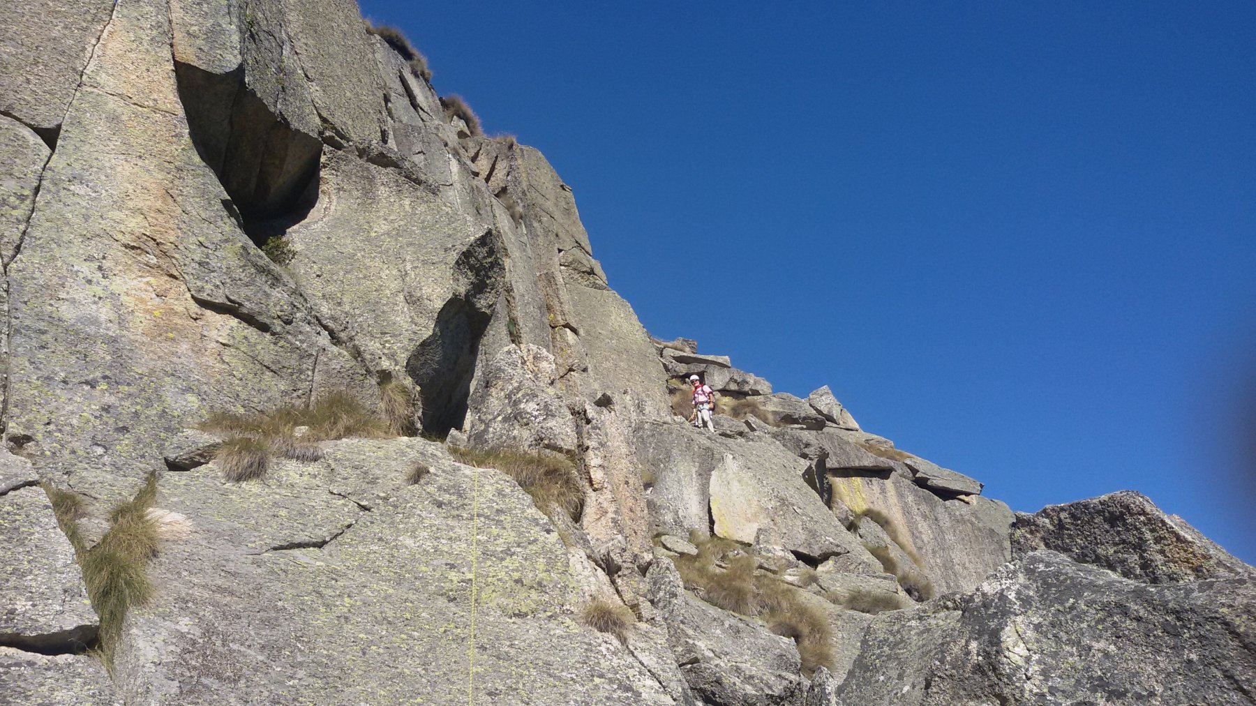 - L3 – Si supera la bella fessura di destra in A1 (2 ch. e un nut), si esce su placca e si va verso sinistra sotto uno strapiombo a campana da cui si esce (IV+) in una zona di terrazzini e blocchi. Alternativa di sx: larga fessura verticale completamente da proteggere a friend grossi (#3-4BD); alternativa di dx (IV+ sostenuto ed atletico): aggirare il dado roccioso sulla dx per teppa e risalire un breve canale erboso fino alla base di un diedro-camino (ch. arancione ben evidente). Salire nel diedro-camino in spaccata, superare il primo ch. e quindi un secondo ch. sulla sx. Verso la fine uscire a dx e proseguire per facili placche fino alla sosta (vecchi cordini su clessidra da rinforzare) al di sotto del salto finale (25-30m).