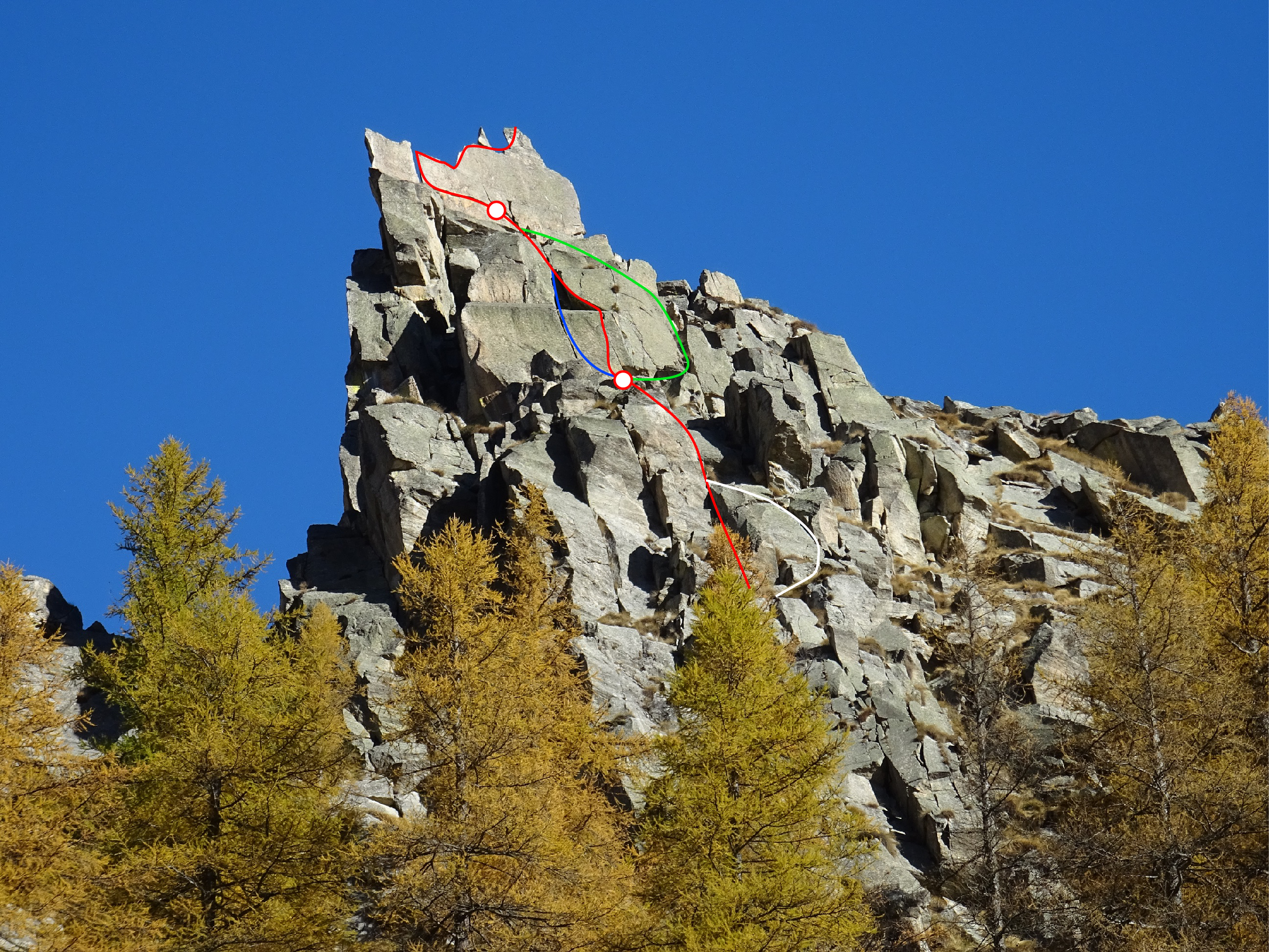 - L1 – Dalla base dello sperone si salgono alcuni gradini sulla sinistra fino ad una piattaforma (cordino su masso) alla base di un pilastrino. Risalirlo sfruttando una fessura a sx (da proteggere a friend medio-piccoli, IV+ passo di V) o lungo una fessura a dx (ch.). Al termine della fessura si esce a dx e si entra in un diedro erboso, da cui si esce a dx su di un pilastrino (ch., IV+). Proseguire brevemente lungo il pilastrino e poi ignorare il diedro erboso sulla dx con friend incastrato alla base e, con un passo esposto, attraversare a sx in placca (passo di IV+) e raggiungere una zona di blocchi (cordini di sosta, 30m, attenzione ai forti attriti).