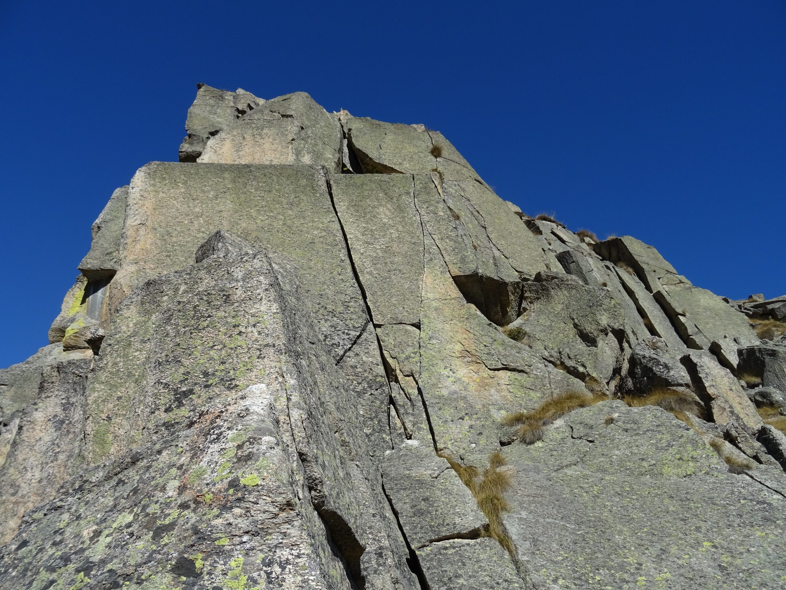 - L2 – Spostarsi a dx ed entrare in una specie di camino creato da un gendarme staccato e la parete. Risalire la parete fessurata di fronte (ch., IV+) e proseguire più semplicemente prima a sx di un vago speroncino e poi a dx, arrivando sotto un tettino triangolare. Traversare a sx e quindi salire l’evidente diedro con una serie di bombamenti (ch., passi di IV+) che dà accesso ad una zona più facile, delimitata a dx da una placca appoggiata. Dove la parete torna verticale uscire decisamente a sx, risalendo un muretto nerastro e raggiungendo il filo dello sperone. Cordini di sosta (35-40m). (Questo tiro può essere spezzato in due, uscendo a dx dopo la placca fessurata con chiodo ad inizio tiro, ed andando a sostare su di un dentino roccioso sulla dx attrezzato con cordini. E’ poi necessario salire la placca appoggiata poco proteggibile in traverso ascendente verso sx, fino a ricongiungersi con l’it. diretto, dove si esce a sx sul filo dello sperone).