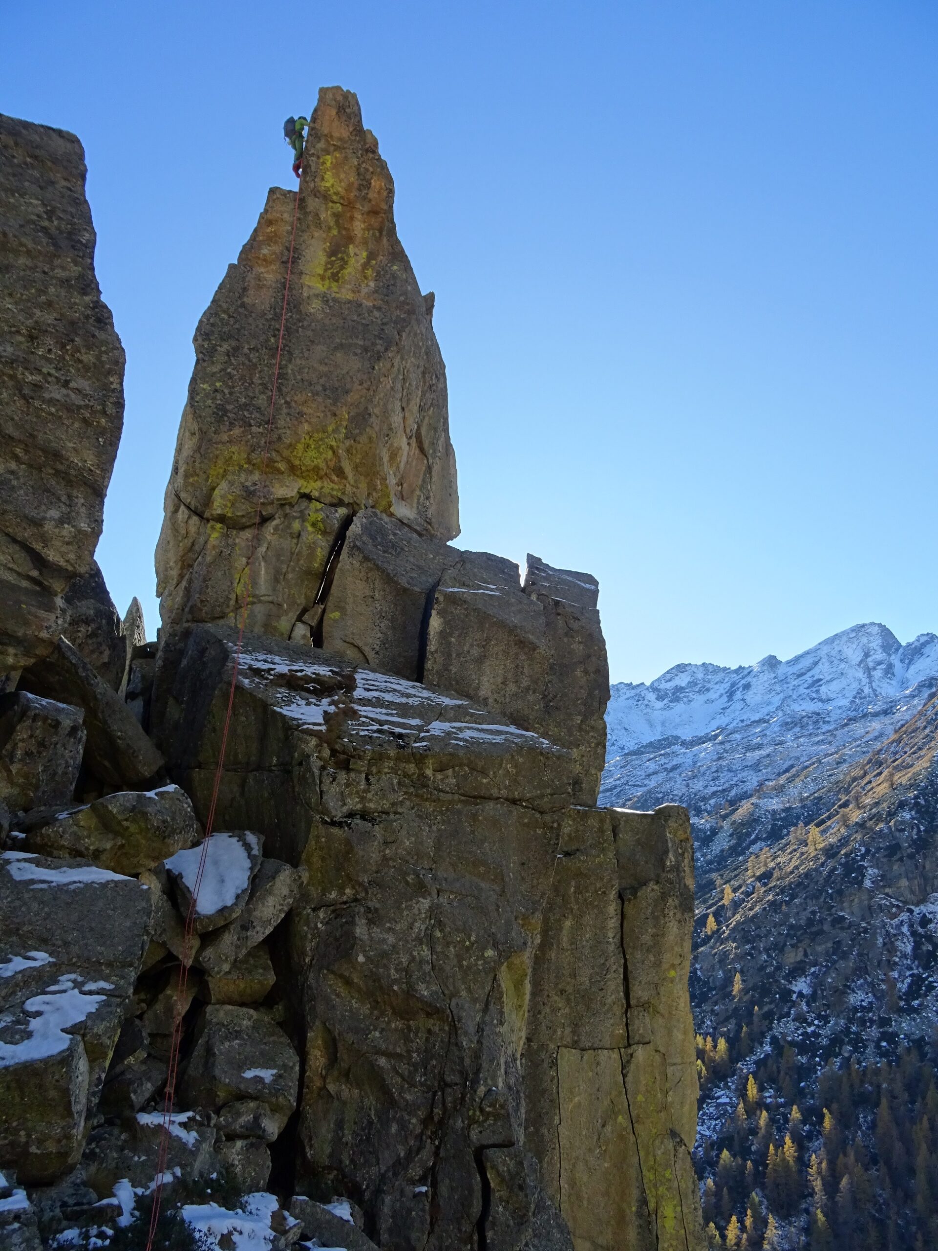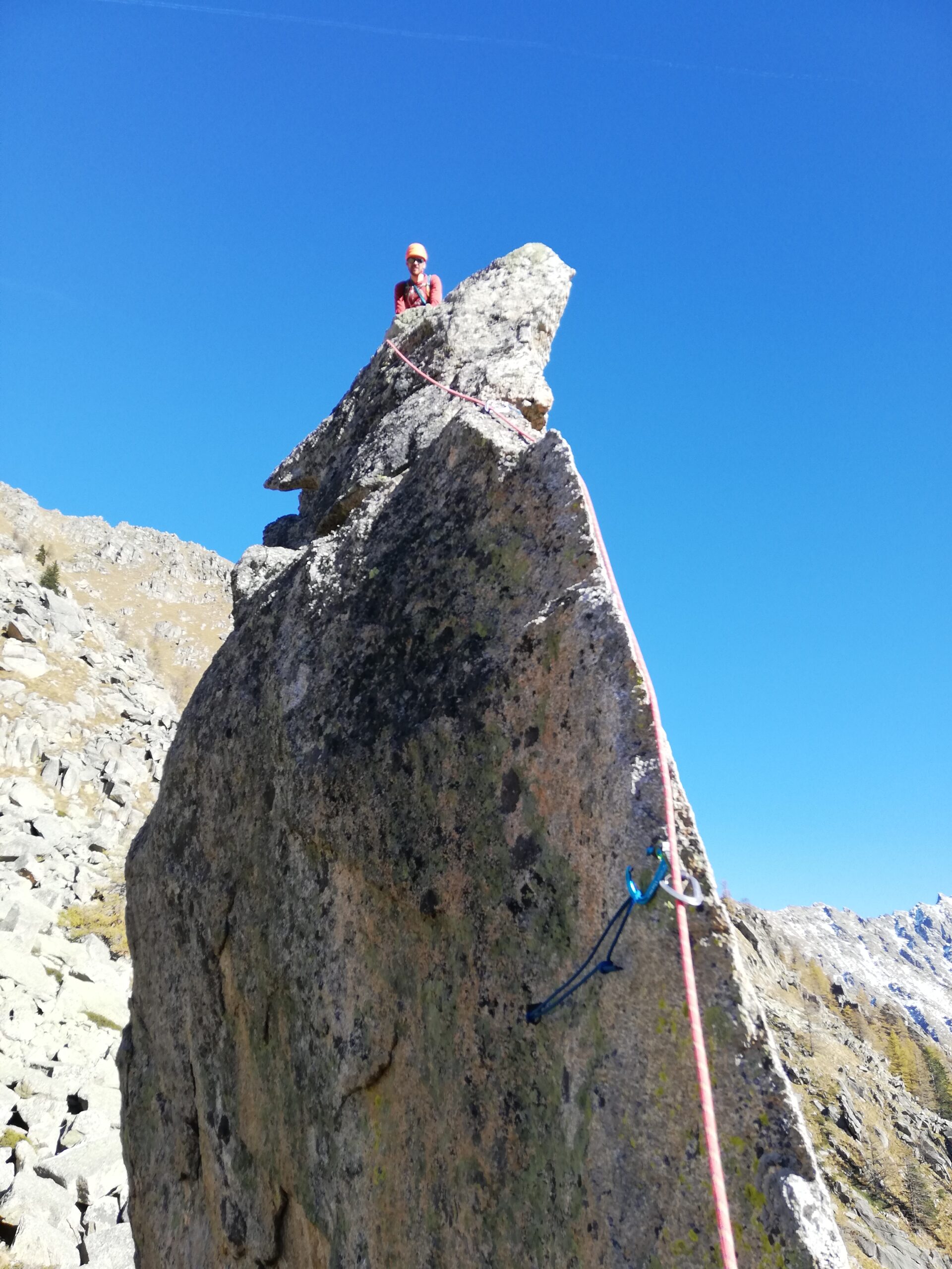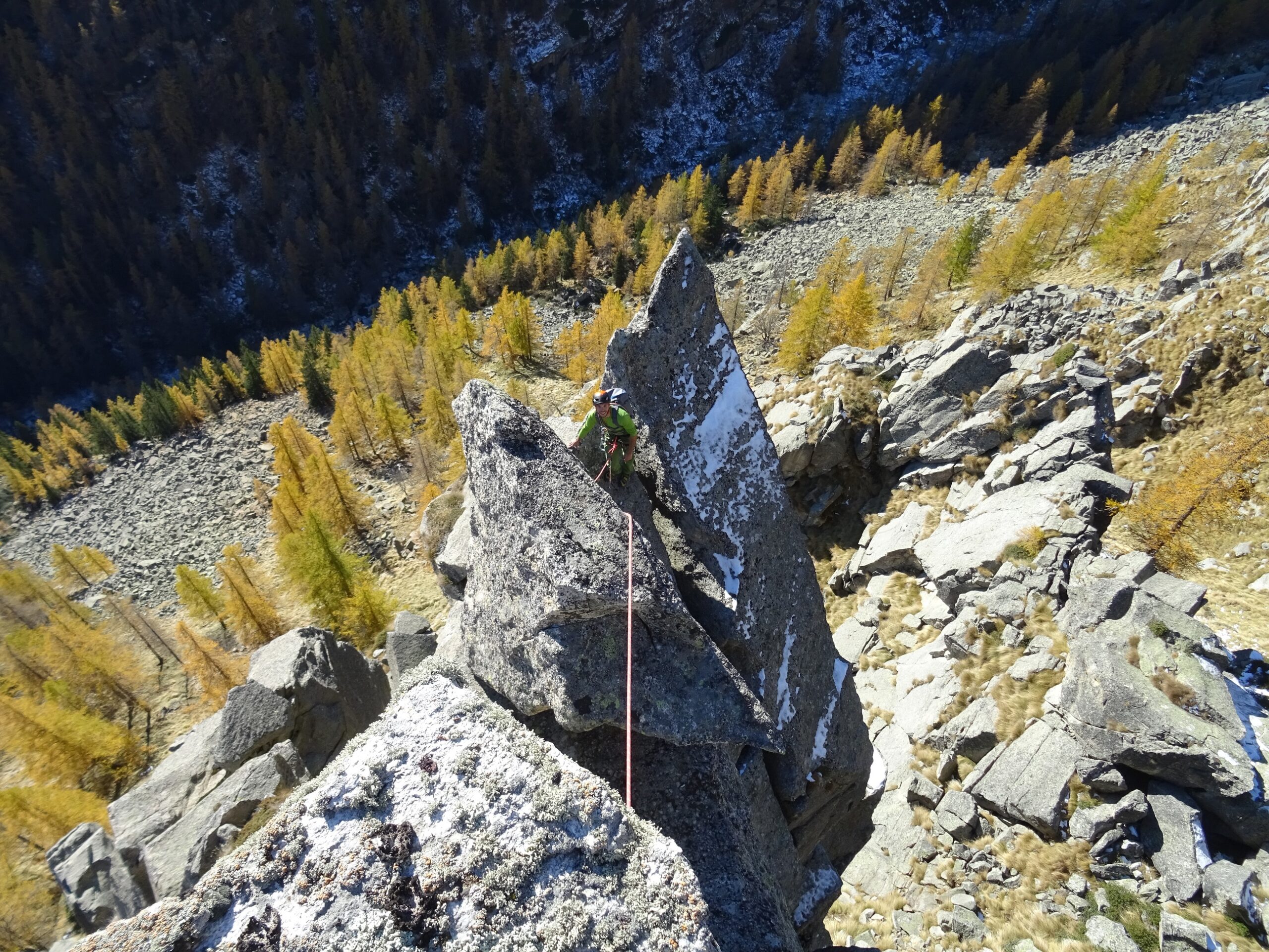 - L4 – Dalla sosta seguire verso sx la fessurina che incide il blocco sommitale (ch. dopo 4-5m), fino a raggiungere il margine sx della giuglia, da lì salire lungo un largo camino-fessura improteggibile (IV+ sostenuto) ed uscire a dx. Salire lo spigolo in dulfer (ch. a pressione, passo di V in partenza) e quindi raggiungere il filo di spigolo (ch. a pressione). Quindi oltrepassare un blocco instabile sulla sinistra e, oltrepassata una vecchia sosta, raggiungere la stretta sommità della guglia (sosta recente su 3 ch.).