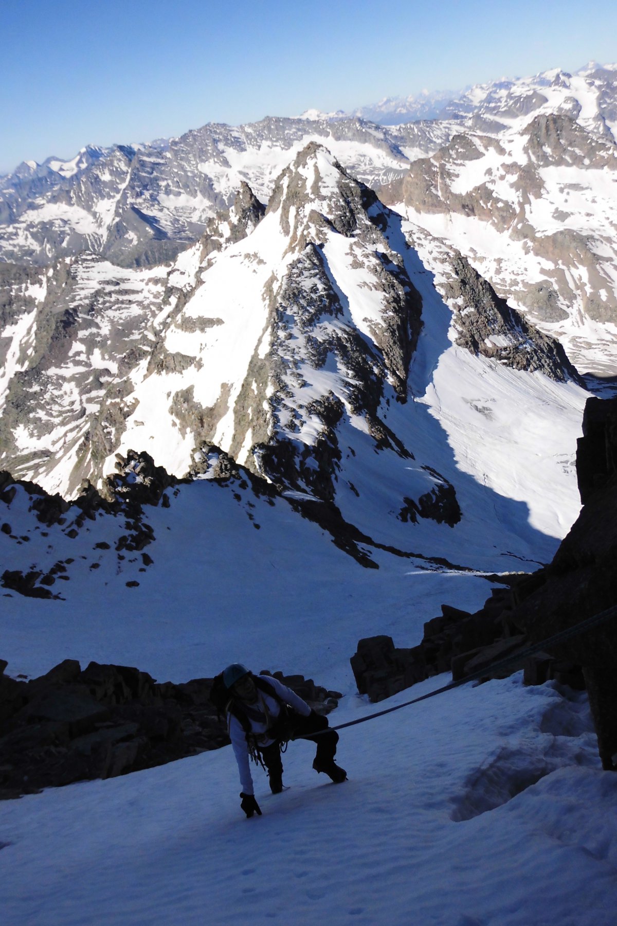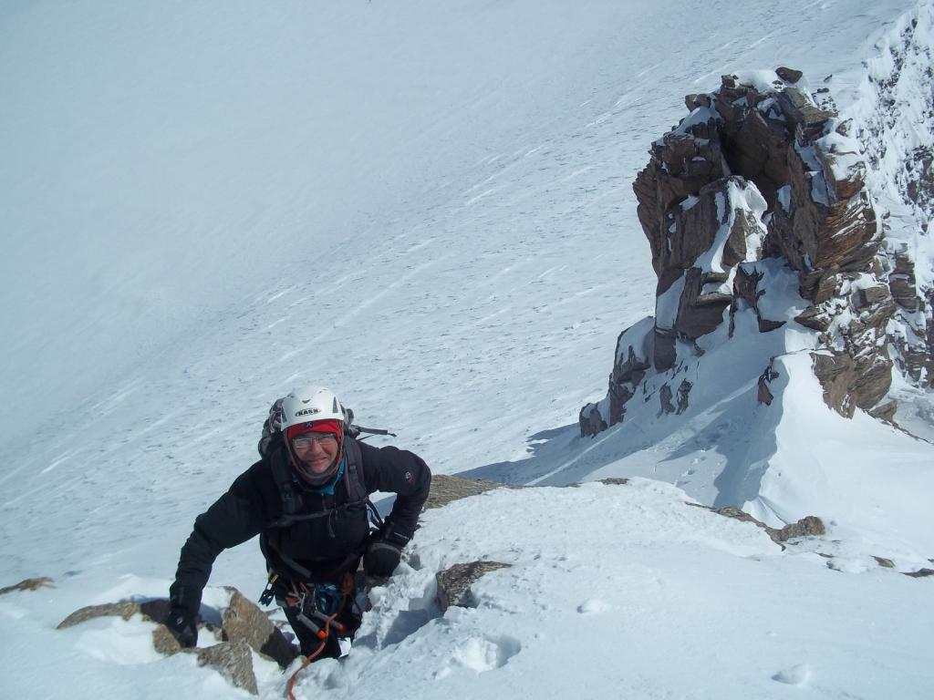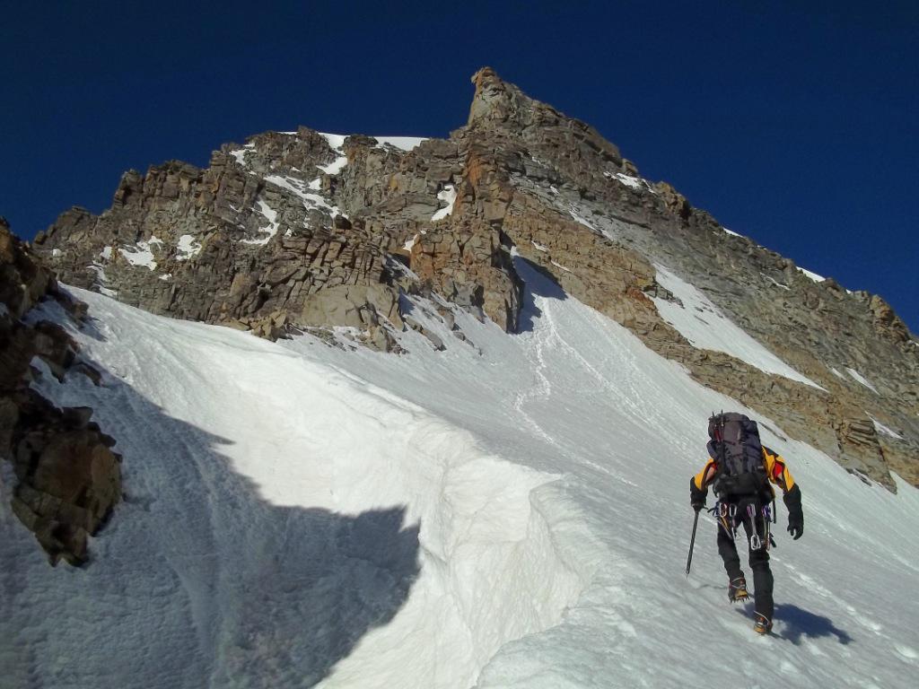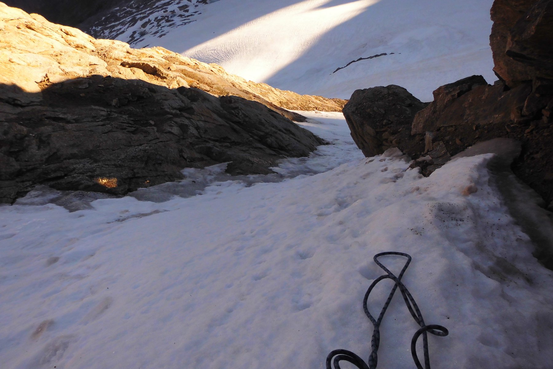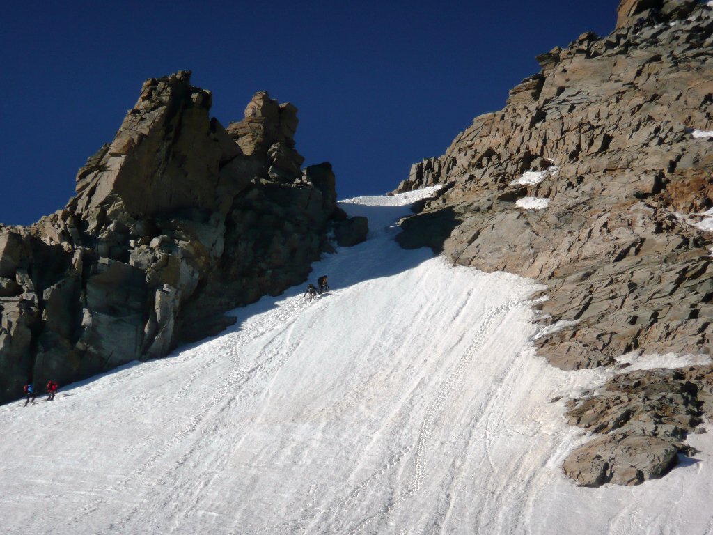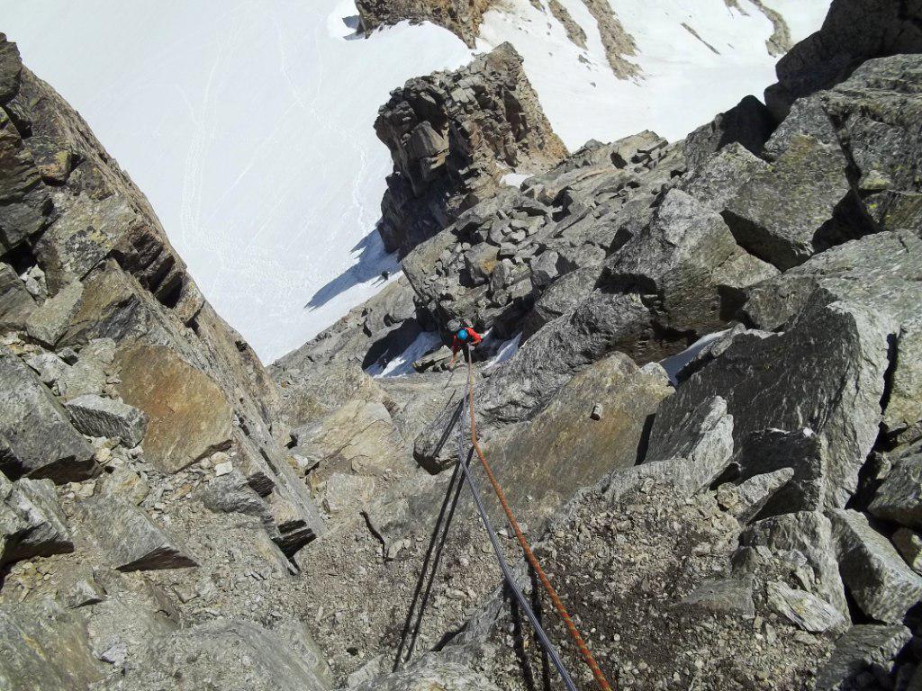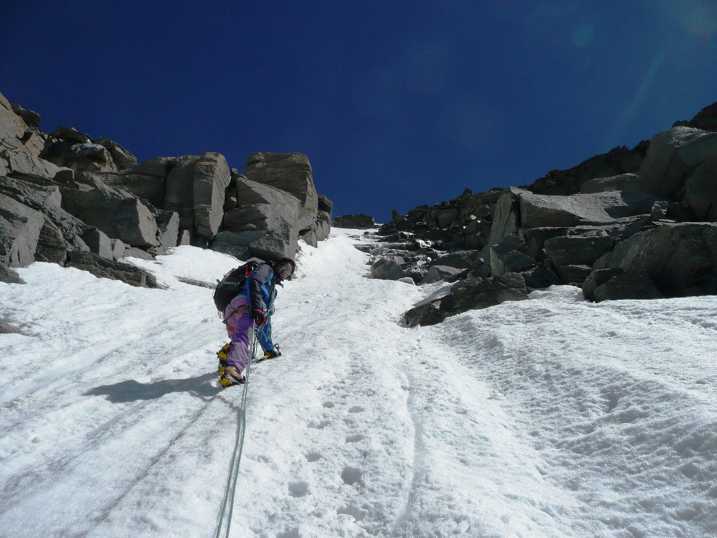 Dal colle dirigersi vero l’evidente cresta rocciosa restando sul lato N e raggiungerla per uno stretto e ripido imbuto di ghiaccio(corde fisse e soste) con un occhio di riguardo alle pietre mobili.