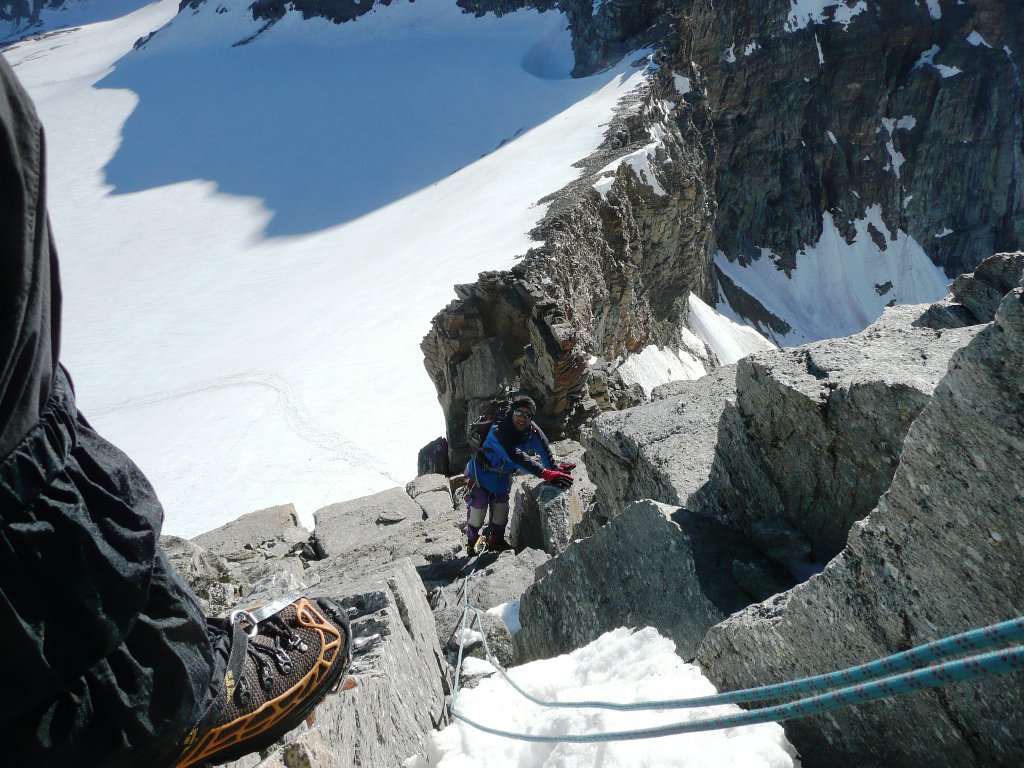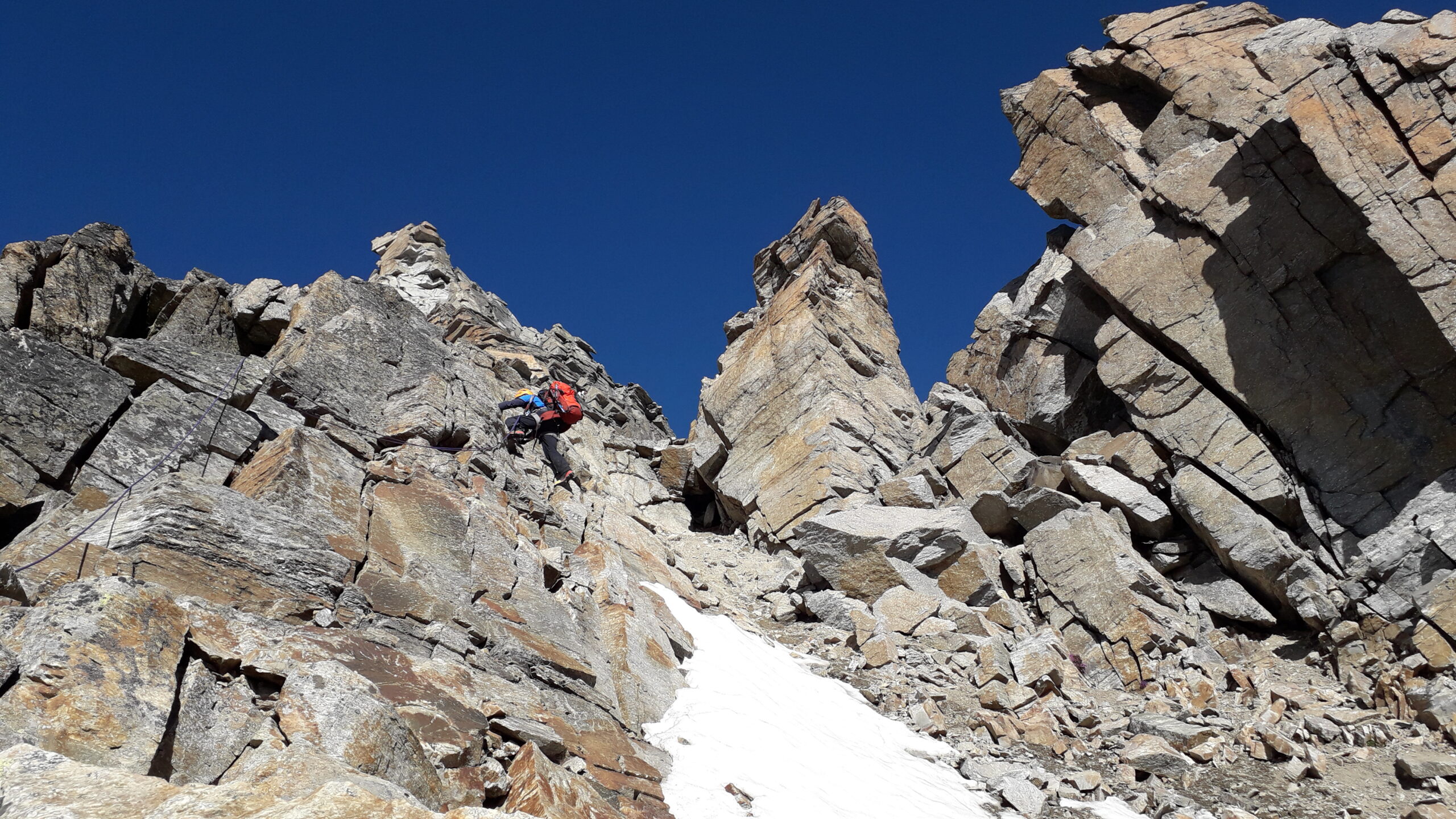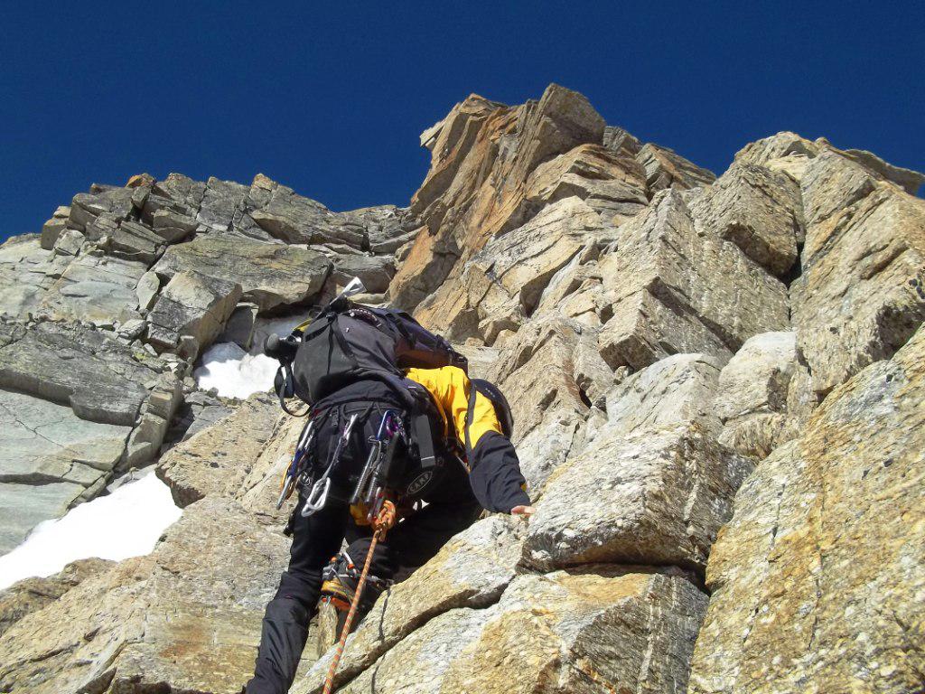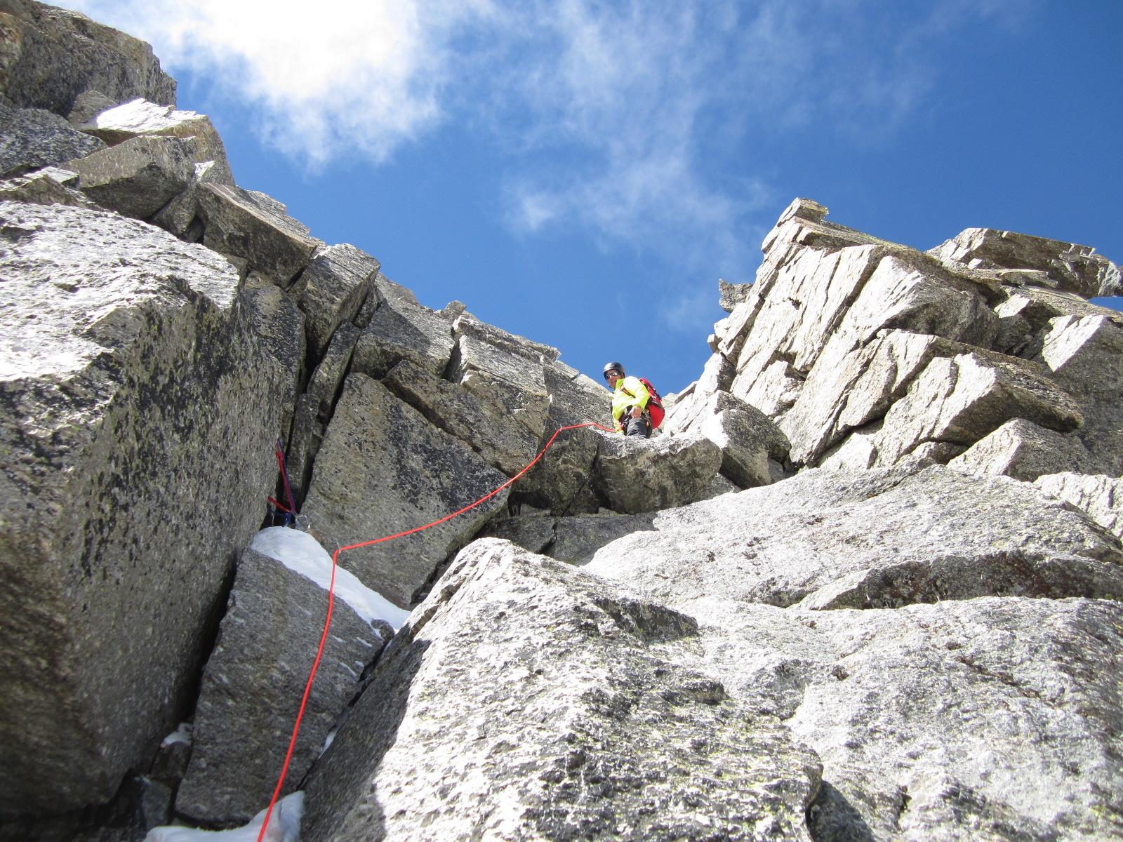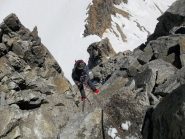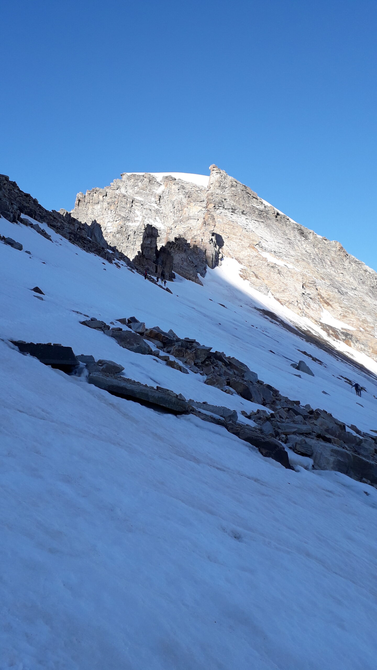 Dal colle dirigersi vero l’evidente cresta rocciosa restando sul lato N e raggiungerla per uno stretto e ripido imbuto di ghiaccio(corde fisse e soste) con un occhio di riguardo alle pietre mobili.