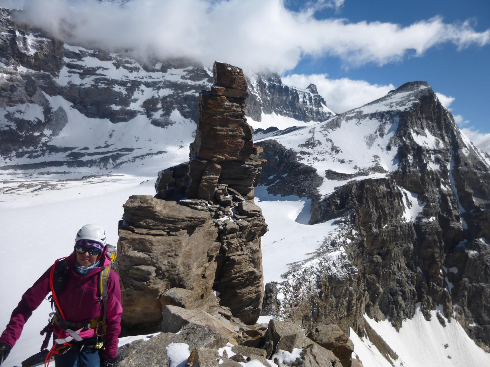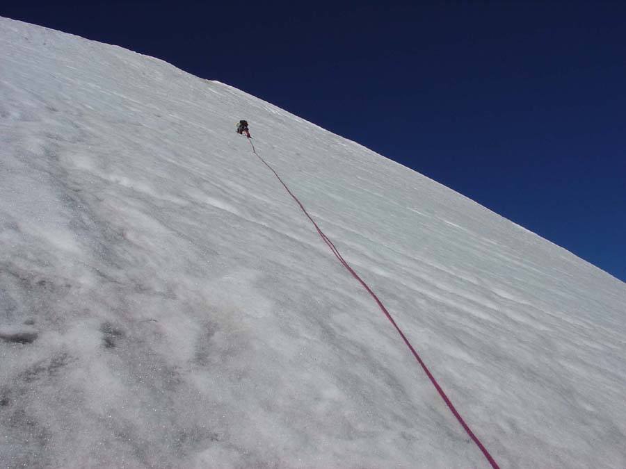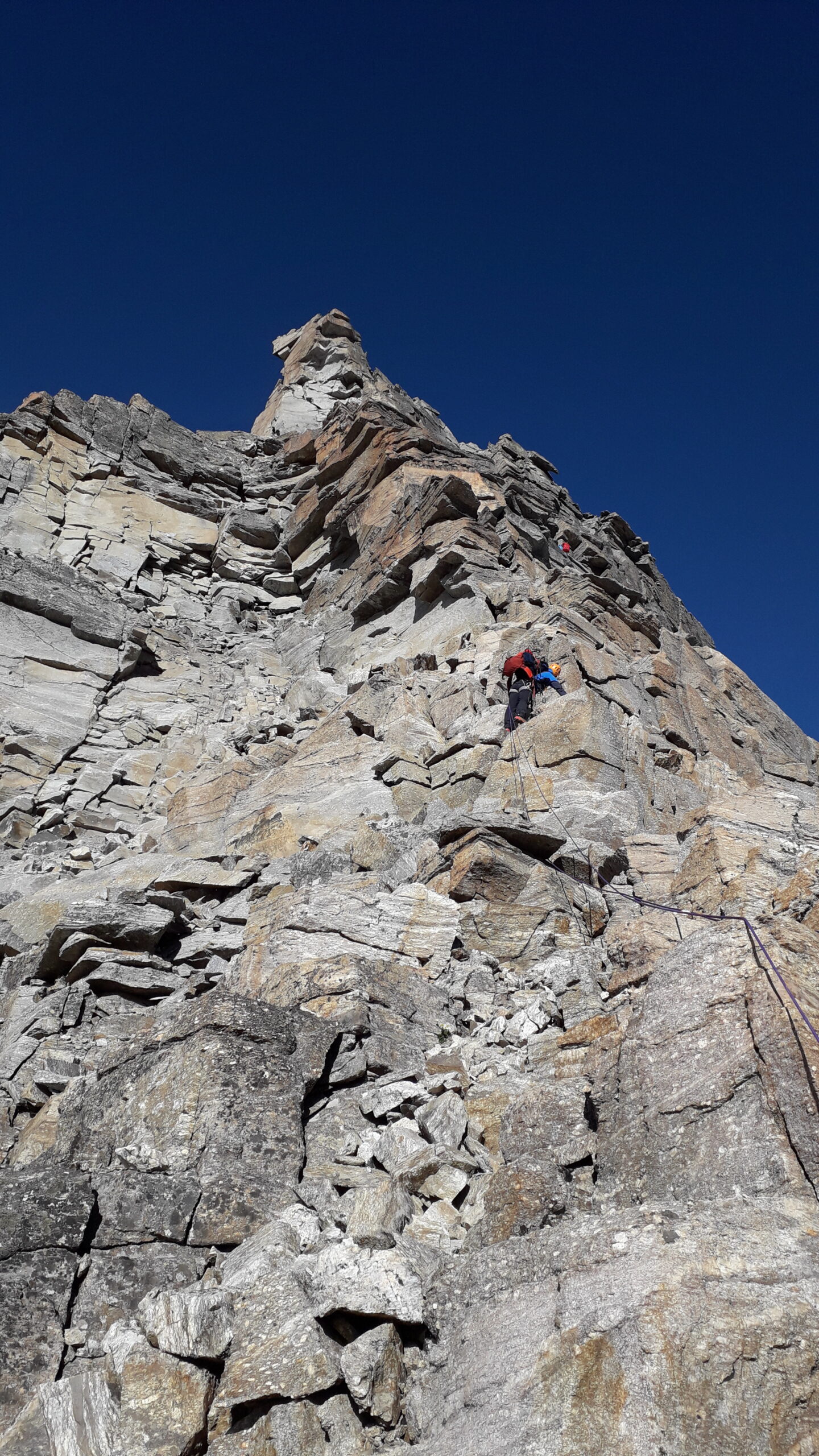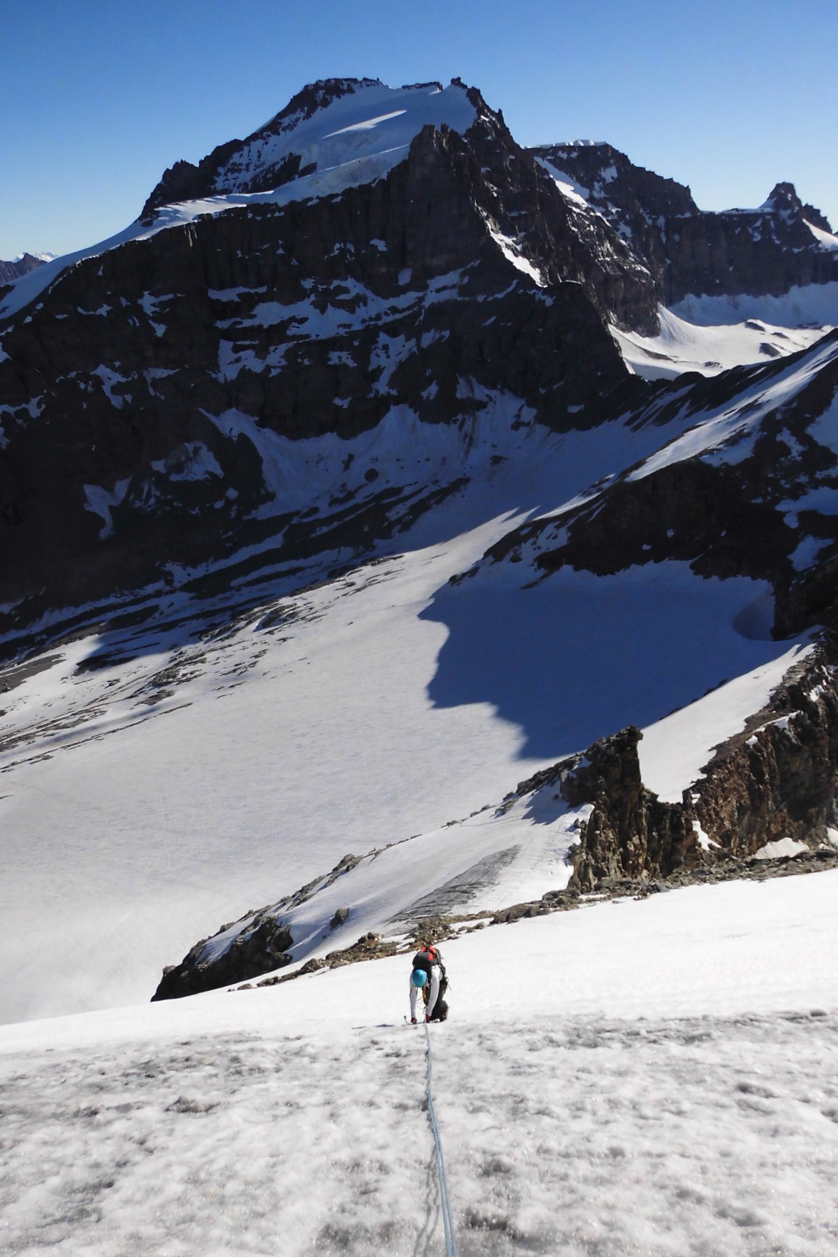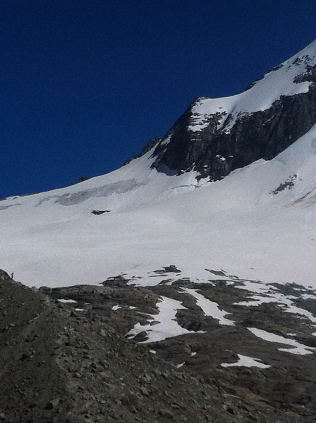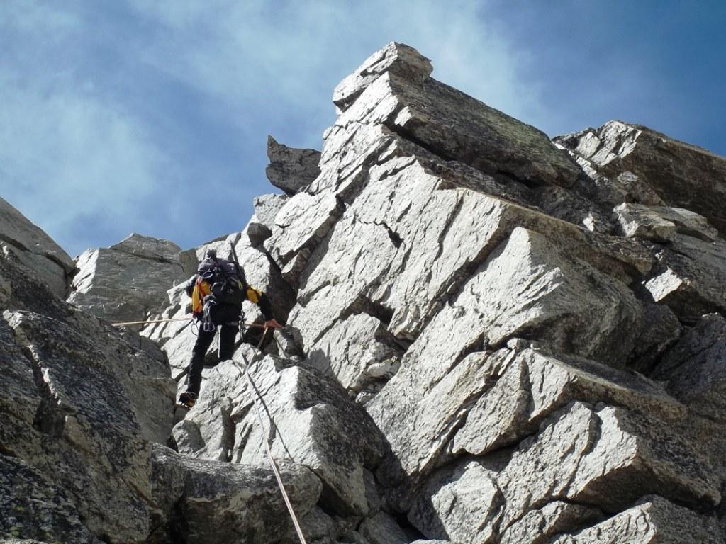 Dal colle dirigersi vero l’evidente cresta rocciosa restando sul lato N e raggiungerla per uno stretto e ripido imbuto di ghiaccio(corde fisse e soste) con un occhio di riguardo alle pietre mobili.