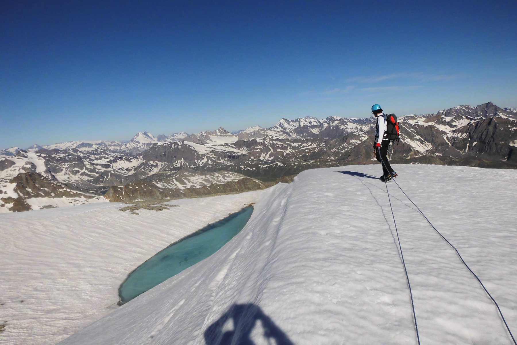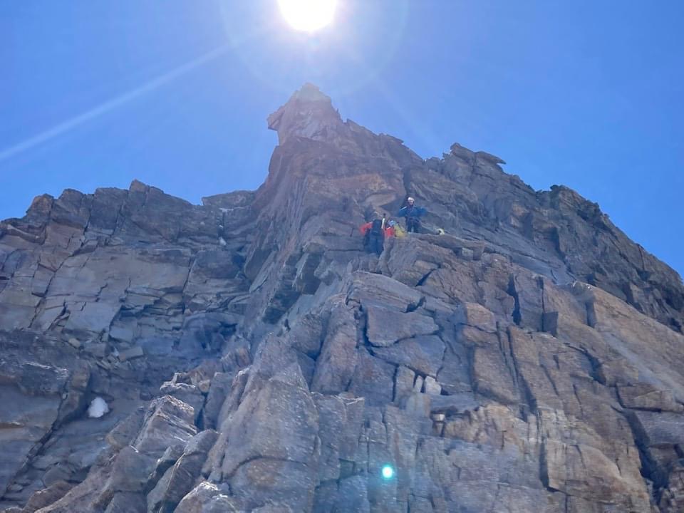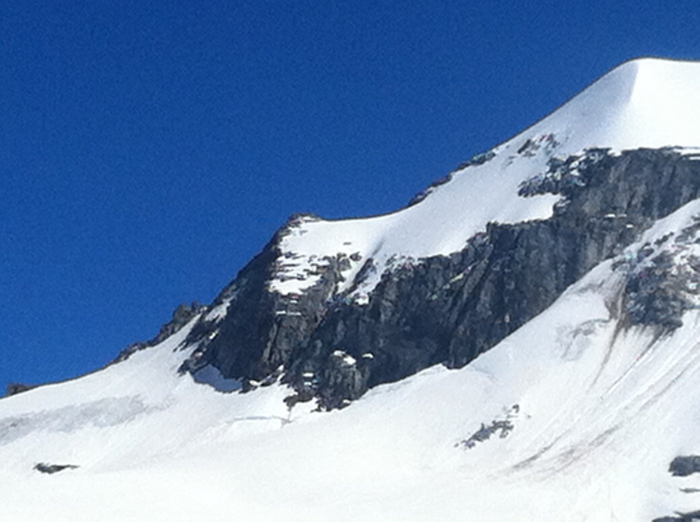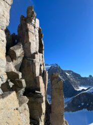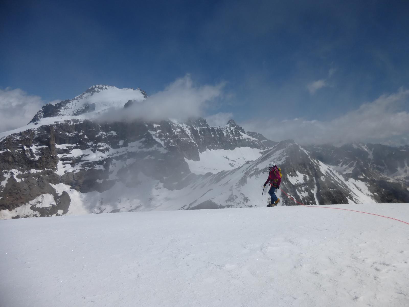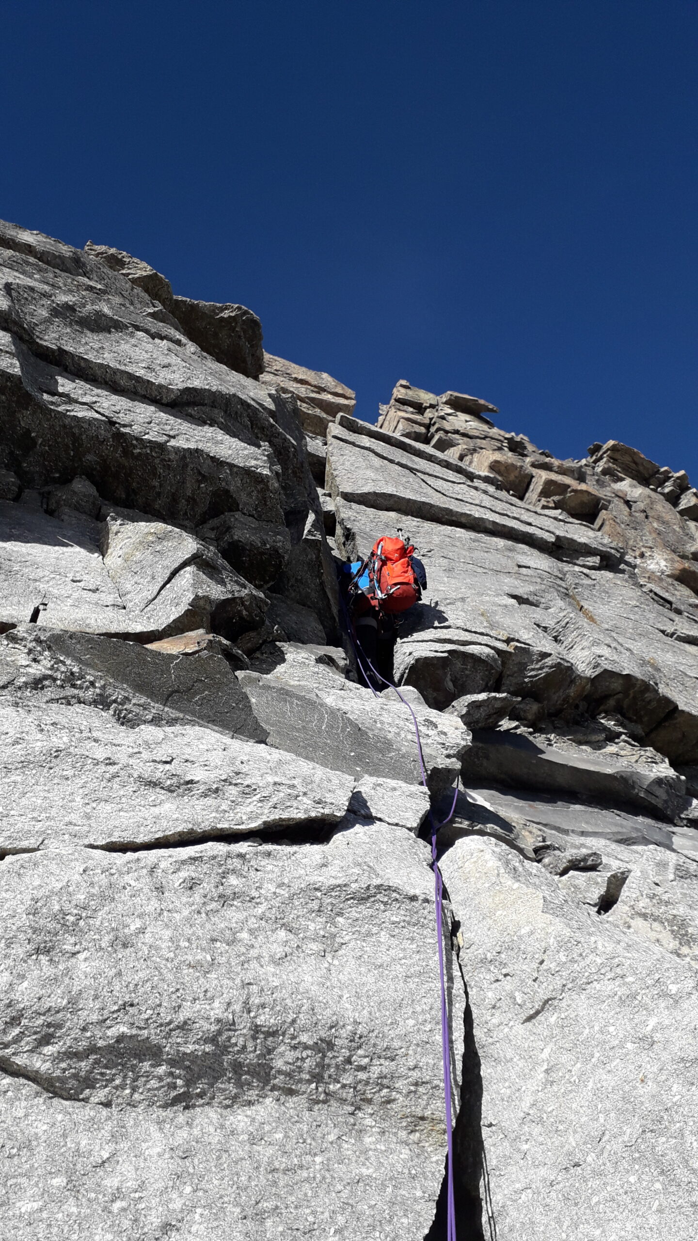 Dal colle dirigersi vero l’evidente cresta rocciosa restando sul lato N e raggiungerla per uno stretto e ripido imbuto di ghiaccio(corde fisse e soste) con un occhio di riguardo alle pietre mobili.