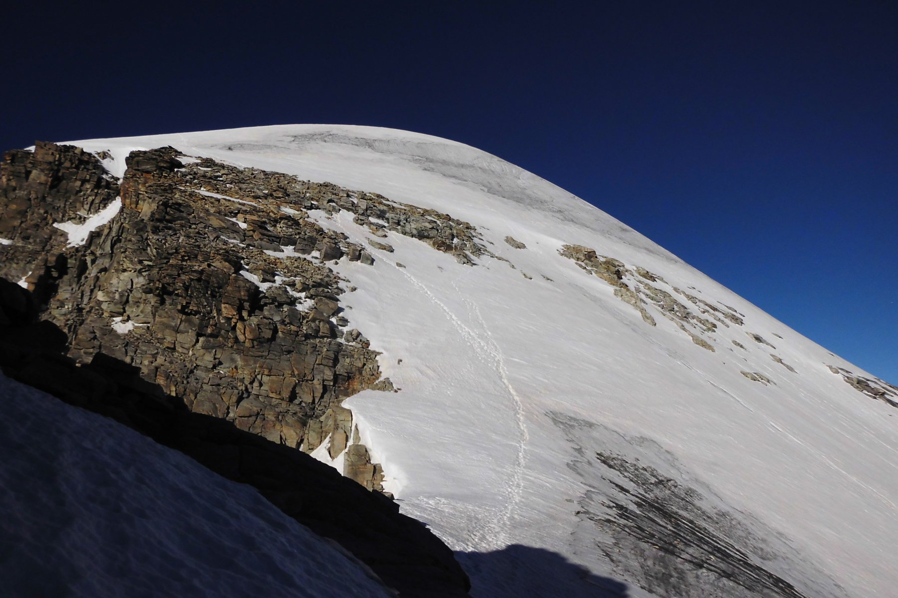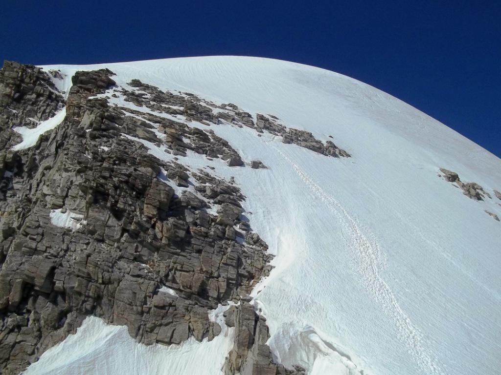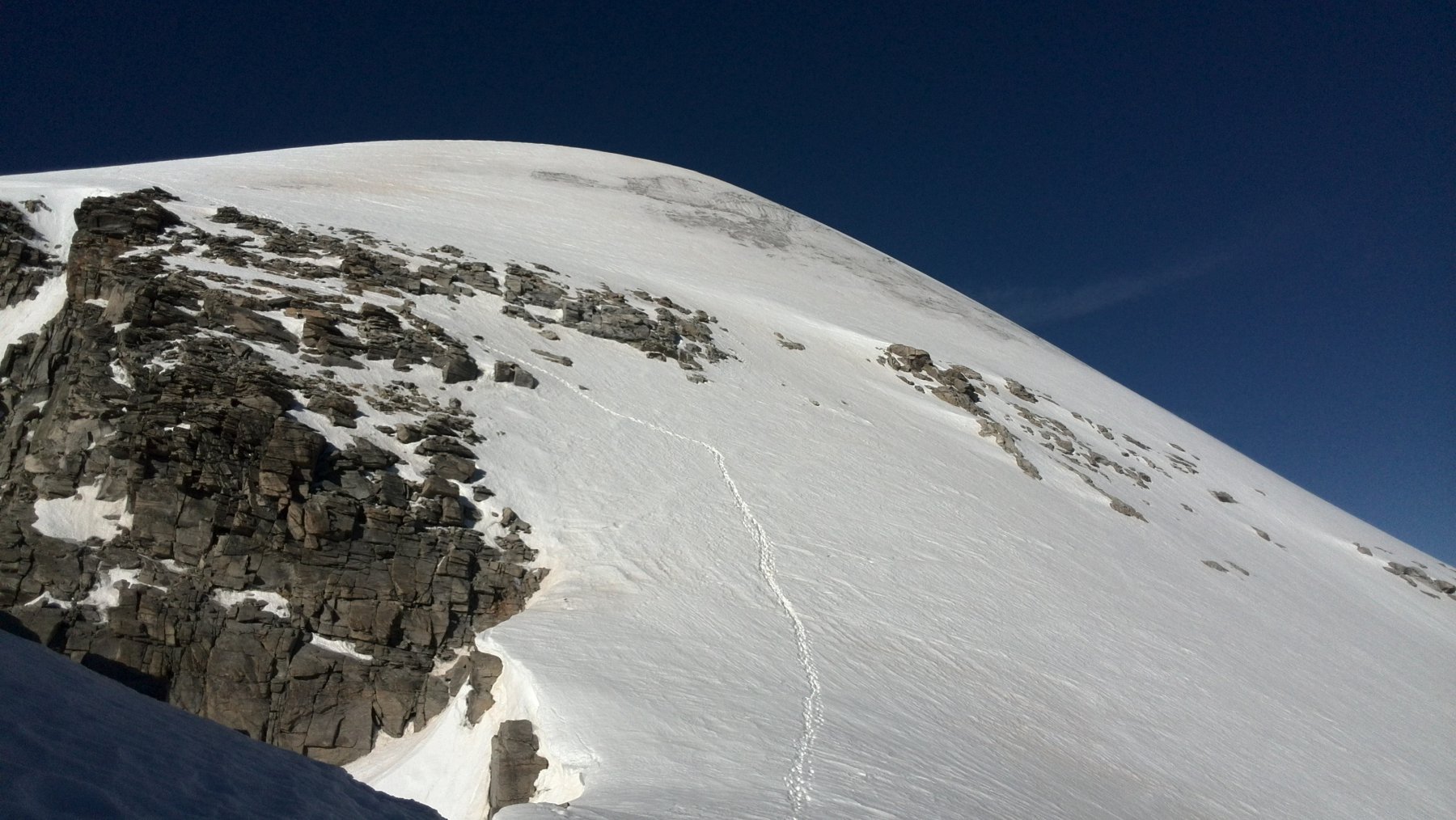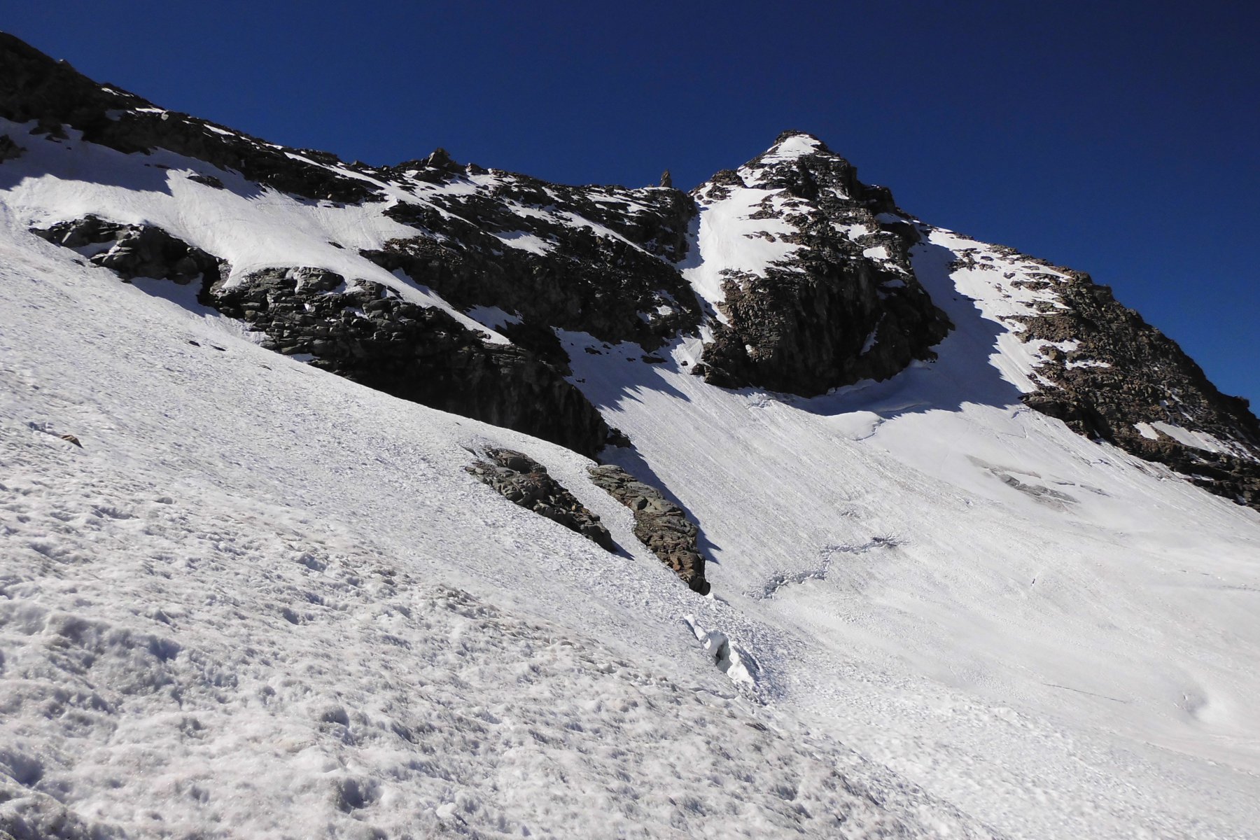 Volendo rendere più interessante la salita dal colletto dopo la bastionata rocciosa, spostarsi a destra e risalire al centro il pendio triangolare di solito ghiacciato, fino in vetta.
