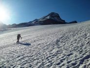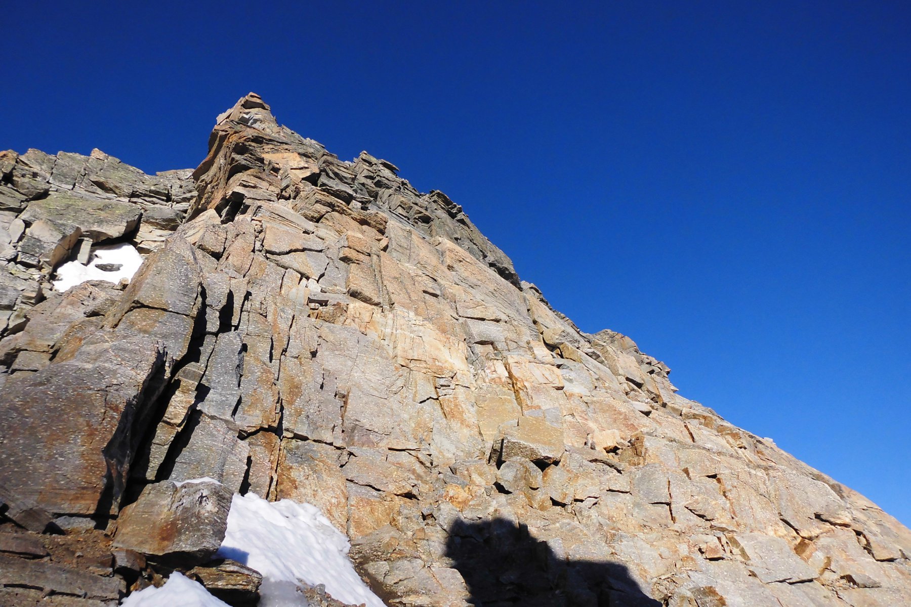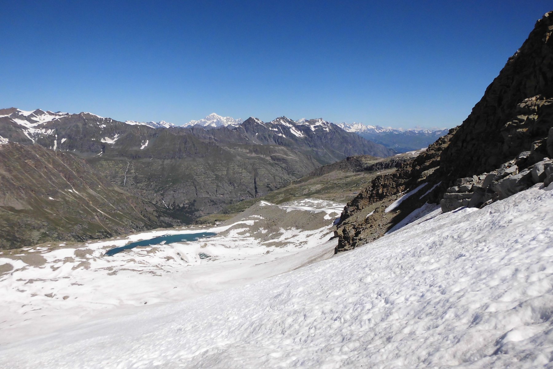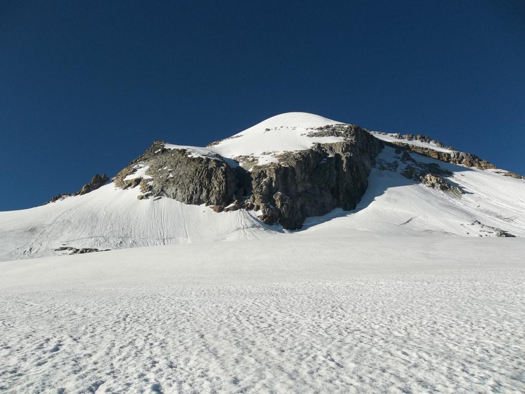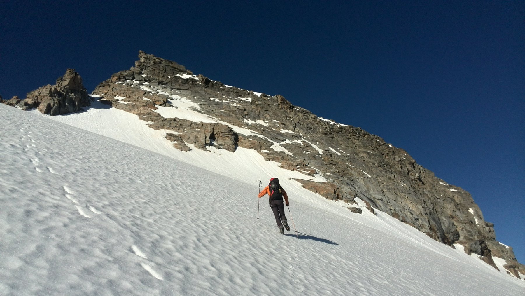 Volendo rendere più interessante la salita dal colletto dopo la bastionata rocciosa, spostarsi a destra e risalire al centro il pendio triangolare di solito ghiacciato, fino in vetta.