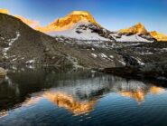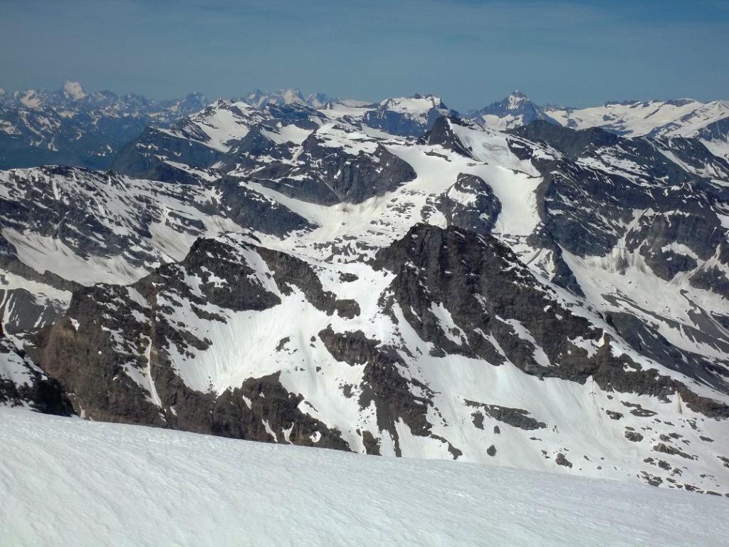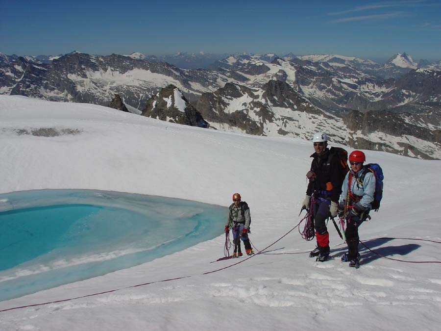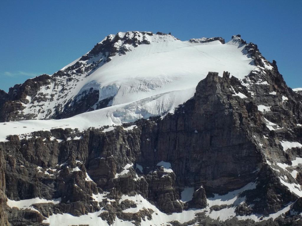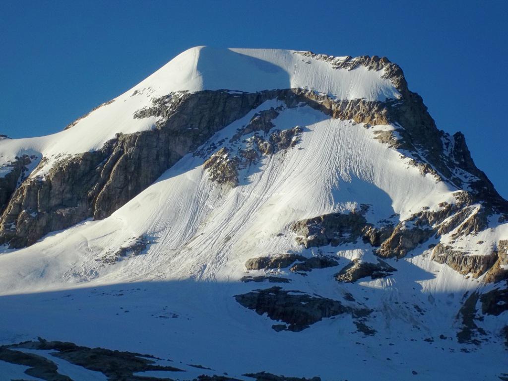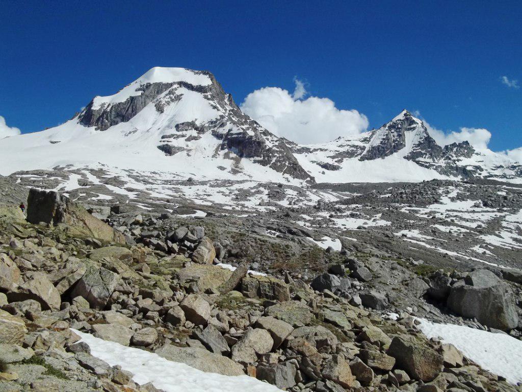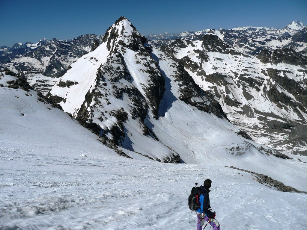 Volendo rendere più interessante la salita dal colletto dopo la bastionata rocciosa, spostarsi a destra e risalire al centro il pendio triangolare di solito ghiacciato, fino in vetta.