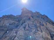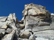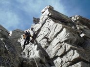 Dal colletto a quota 3400 salire sul filo della cresta quindi sul lato N per rocce con passaggi fino al III brevi. Soste lungo il percorso.