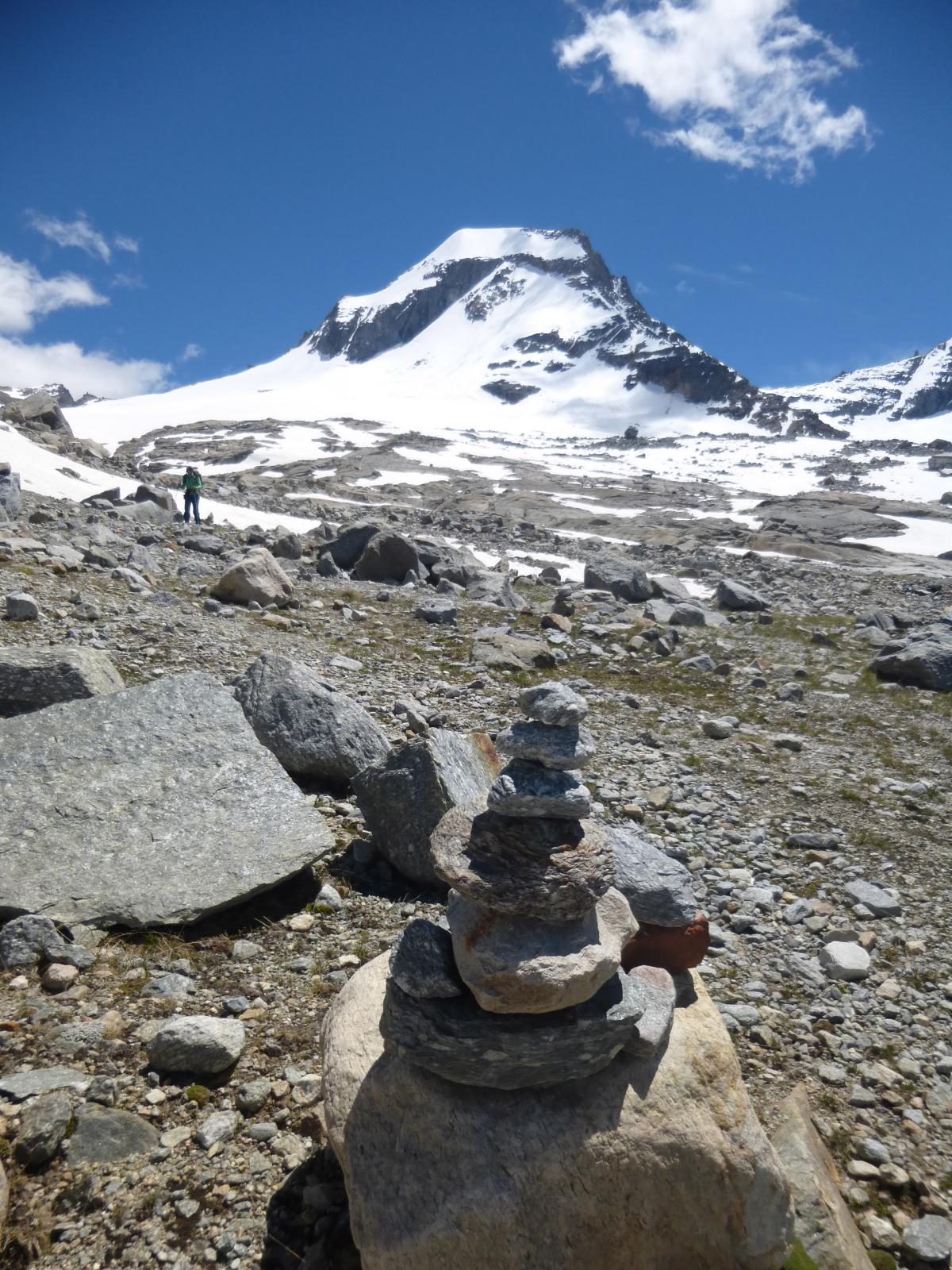 Da qui risalire la ripida morena che sovrasta il lago e entrare nel vallone che porta al colle del Gran Paradiso. Una volta in piano dietro la cima della morena proseguire su buona traccia per circa 200m e reperire una traccia(ometti) che scende a dx verso il fronte del ghiacciaio di Montcorvè. A quota 2900m circa.