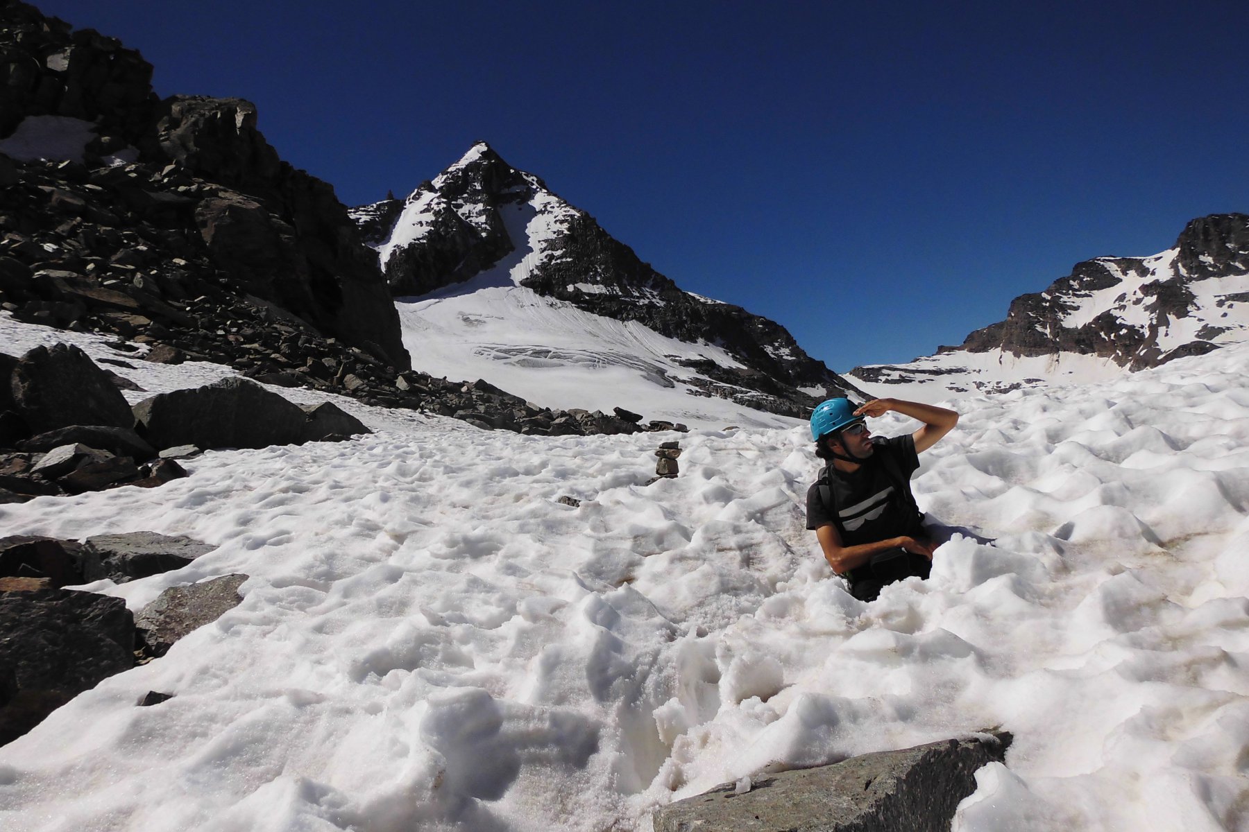 Risalire il ghiacciaio verso l’evidente colle del Ciarforon eventualmente effettuando un lungo diagonale a sx se il pendio sotto il colle risulta molto ghiacciato.