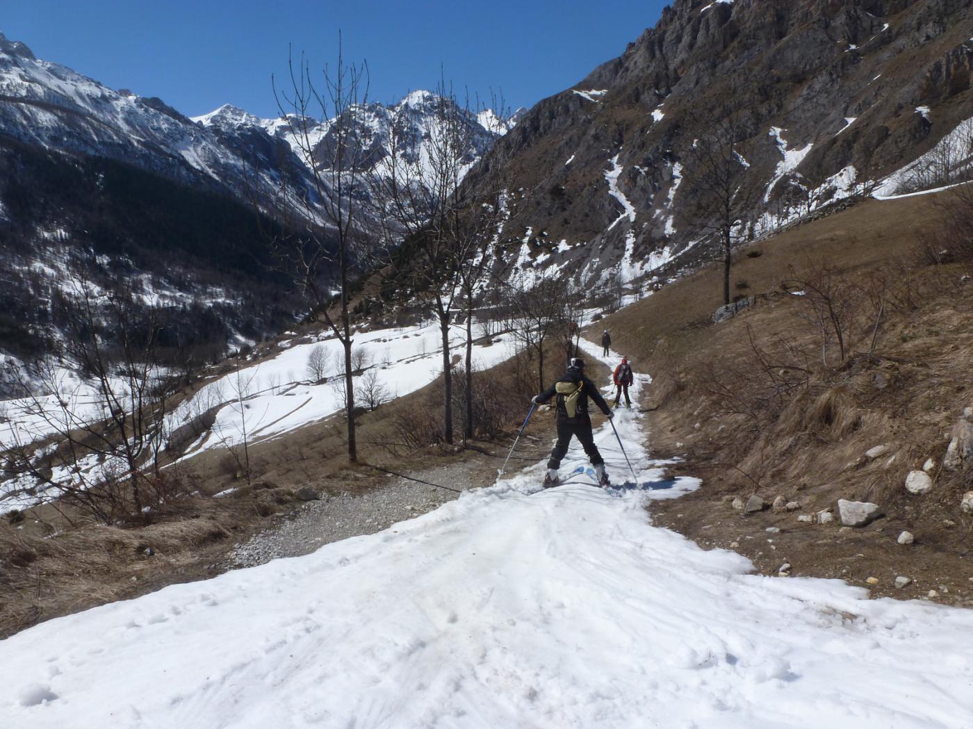 Premetto che la neve a 1500m è solo sulla strada che permette comunque di raggiungere sci ai piedi l’anfiteatro superiore da dove è continua, in salita e con alcuni gava e buta anche di scendere fino a Lausetto. Il vento c’è stato, ma in misura moderata su questo percorso. La giornata era spettacolare e la discesa meno peggio del previsto. Parte alta abbastanza portante, parte bassa molle, ma non sfondosa. Da 1700m in giù sulla strada con appunto alcune interruzioni che aumenteranno nei prossimi giorni.