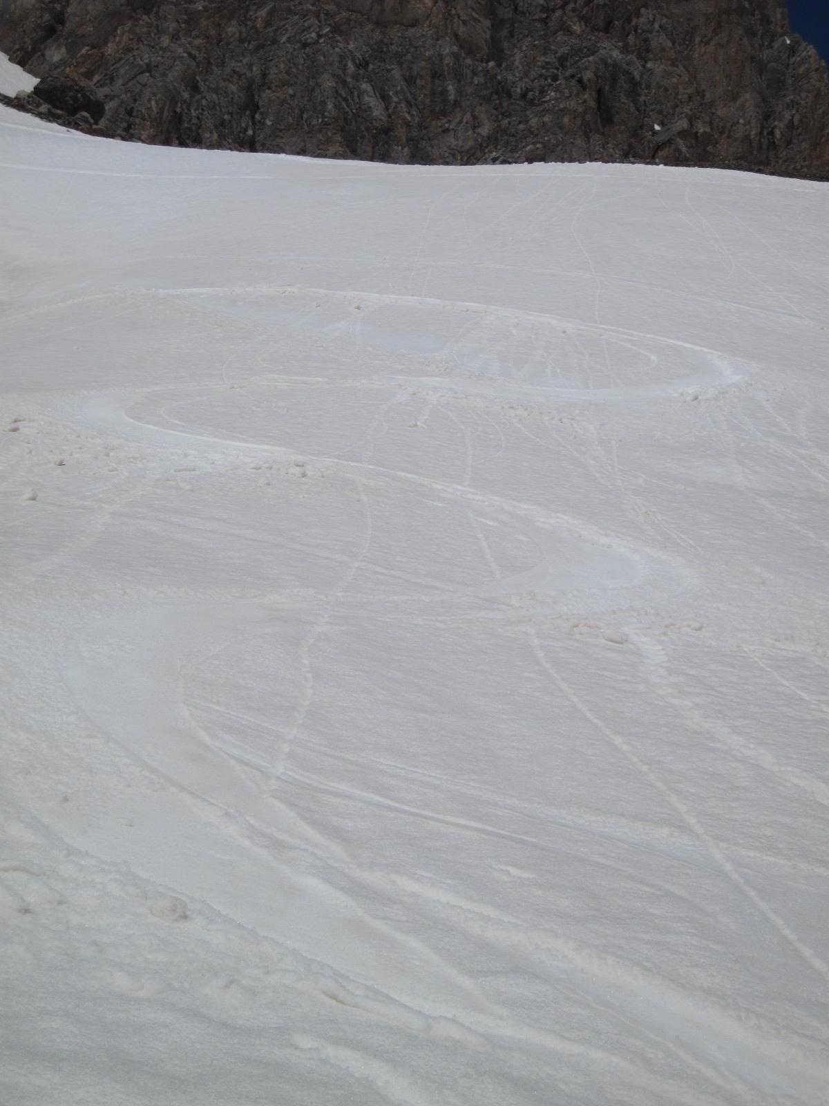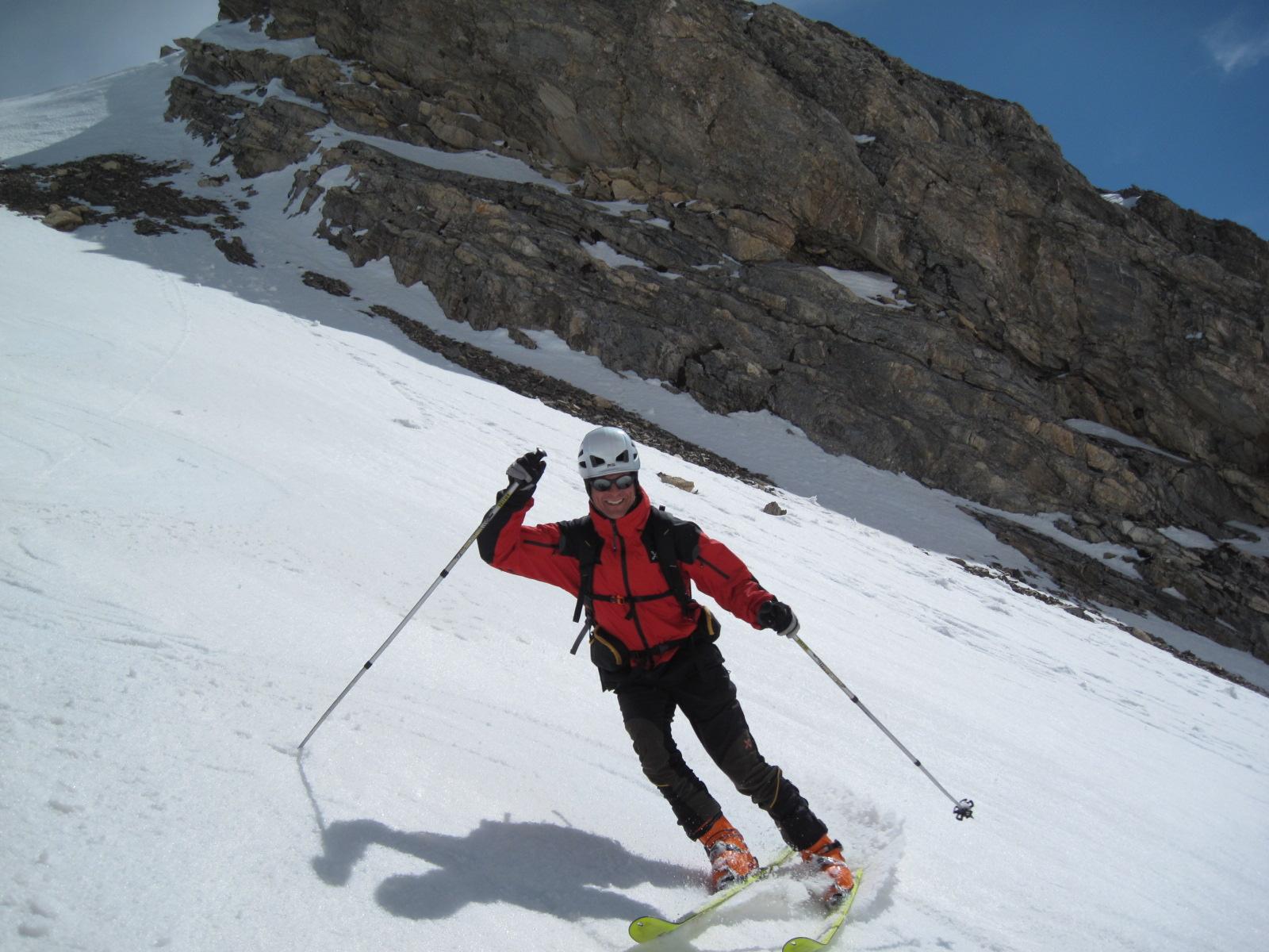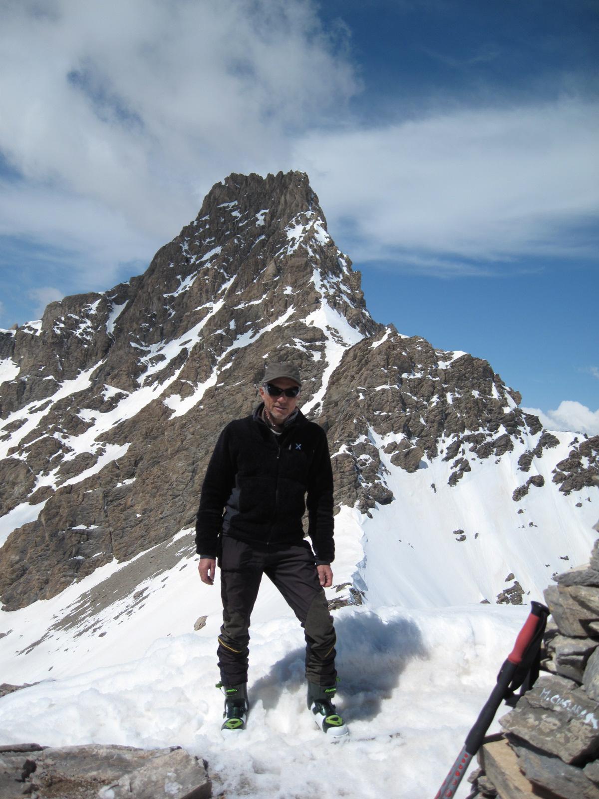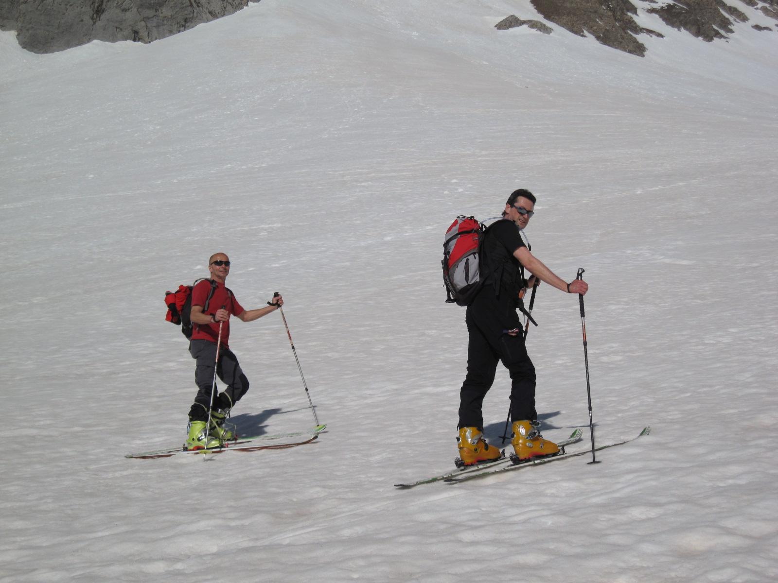 Cinque minuti di portage e si calzano gli sci, poi neve continua fino a 20 metri dalla vetta (ultimo tratto fare attenzione perchè ripido e ghiacciato). Giornata decisamente calda e cielo terso, solo qualche nuvola in lontananza. In salita nessun problema, nel canale terminale sono necessari i coltelli. In discesa è un compromesso; se si aspetta (discesa verso le 12:30 – 1:00) si trova la neve bella nel canale in alto e pesante sotto, se si scende subito (circa le 11:) in alto è ancora ghiacciata ma magari e meglio sotto. Noi abbiamo aspettato e in alto era uno spasso, sotto un po’ pesante ma tutta sciabile. Gita in un ambiente di severa bellezza, il panorama dalla vetta è strepitoso, tutti i 3000 della alta val Maira più quelli del vallone di Bellino (val Varaita) e tanti altri a perdita d’occhio.