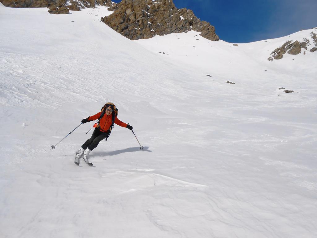 Partenza dall’auto con 10°C e vento, la neve inizia dal tornante appena dopo il ponte; nel vallone Infernetto calma di vento e neve marcetta sino a 2300, poi temperatura più fresca e buona crosta portante; pendio finale su crosta superficiale decisamente dura (saliti contro le roccette alla dx.orogr., in centro pendio qualche placca a vento). Tratto finale dal colle alla cima a piedi (vento moderato in cima).