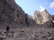 A questo punto è meglio abbandonare il solco sempre più sconvolto dalla frane e colmo di detriti,per appoggiarsi alla grande bancata di rocce detritiche sul fianco sx.Mediante una cengetta si rimontano buone roccette scalinate,un pò obliquando verso sx,come d’altronde tende lo stesso canale (1° grado).
