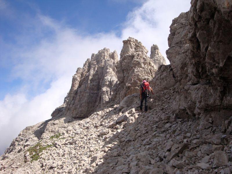 Poco prima della Forcella , proprio alla base della Torre e del suo satellite Campanile Irma, si accede verso sx al logico cengione diagonale, scartando di qua e di là le curiose merlature della cresta.