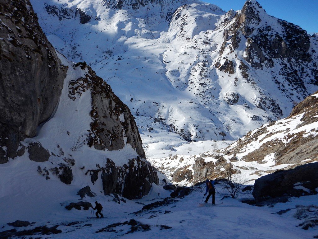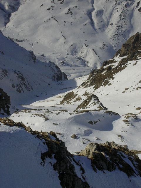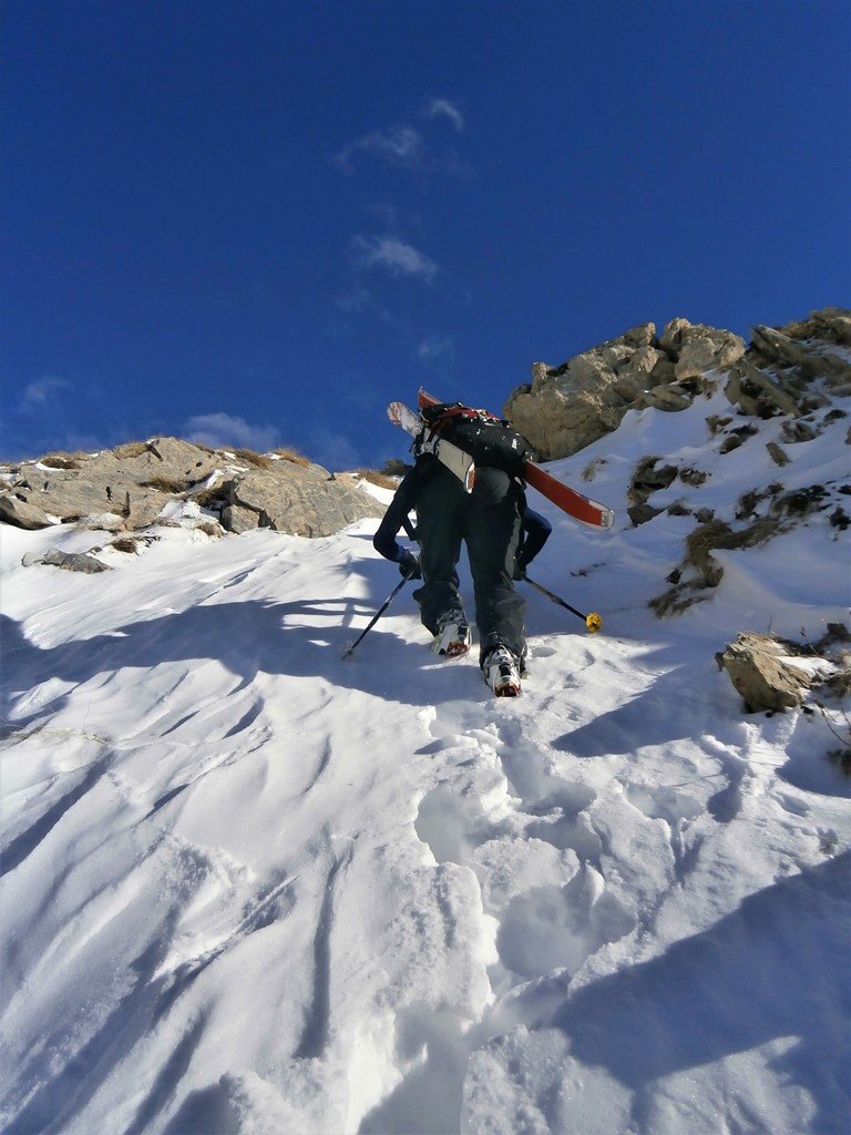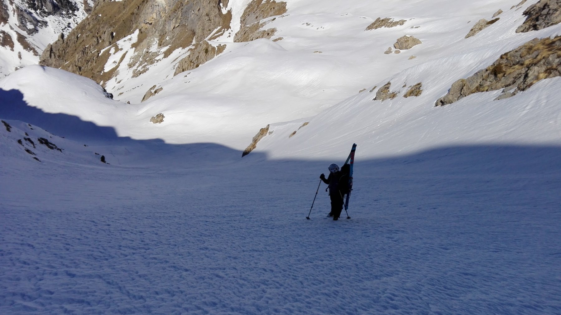 Si sale un centinaio di metri e si perviene a un pianoro dal quale si vede il canale che permette di accedere a un secondo pianoro dal quale si accede al pendio finale.